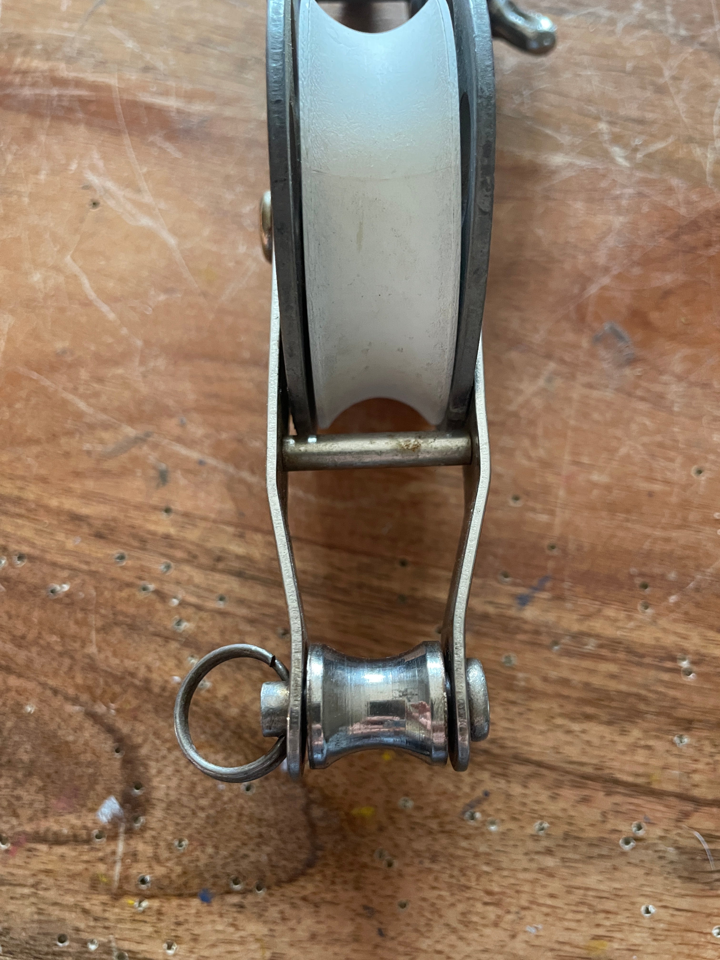 This Schaefer fixed single block is in great condition. The block has a 2 1/2” sheave and can fit MAX 9/16” line diameter. This block has a Beckett at the base with a ss roller. Also included is a stainless steel shackle, this shackle has a 5/8” width. Total length of this block from top of shackle to bottom of Beckett is 7 1/2”.