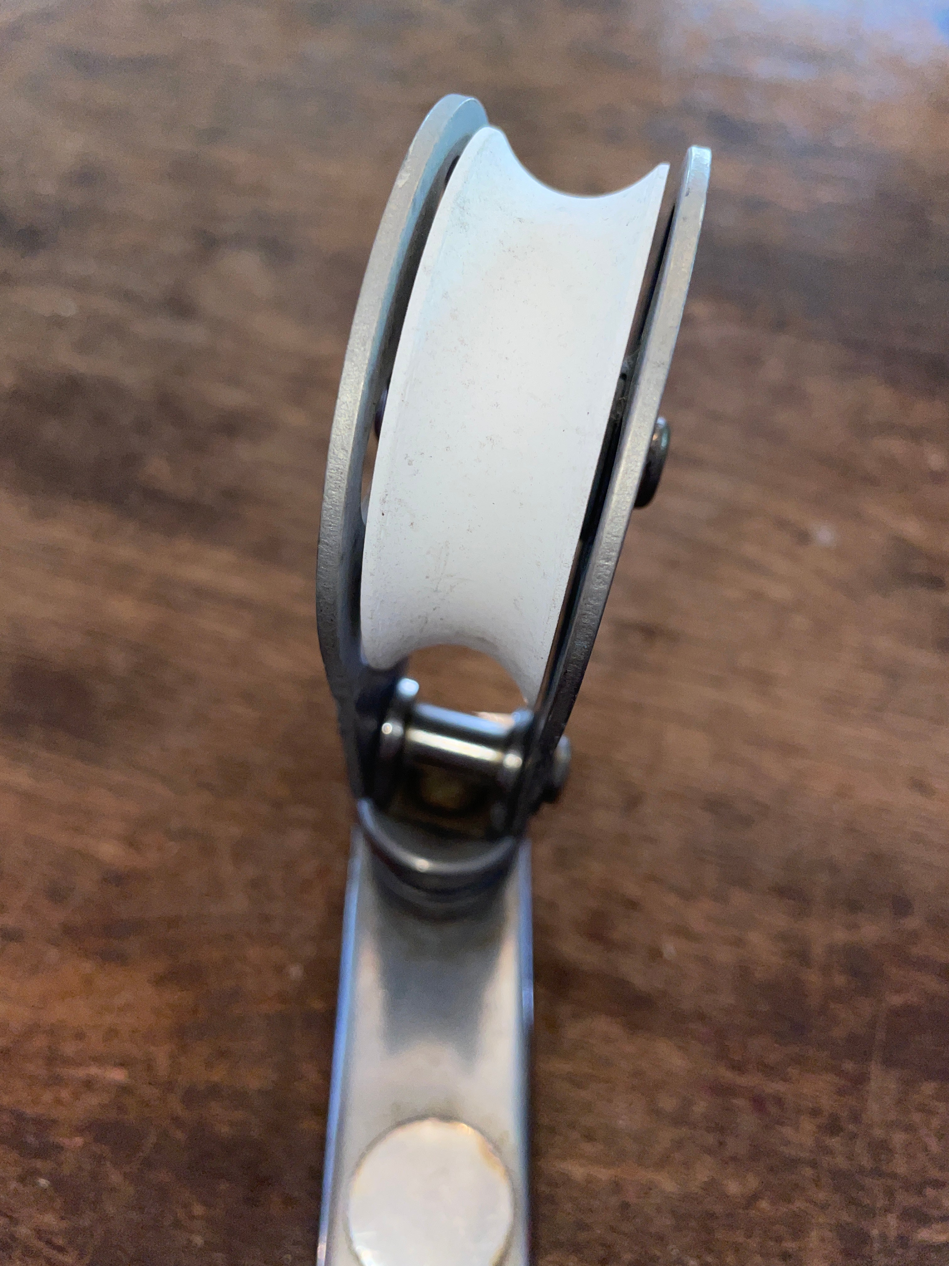 Good Used Condition Schaefer Spring Loaded Single Block With A Screw Top 1” Track Car. The Sheave Of Block Is 2 1/2”. Total Block Length Is 4”. Plastic Wheel In Great Condition. The 1” Track Car Is 4” Long x 1/8" thickness for a track. Overall The Block And Track Car Stand 5” Tall. Sheave has some slight signs of wear started but overall. good condition. For the track car it is 1" wide and fits a 1/8" thickness.