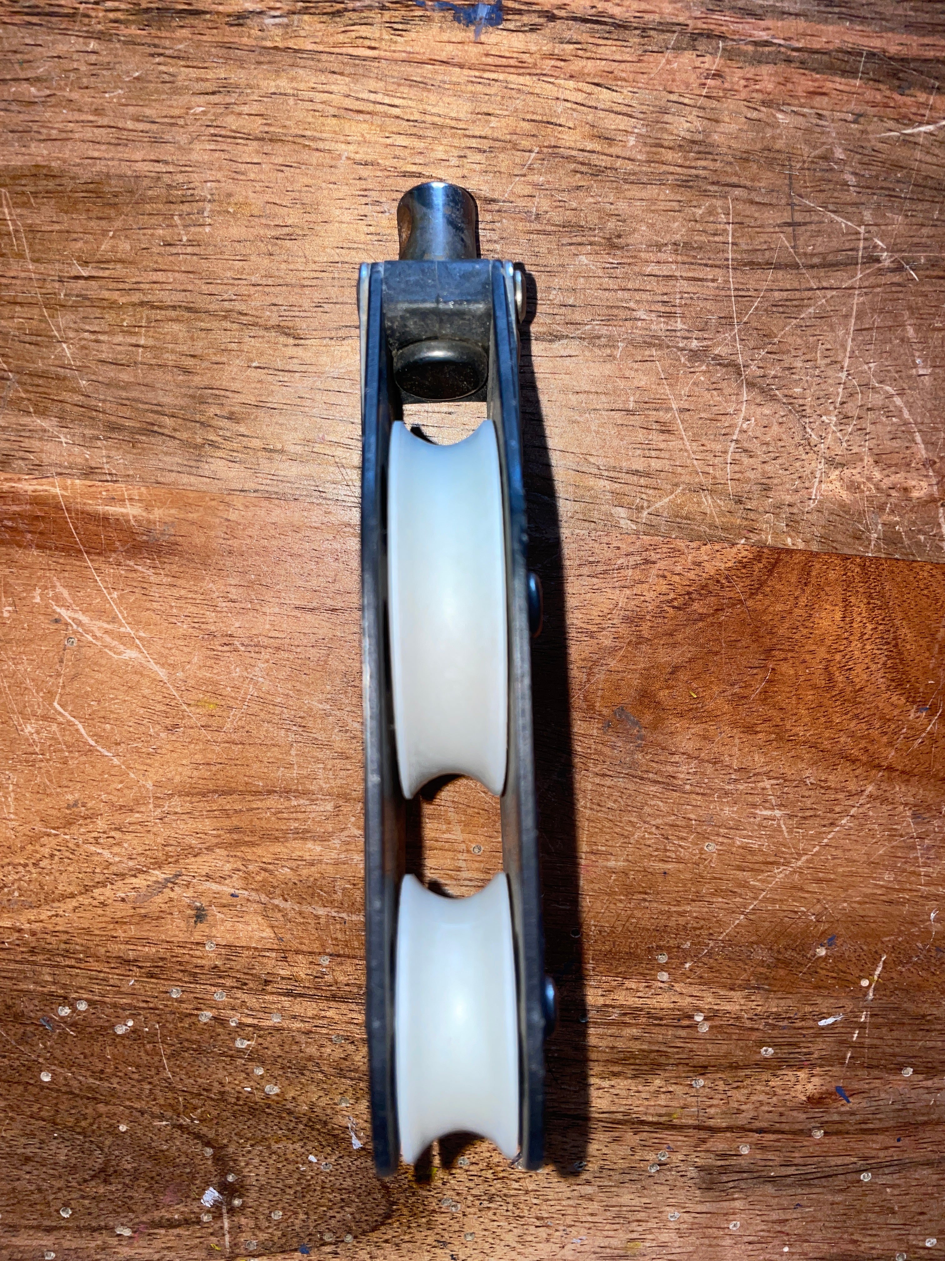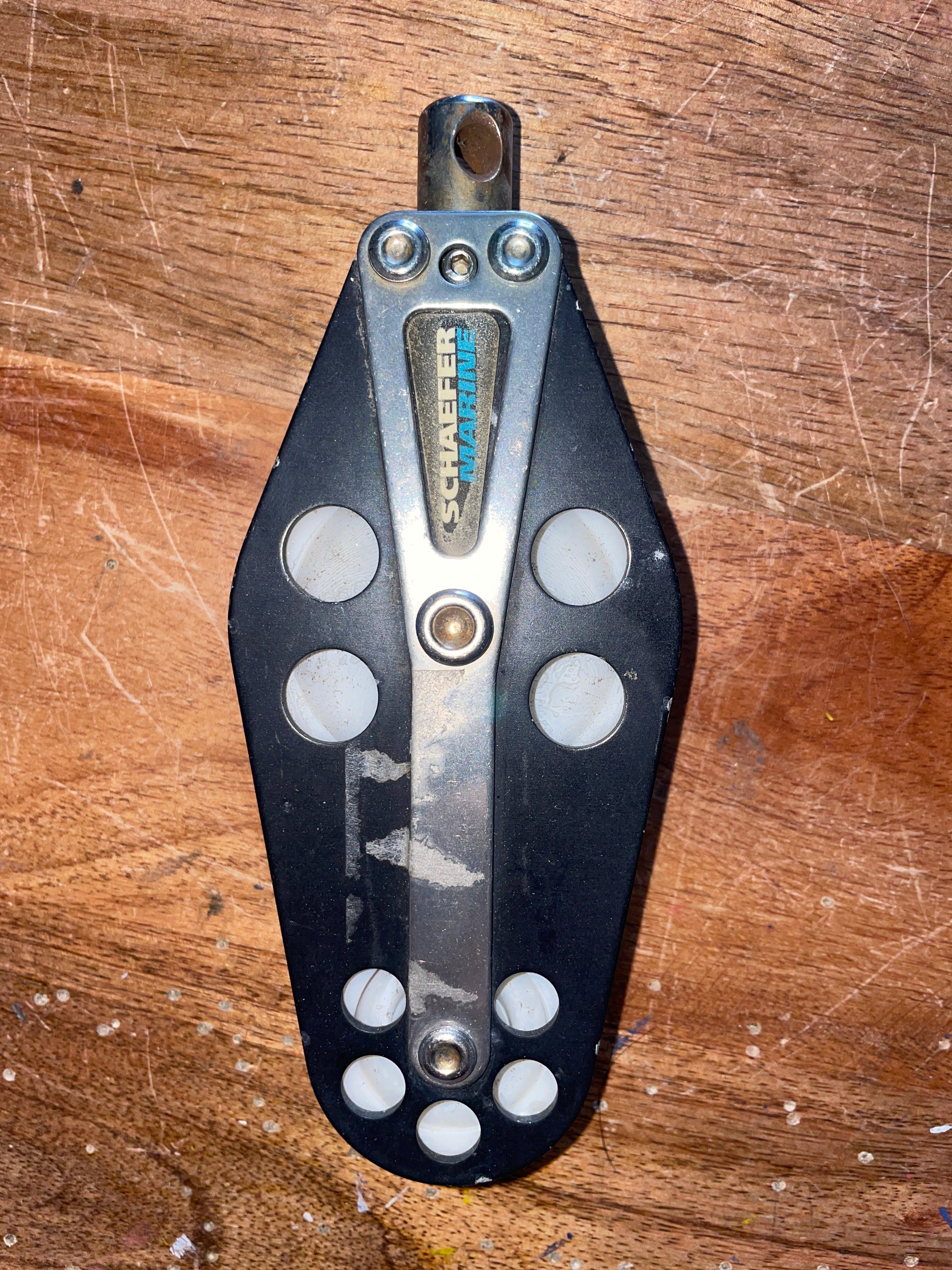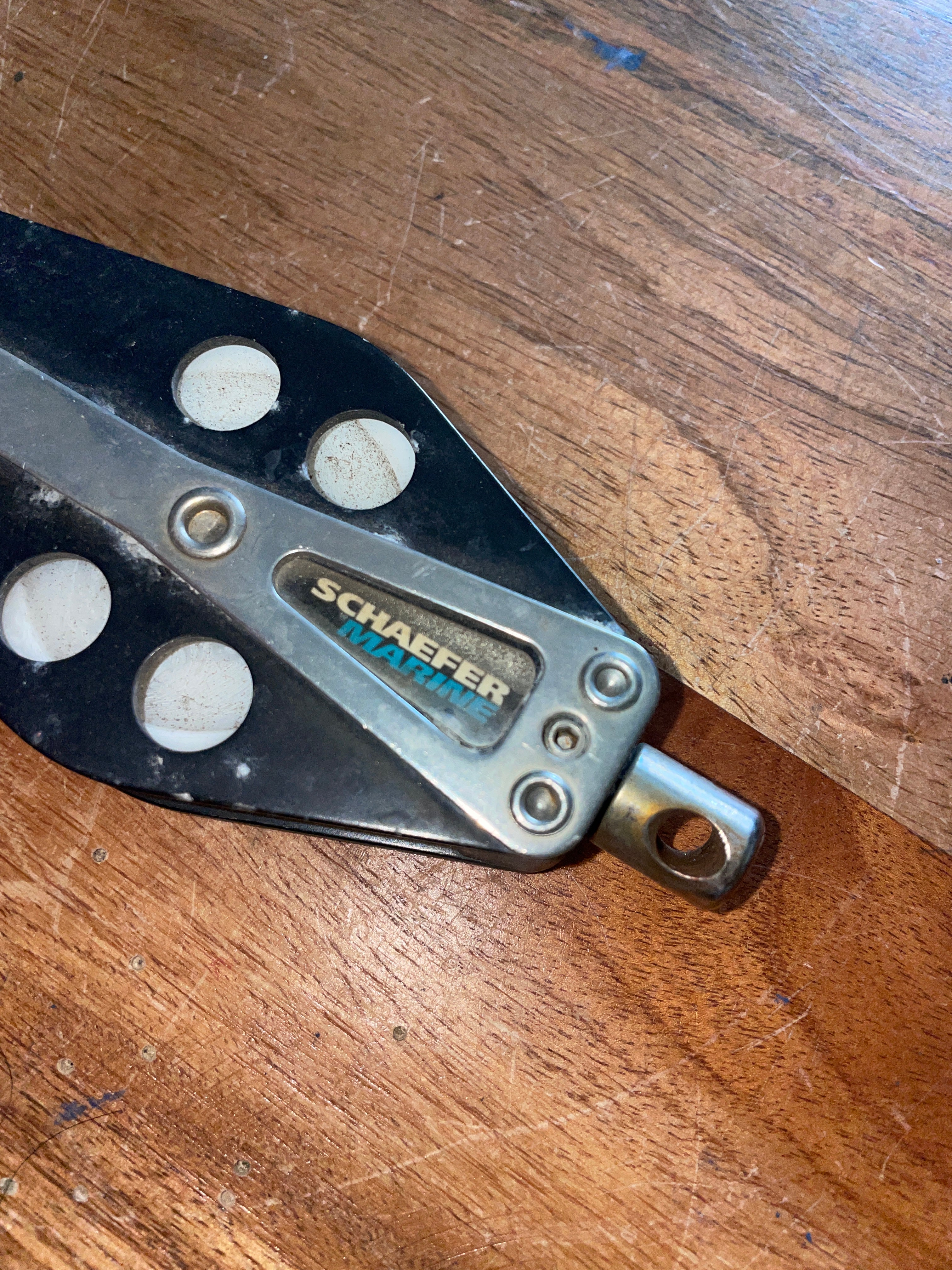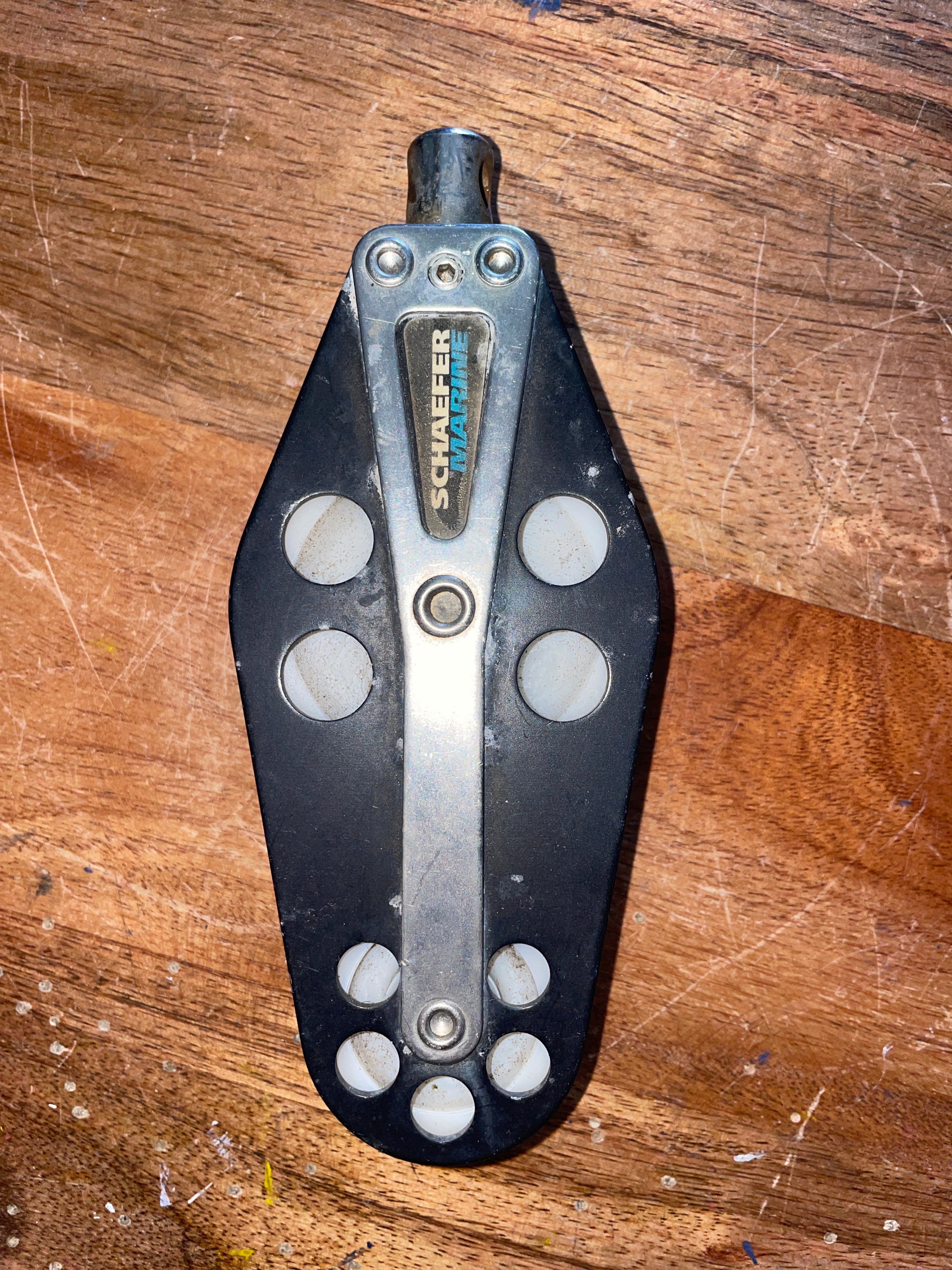 This Schaefer swivel fiddle is great condition. The body is metal and has usual signs of wear from use with the plastic sheaves. The larger sheave is 2 1/4” and the smaller is 1 3/8”. Can fit MAX 3/8” line diameter. The area at the top for a shackle works for a 3/16” pin. Total length of this block is 6”.