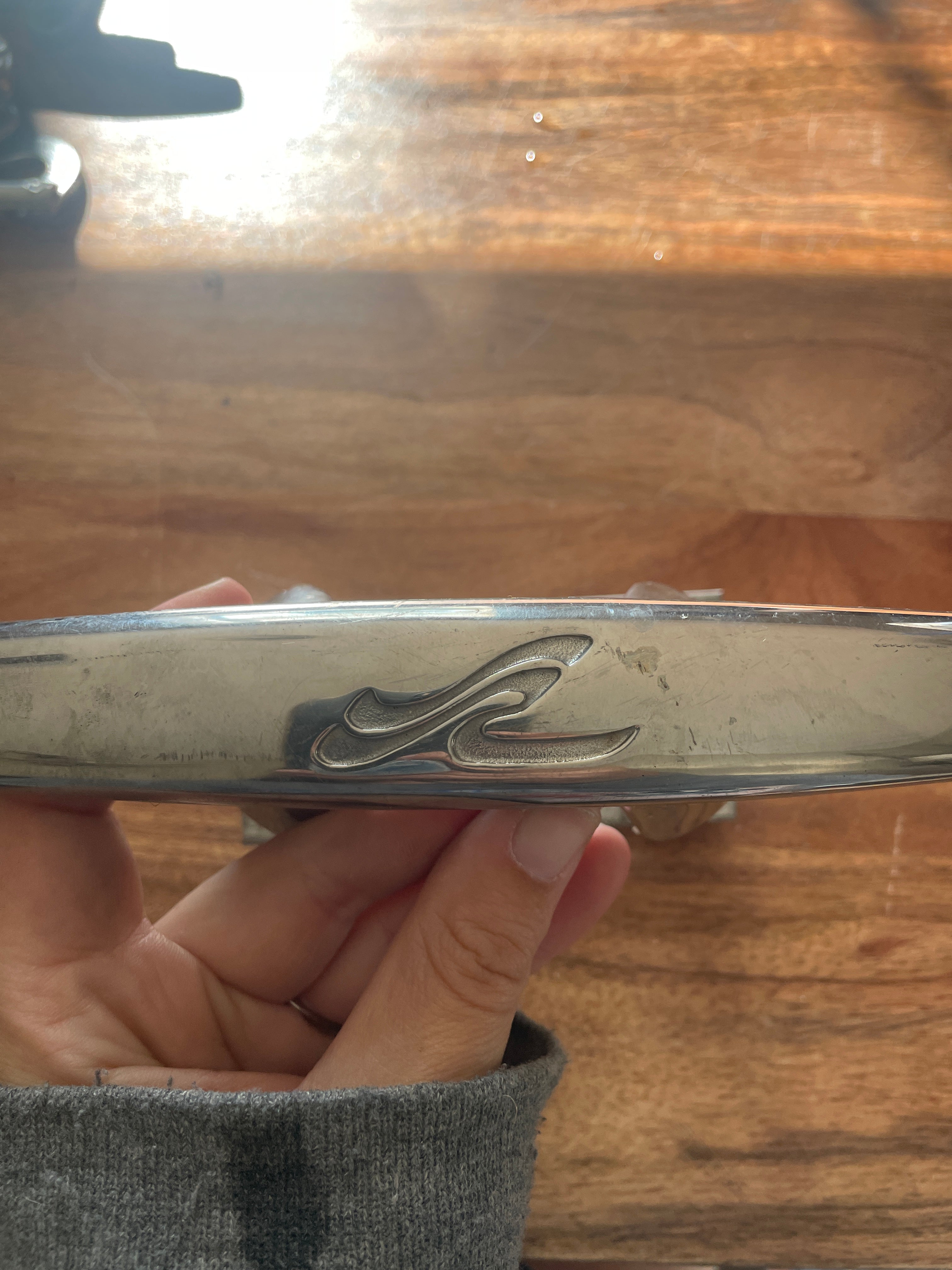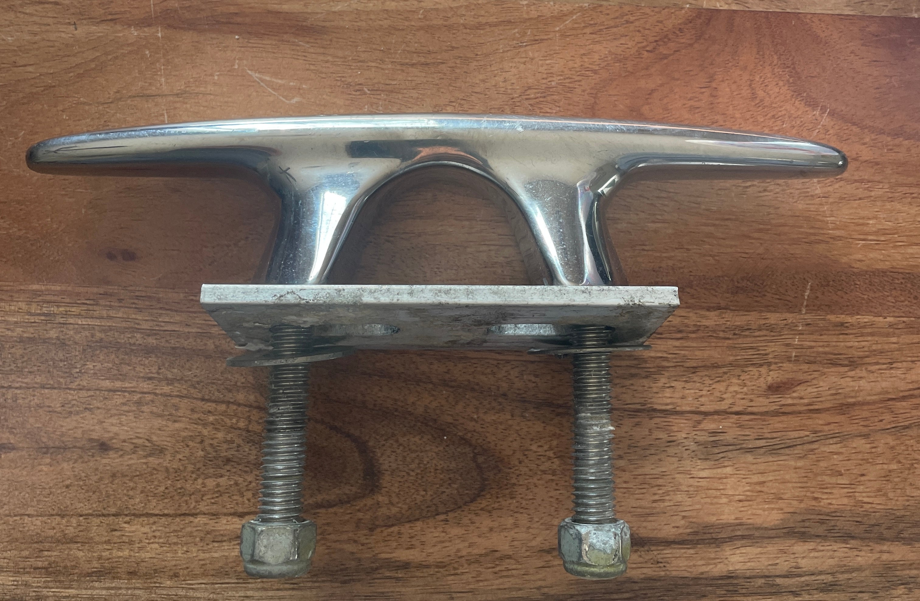 This SeaRay stainless steel cleat is in excellent condition. Minor scratching to it. Comes with bolts and backing plate for mounting. This cleat is 8 1/2” total length. Width between the base is 2’. The bolts are 3” apart.
