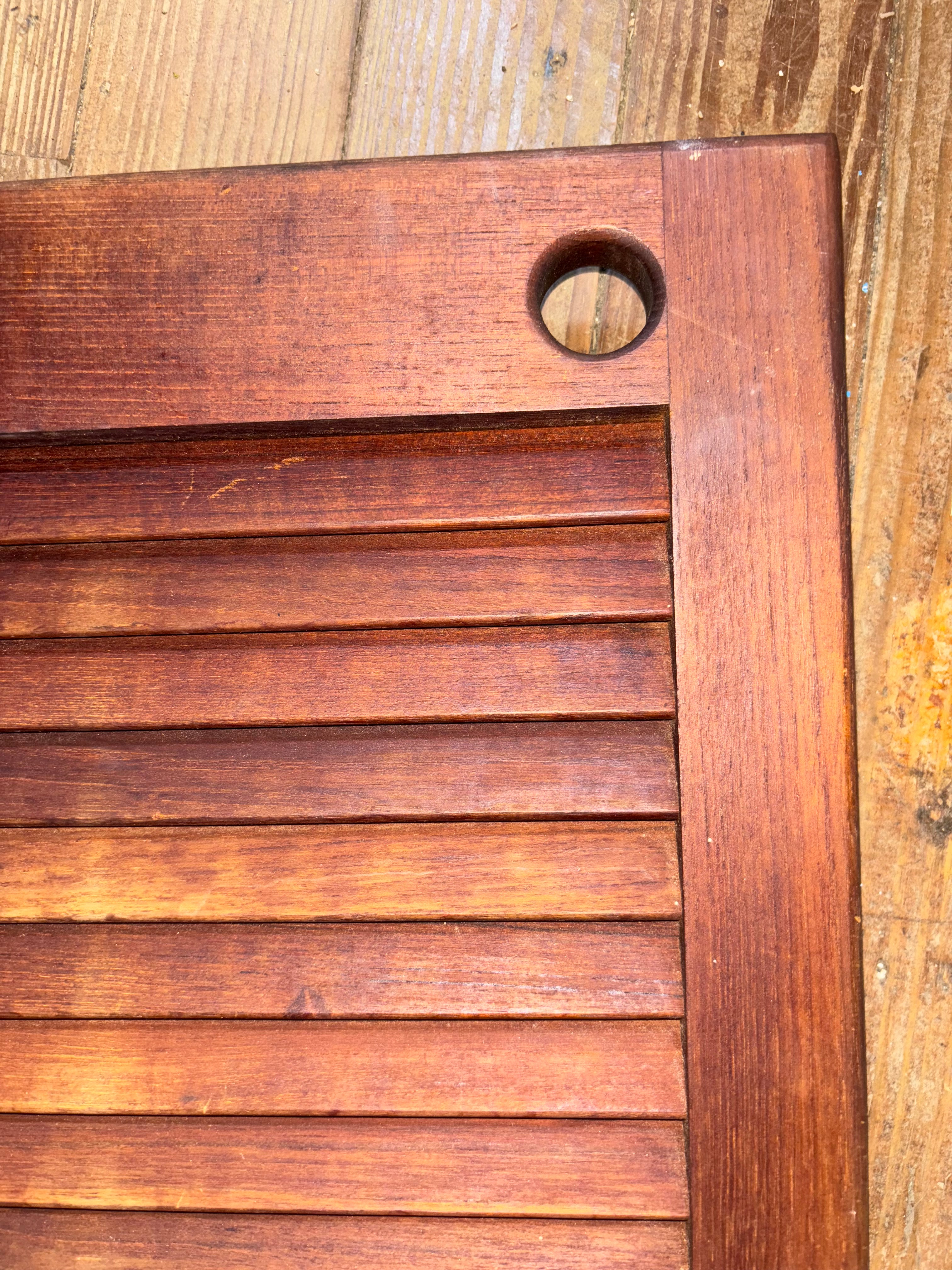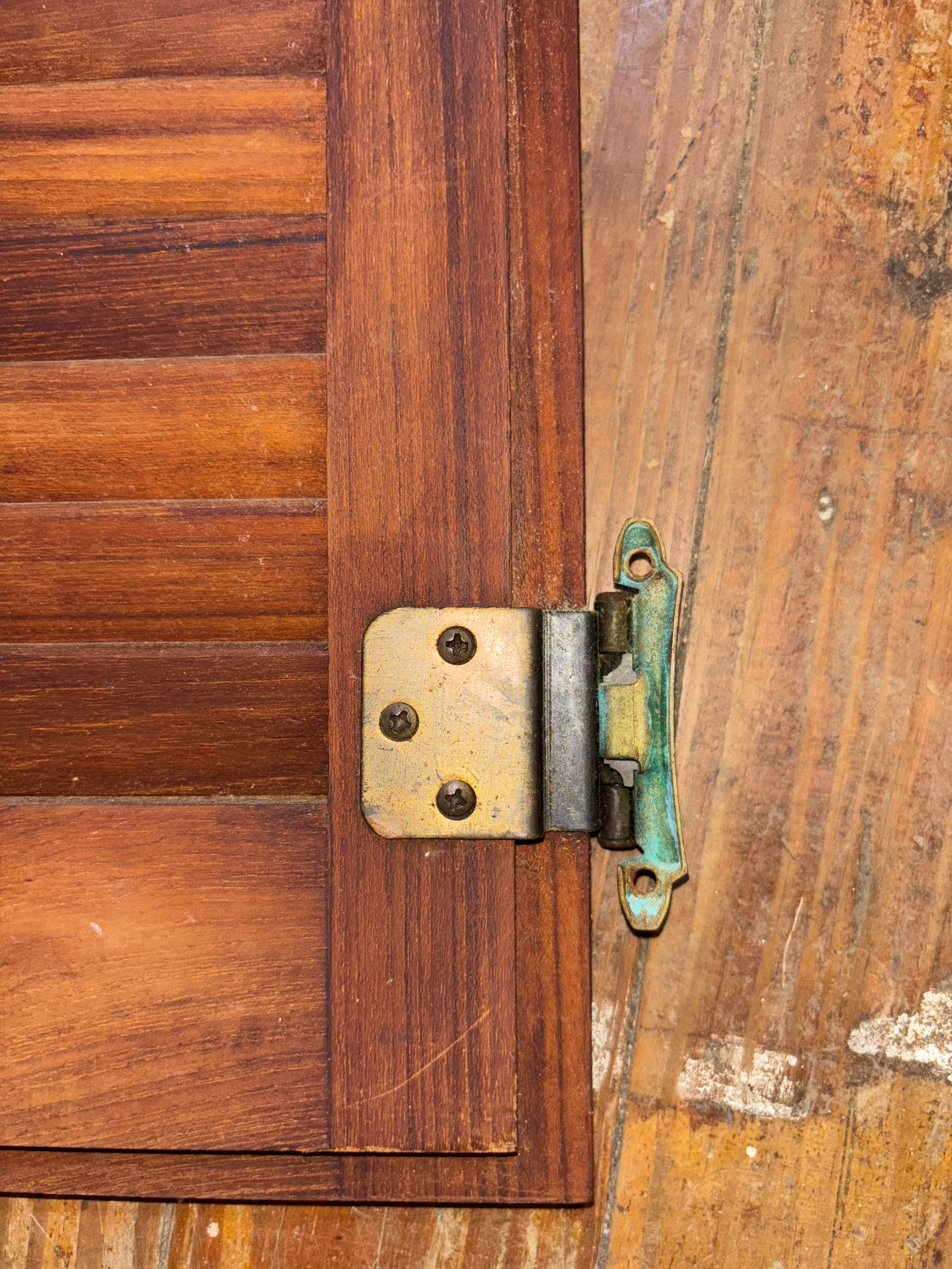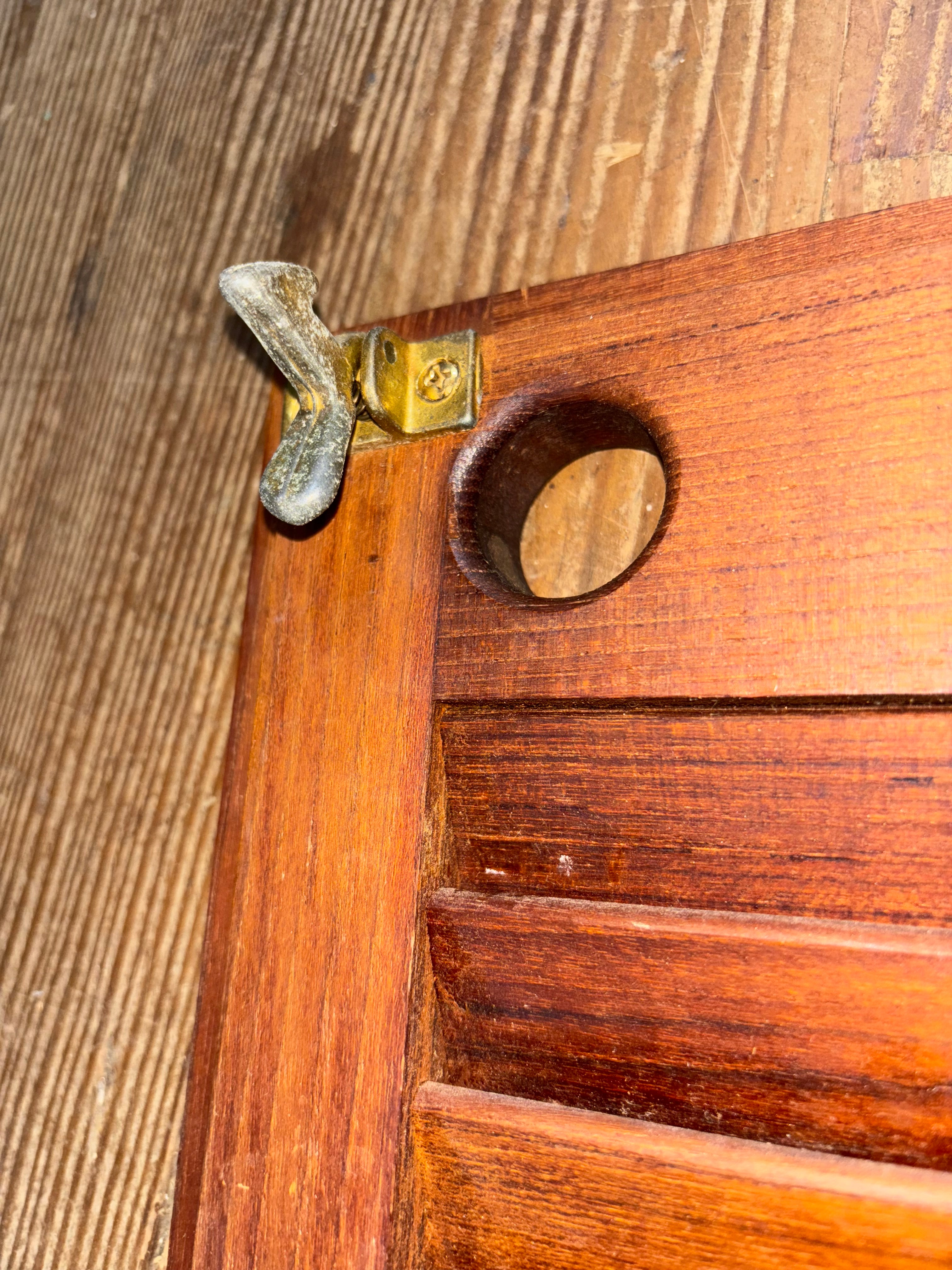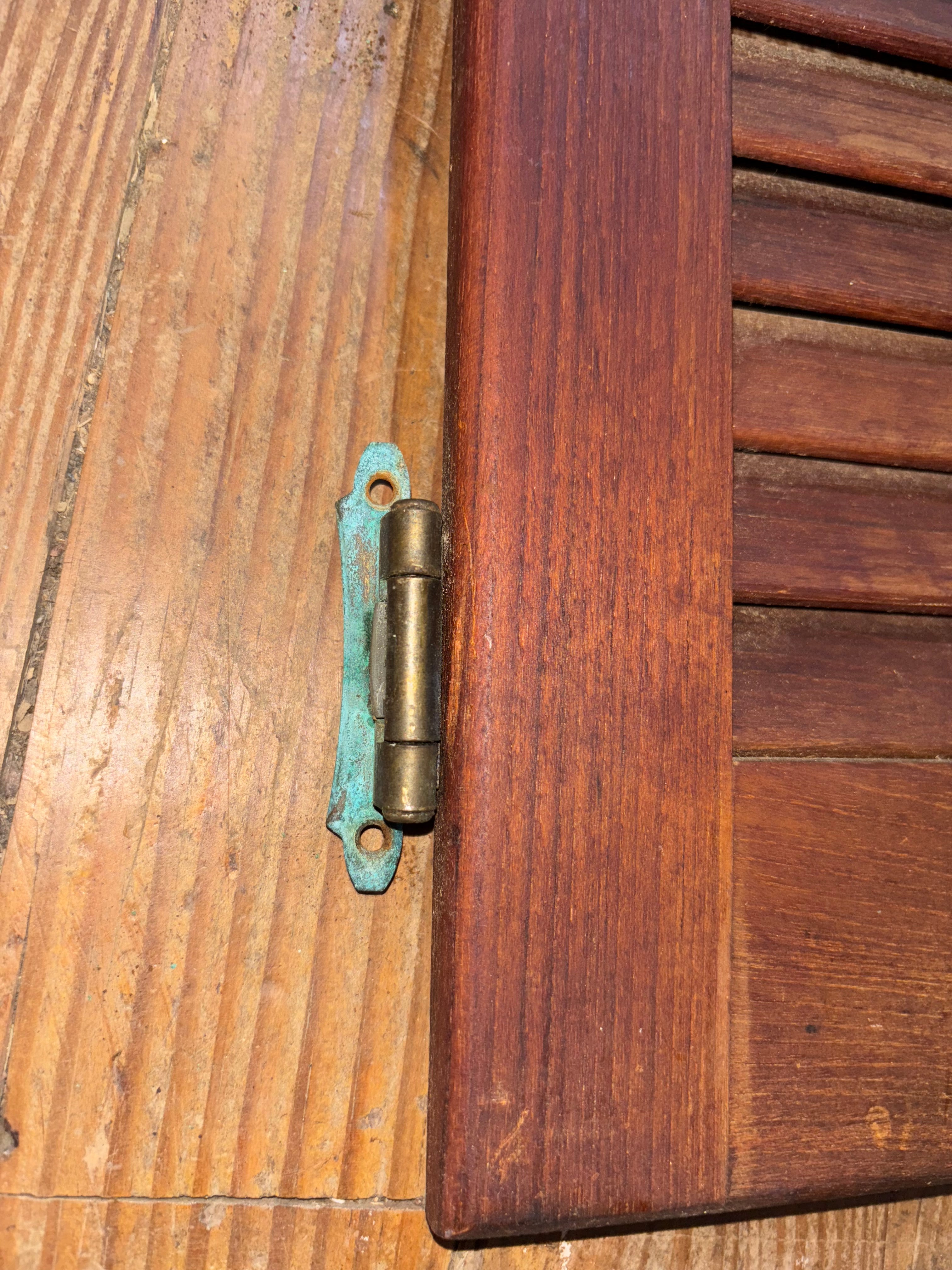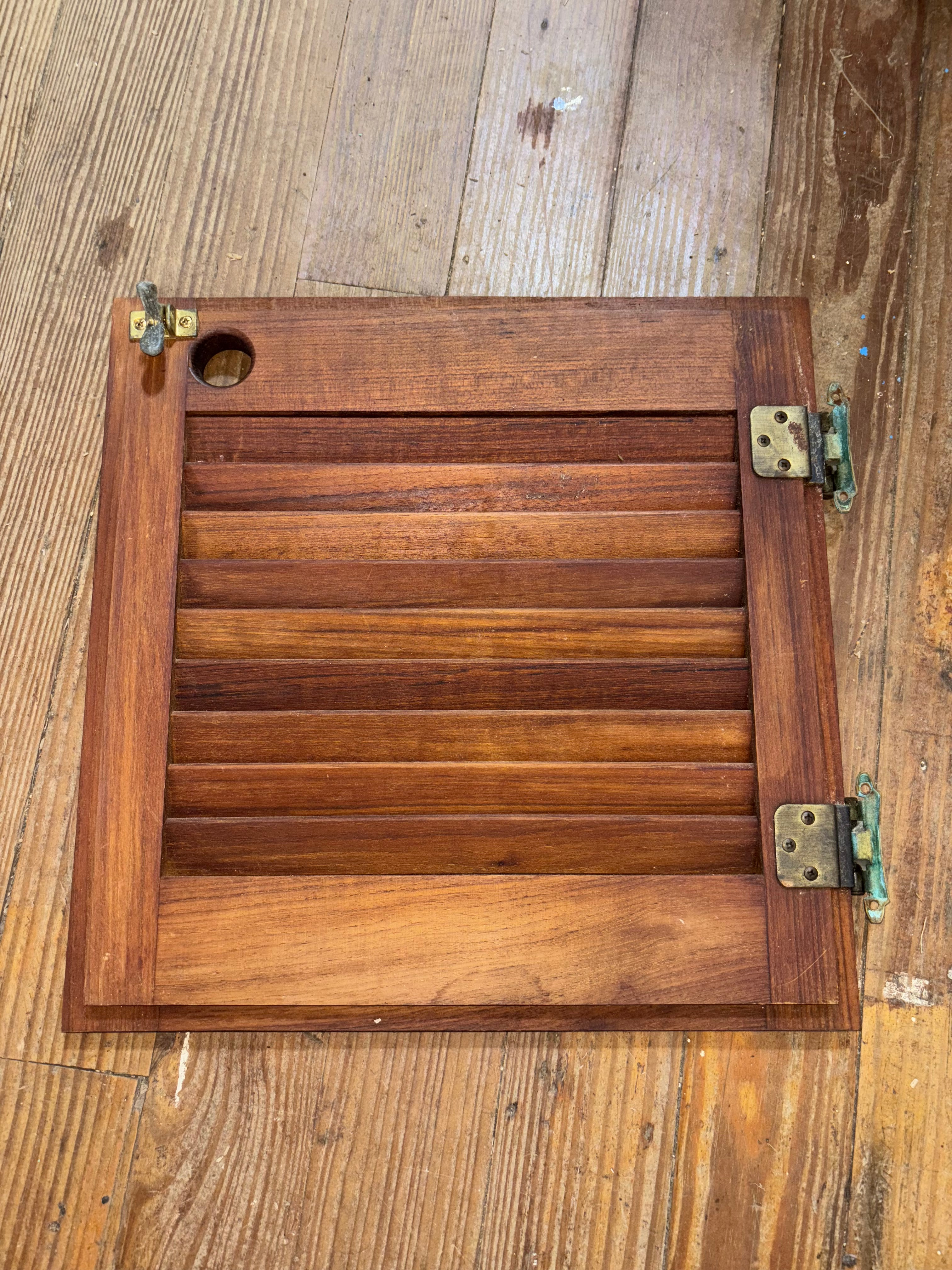 This interior teak louvered door was removed off a seidelman 30 sailboat. This door is in good condition. Natural wood. The inside diameter of the door is 13.5" squared. The overall outside diameter of the door is 14.5" squared. The hinges are not in the best condition, would recommend they been replaced.