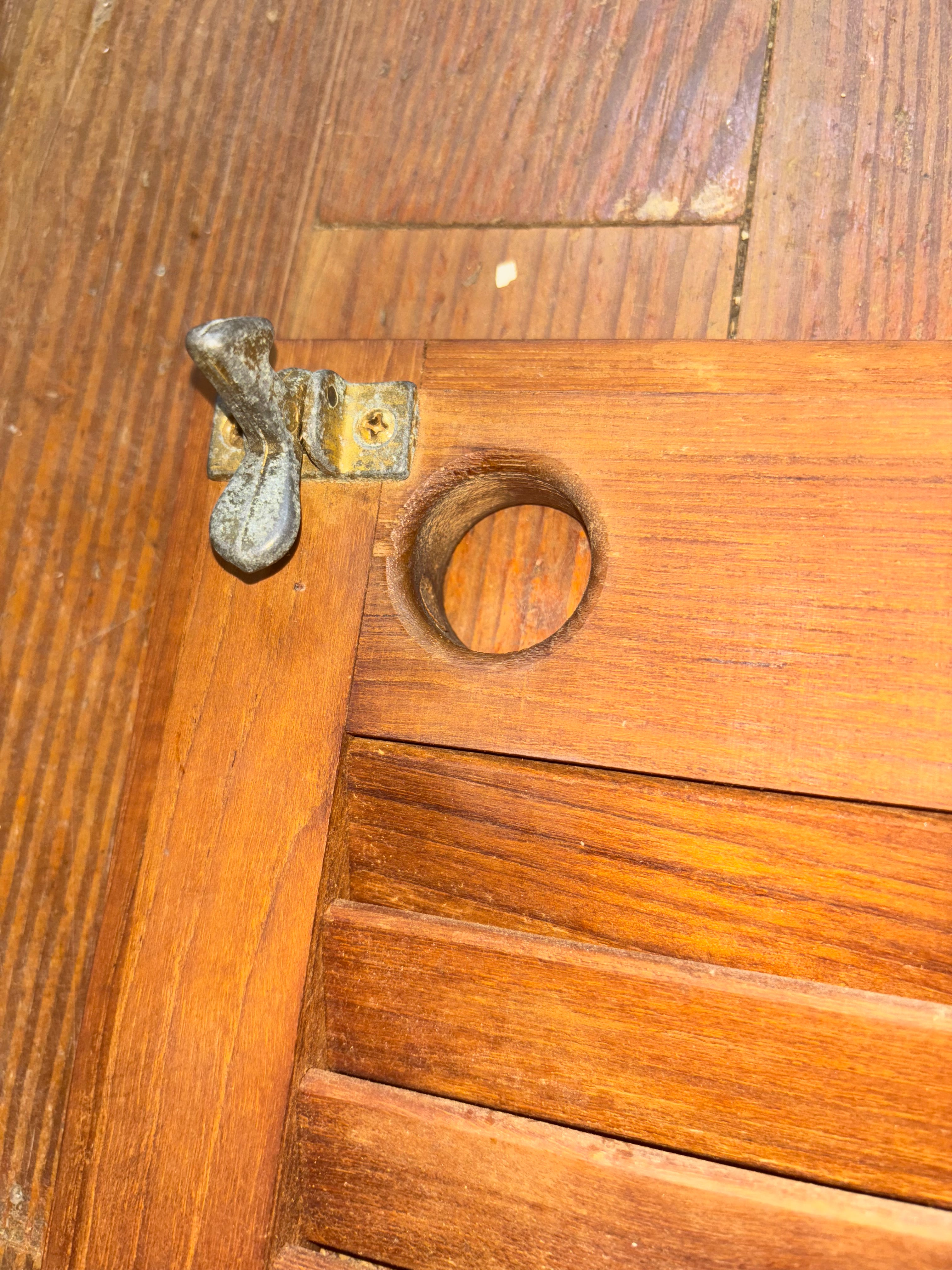 This interior teak cabinet door was removed off a Seidleman 30 sailboat. This door is in great condition. Very clean, minimal scratches and hinges in working condition. This is a square door. The inside diameter measures 13 1/2" x 13 1/2". The overall diameter measures 14 1/2" x 14 1/2".