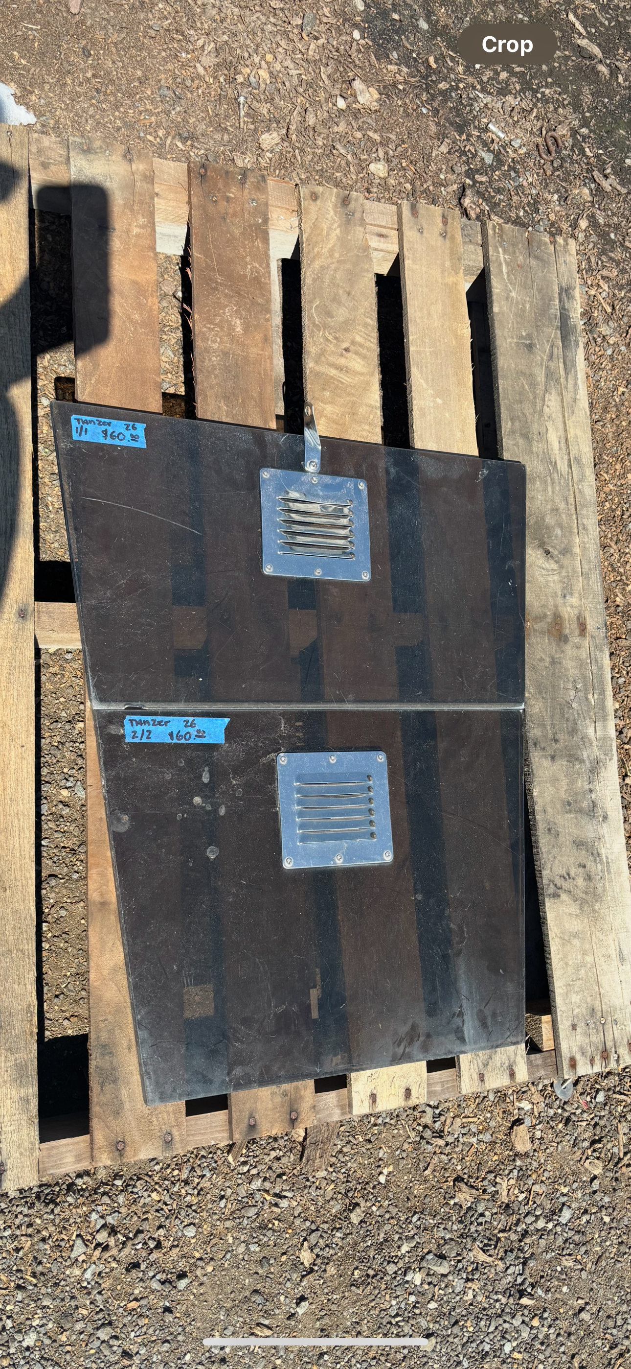 Nice set. Plexiglass with a stainless steel vent on each. Off a tanzer 26. Usual scratching to them but good condition.