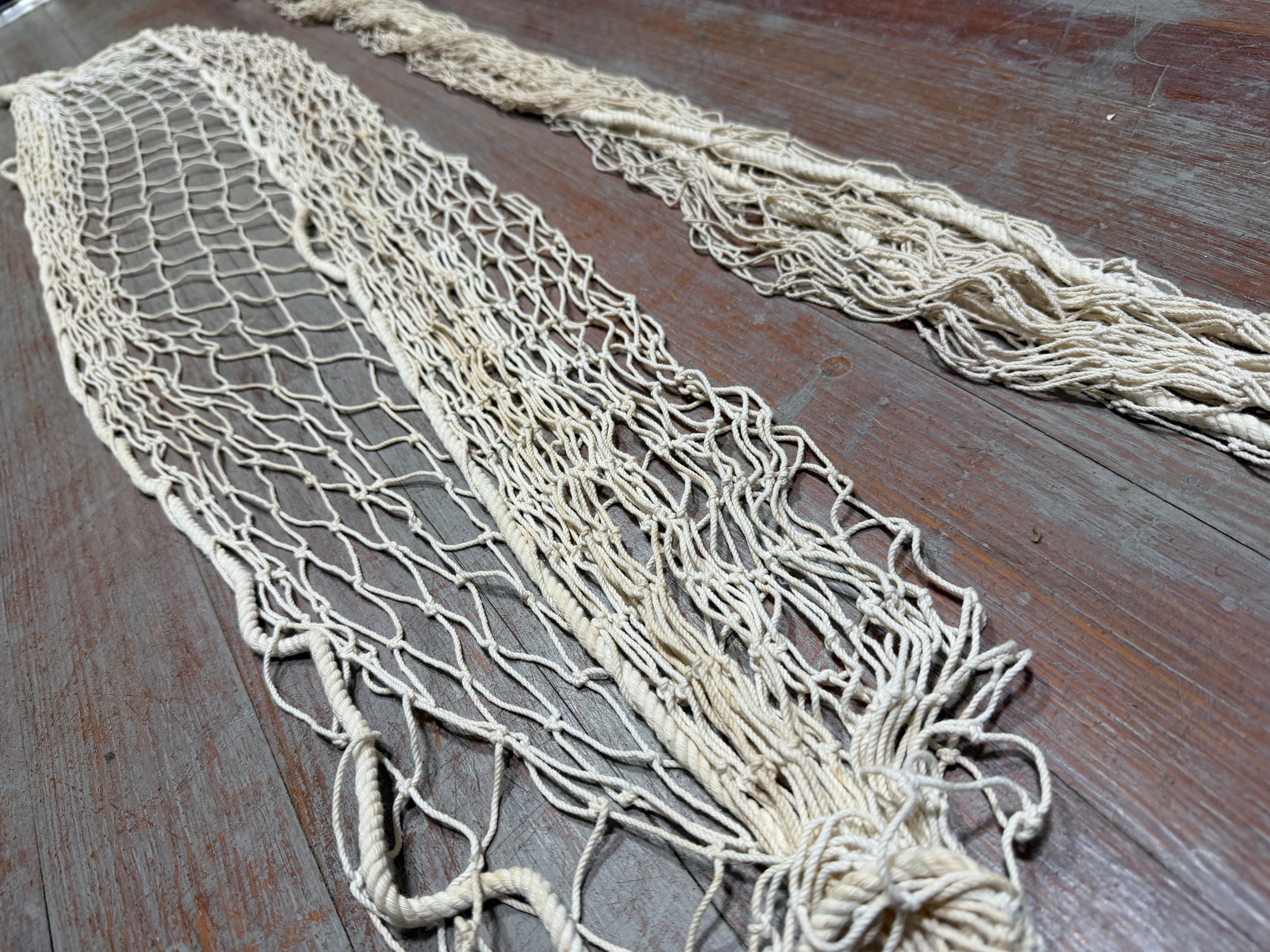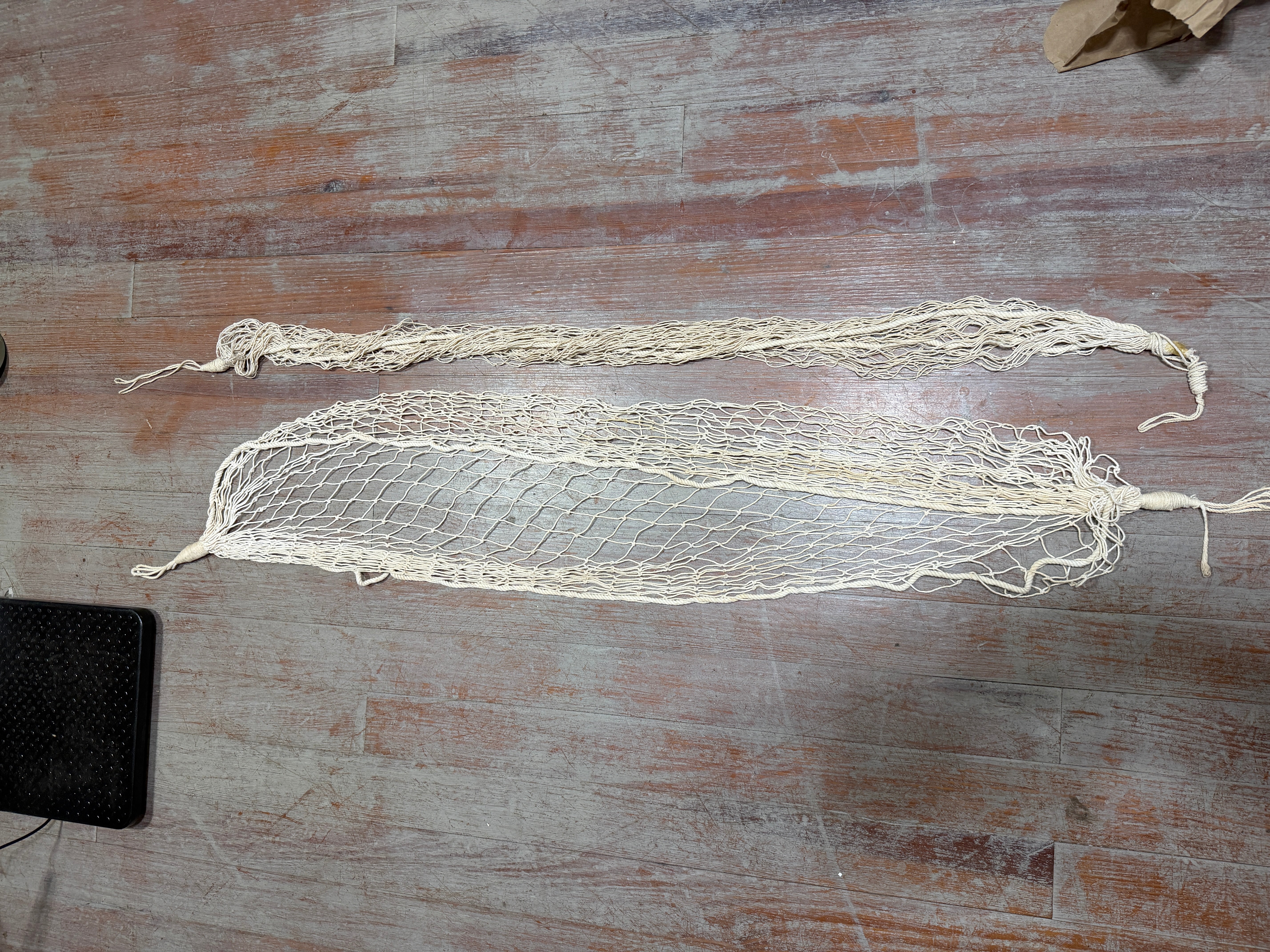 This is a set of 2 storage hammocks. They are roughly 5' in length. One is in good condition. The other looks like the wrap around the ends has come undone but I do believe it is still strong holding but would be an easy fix!