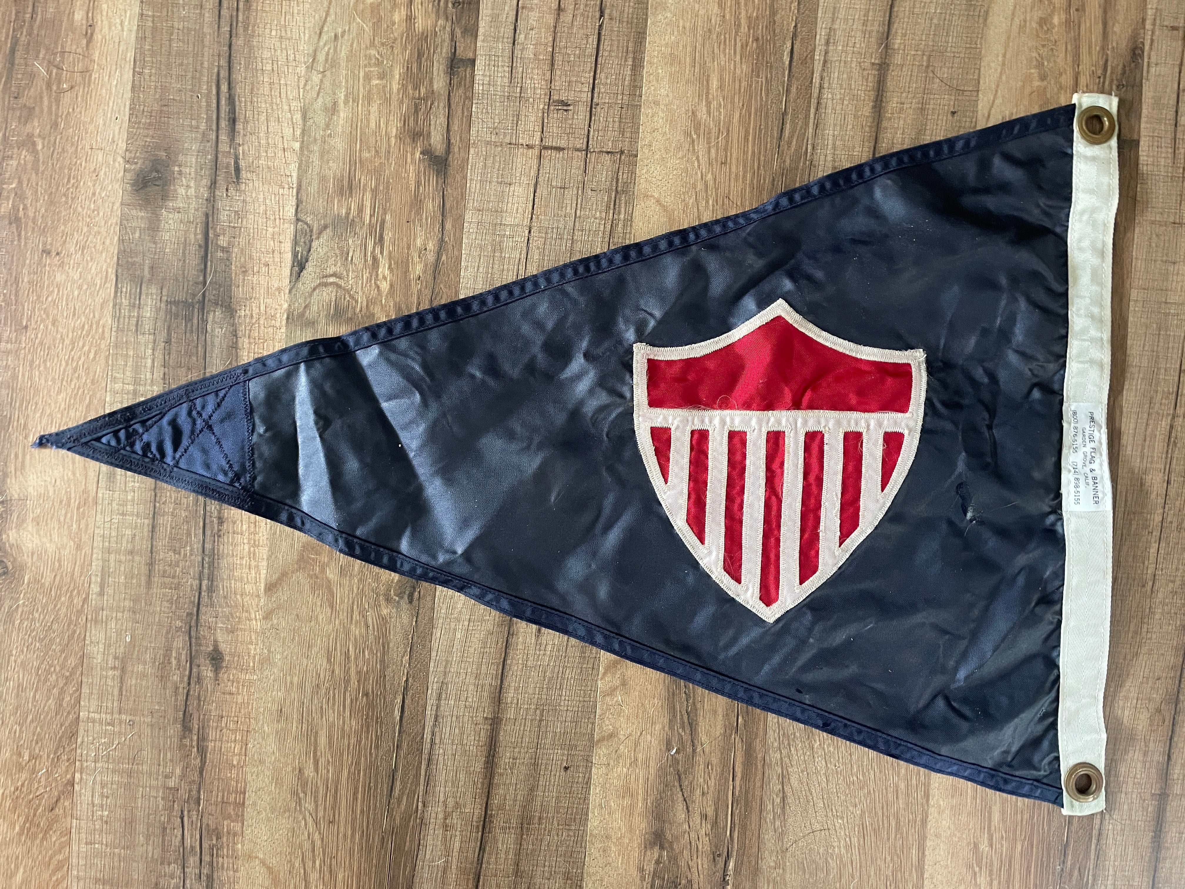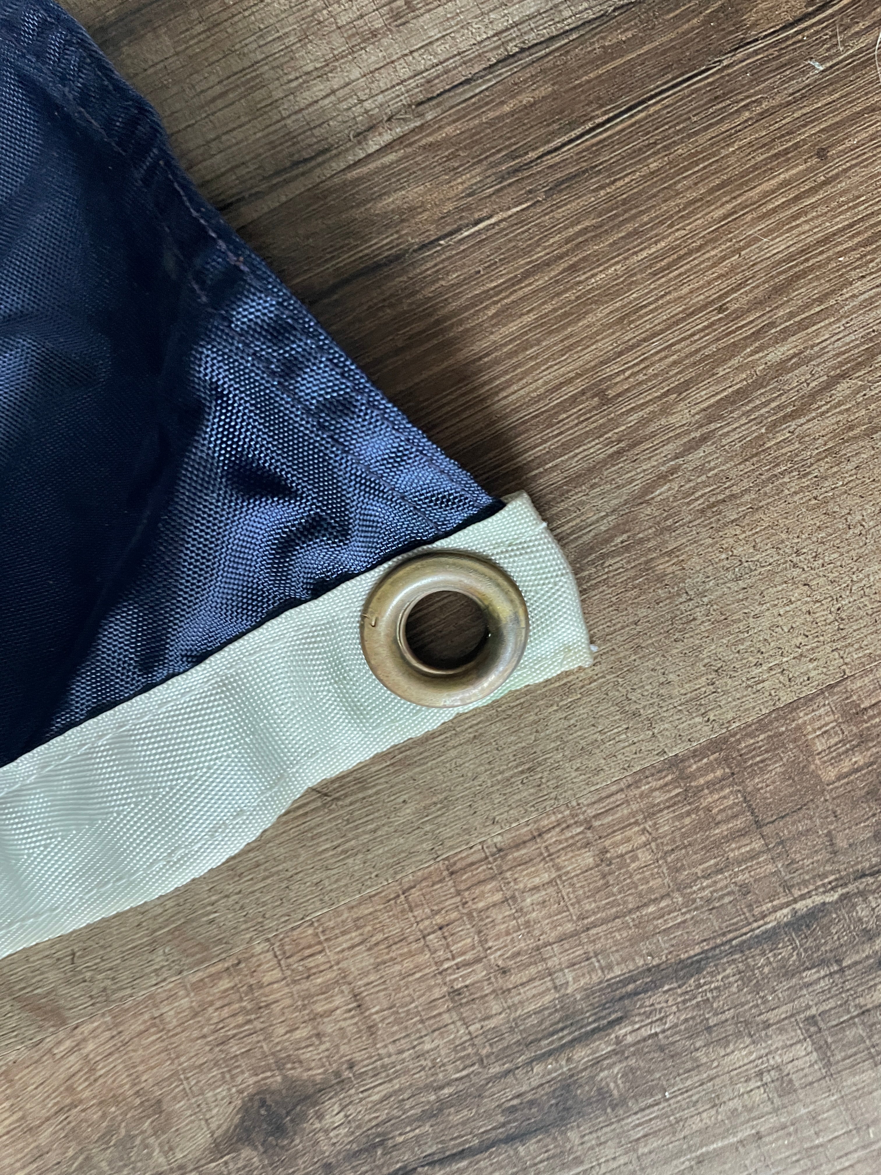 This flag is the seven seas cruising association flag. It measures 16” x 24”. Has a small tear at the very end of the flag, just some stitching.