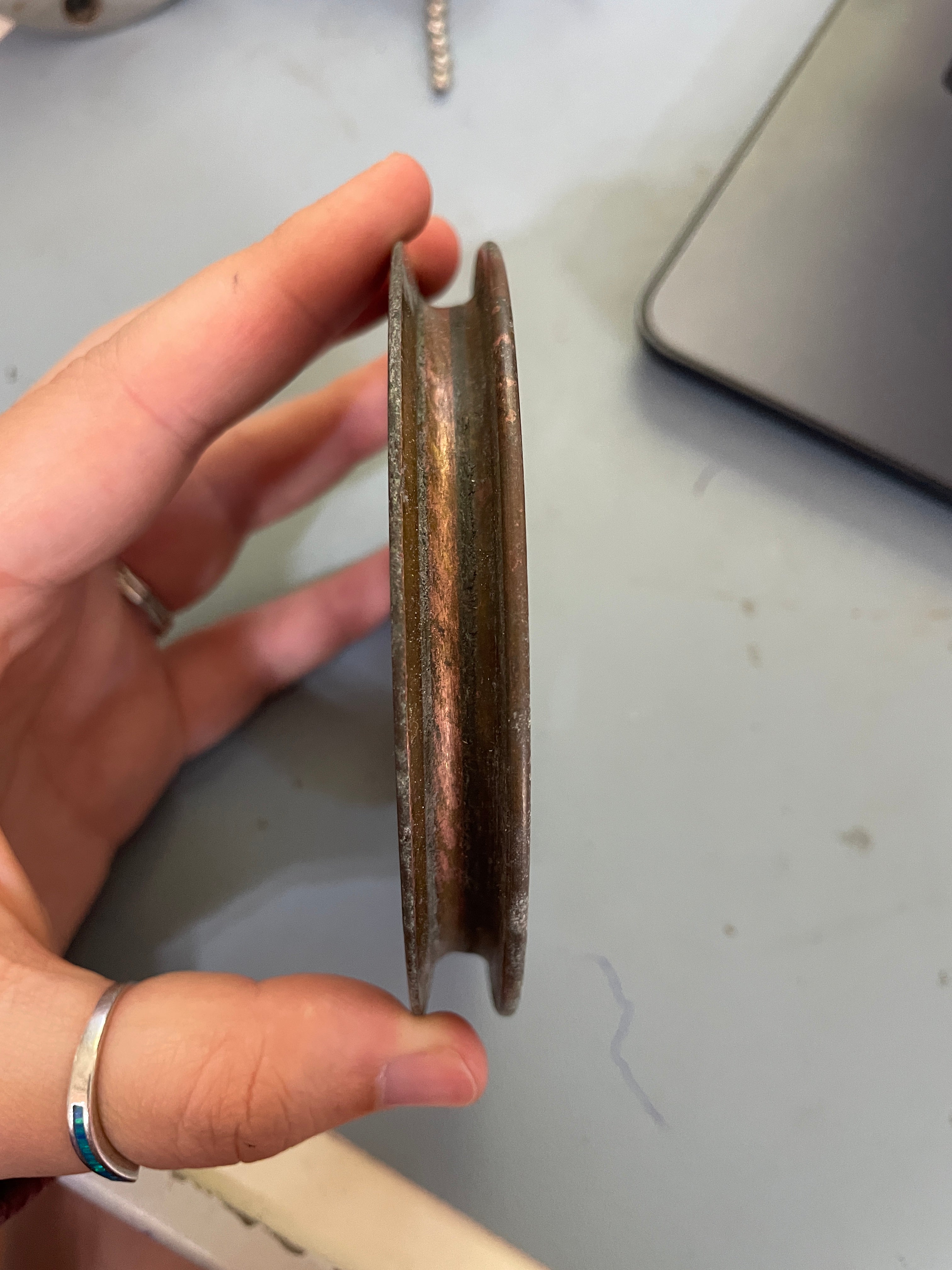 This single bronze edson 4" pulley is in good condition. Fits 1/4" wire. Model A-450. The center hole is 3/8" diameter.