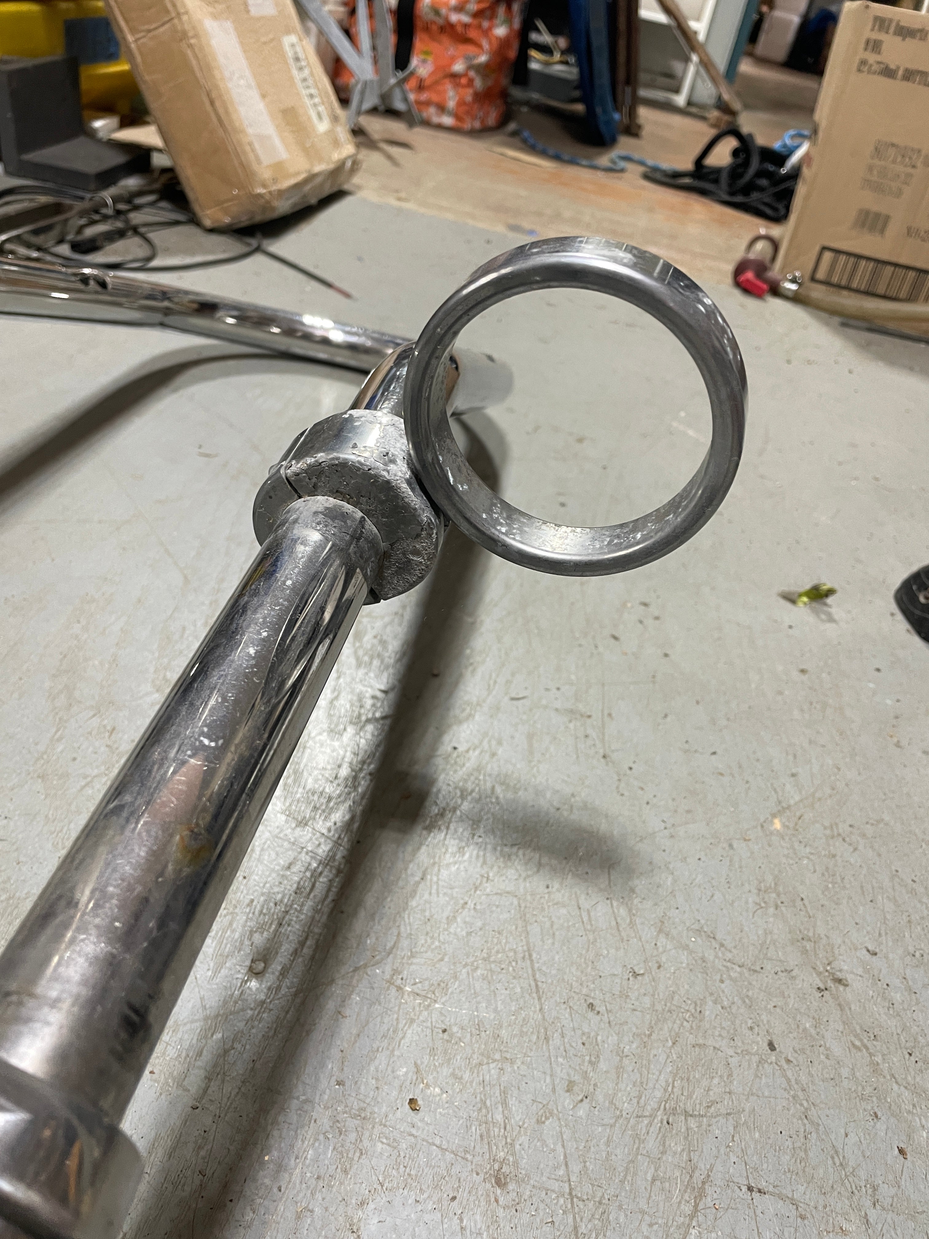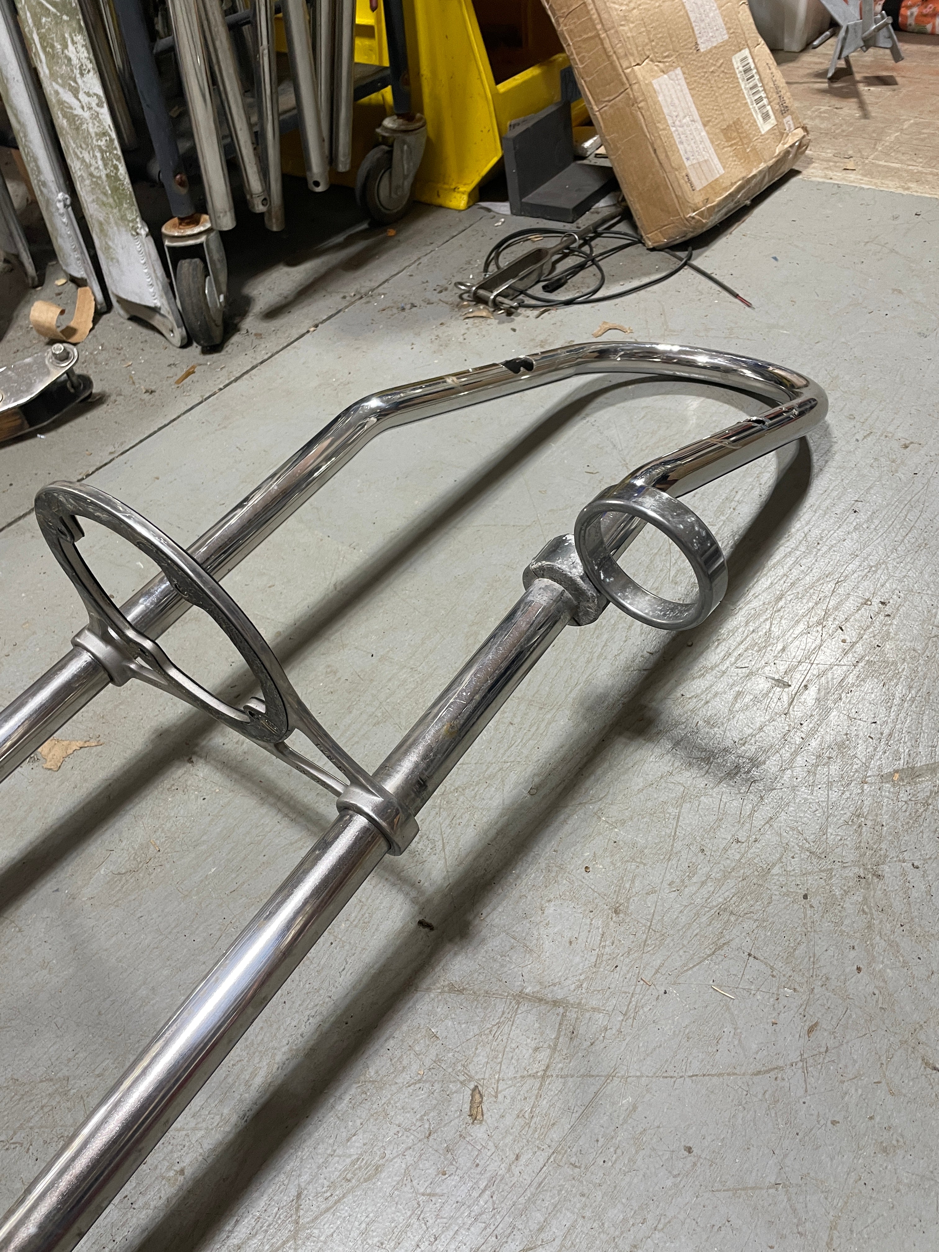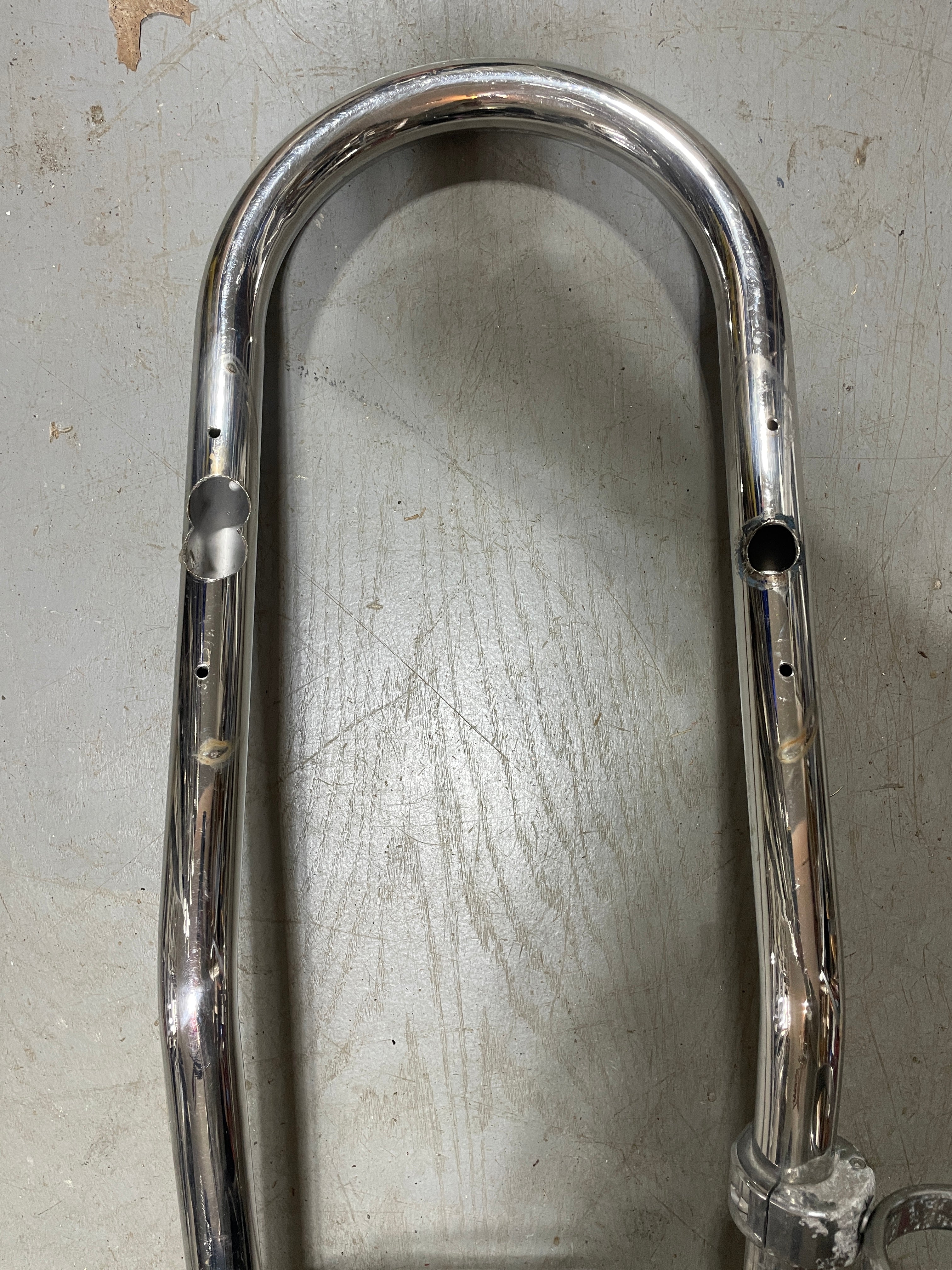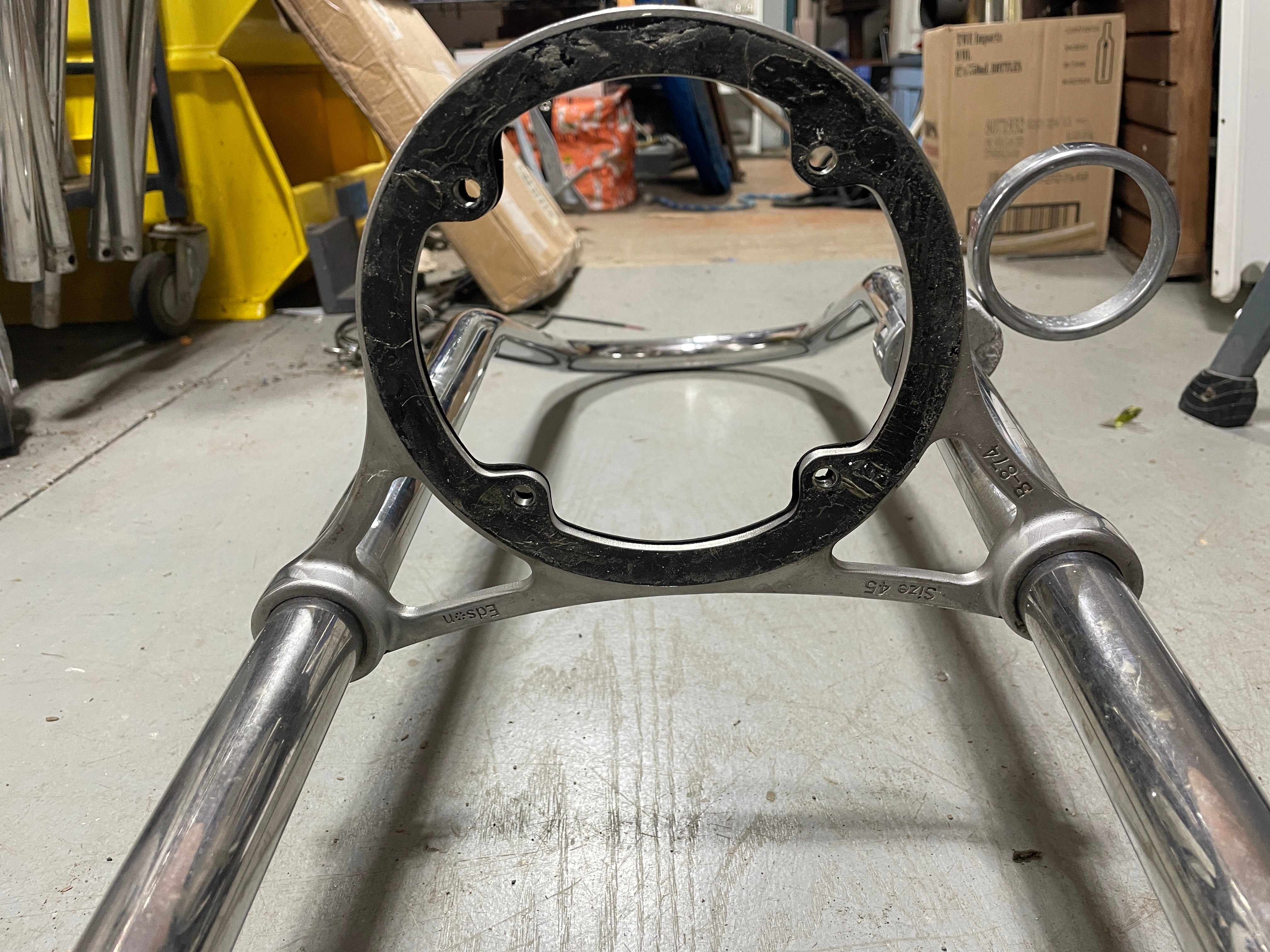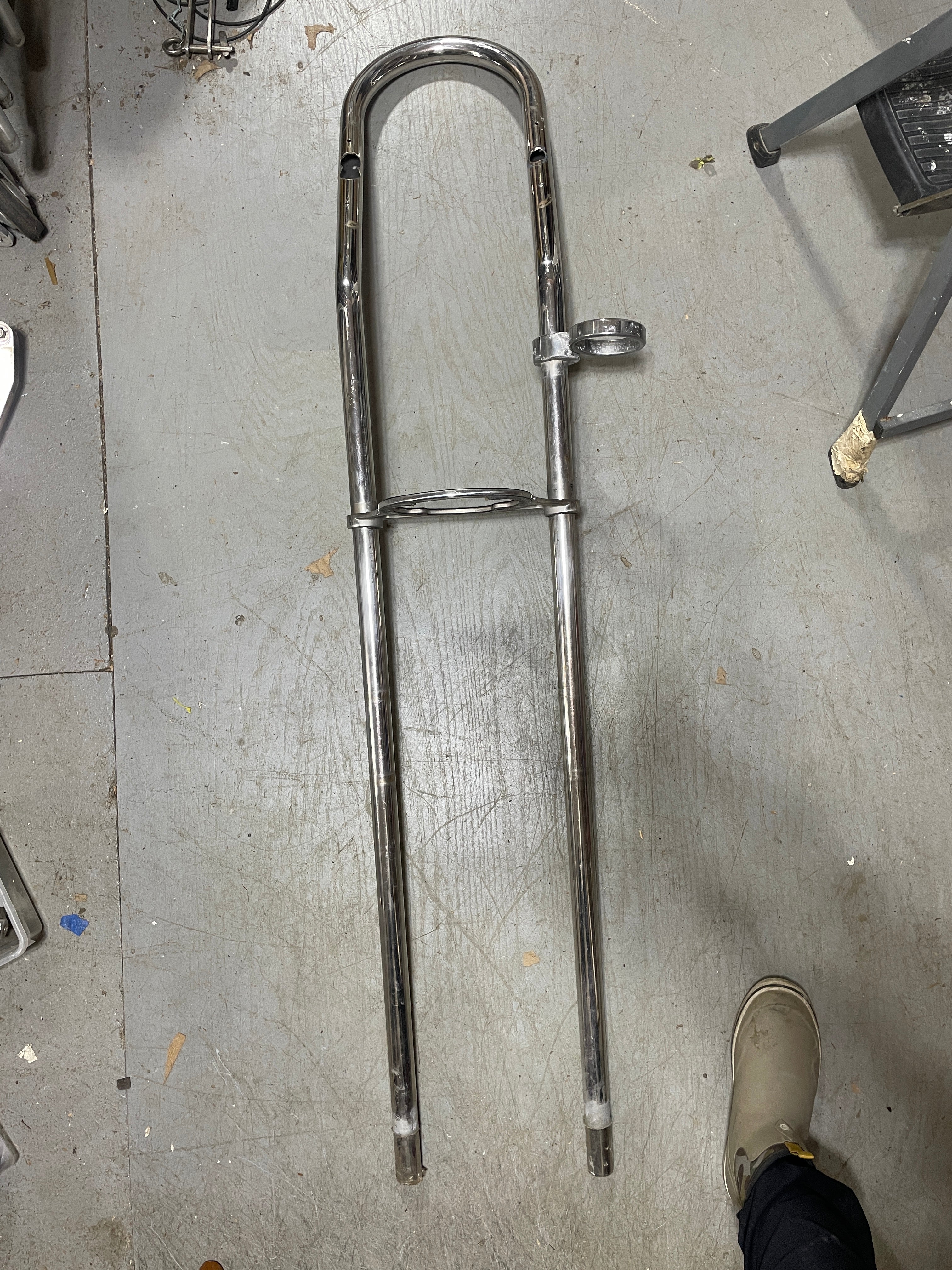Single Bend 59" Tall Pedestal Guard. It is in good condition. It does have the usual scratching and come larger cut holes where there were instruments mounted at one time. This guard has a 9 3/4" Center to Center measurement. It is 1 1/4" Tubing diameter. NO FEET. It does come with a stainless plated (it is chipping) cup holder as well as the nice Edson stainless compass housing plate. The plate fits a 5 9/16" diameter compass with the bolt holes being 3 3/4" apart.