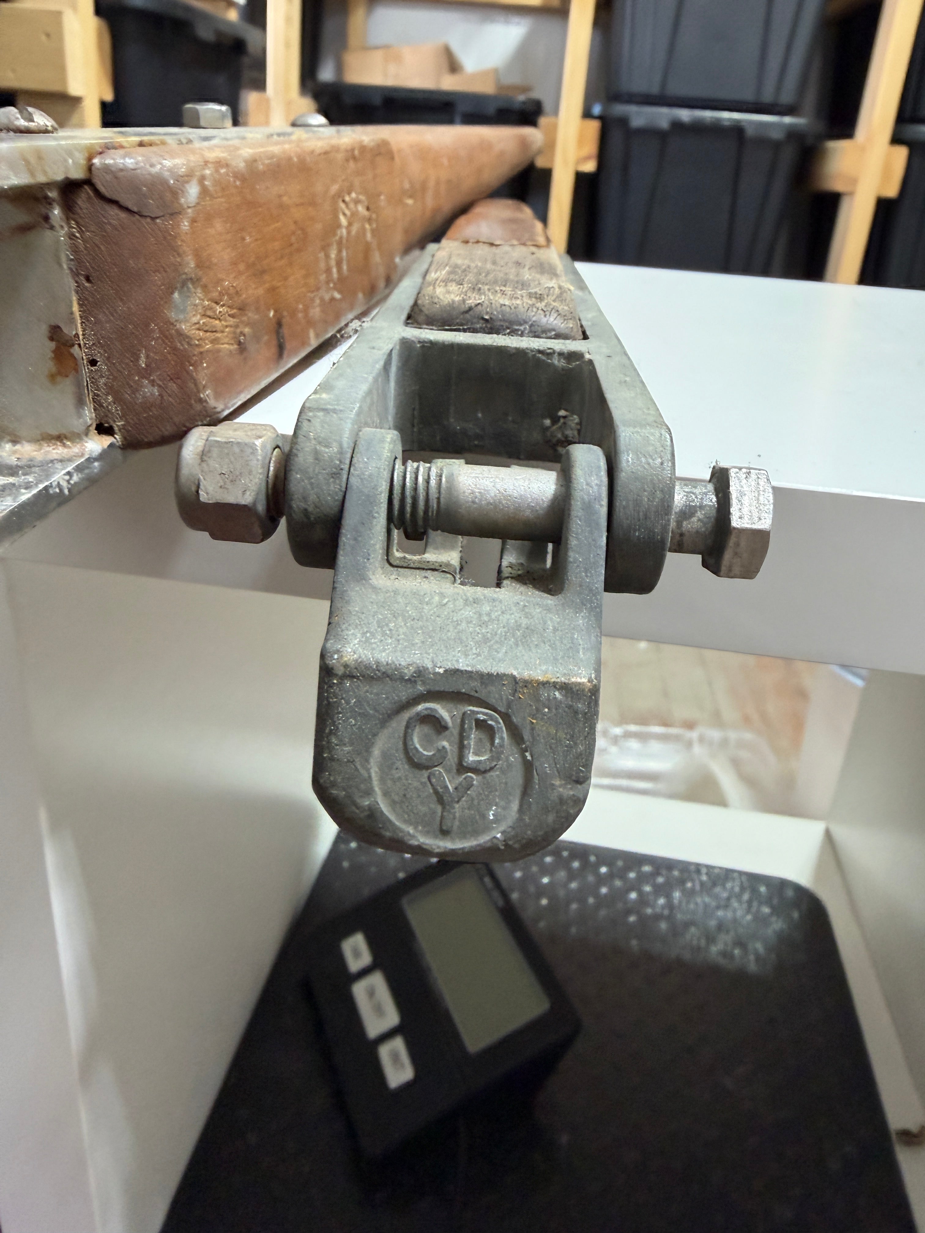 Slightly Curved 39" Long Tiller Handle. Bronze hardware. Teak Handle has varnish issues and signs of use but is solid. The handle is 1 1/4" width. Bronze hardware - the rudder cap is stamped CDY - Cape Dory Yachts. It has an 11/16" diameter hole.