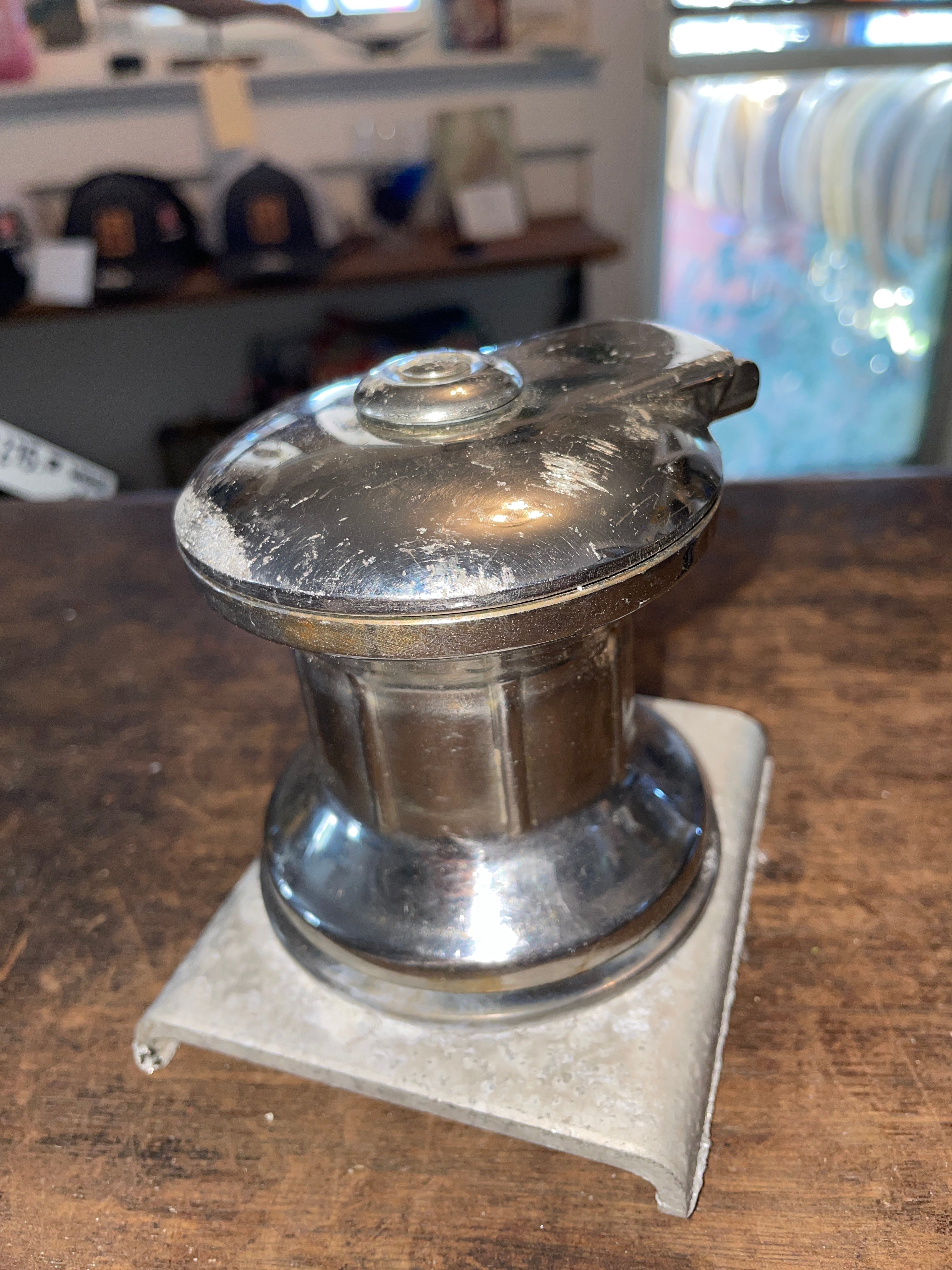 This small stainless steel winch is in good working condition. It is 2 speed. The winch is a handle insert style. The width of a handle is 1”. This winch has a base diameter of 3” and it stands 3 1/2” tall. Has an aluminum base from when we removed but that can easily be removed and replaced.