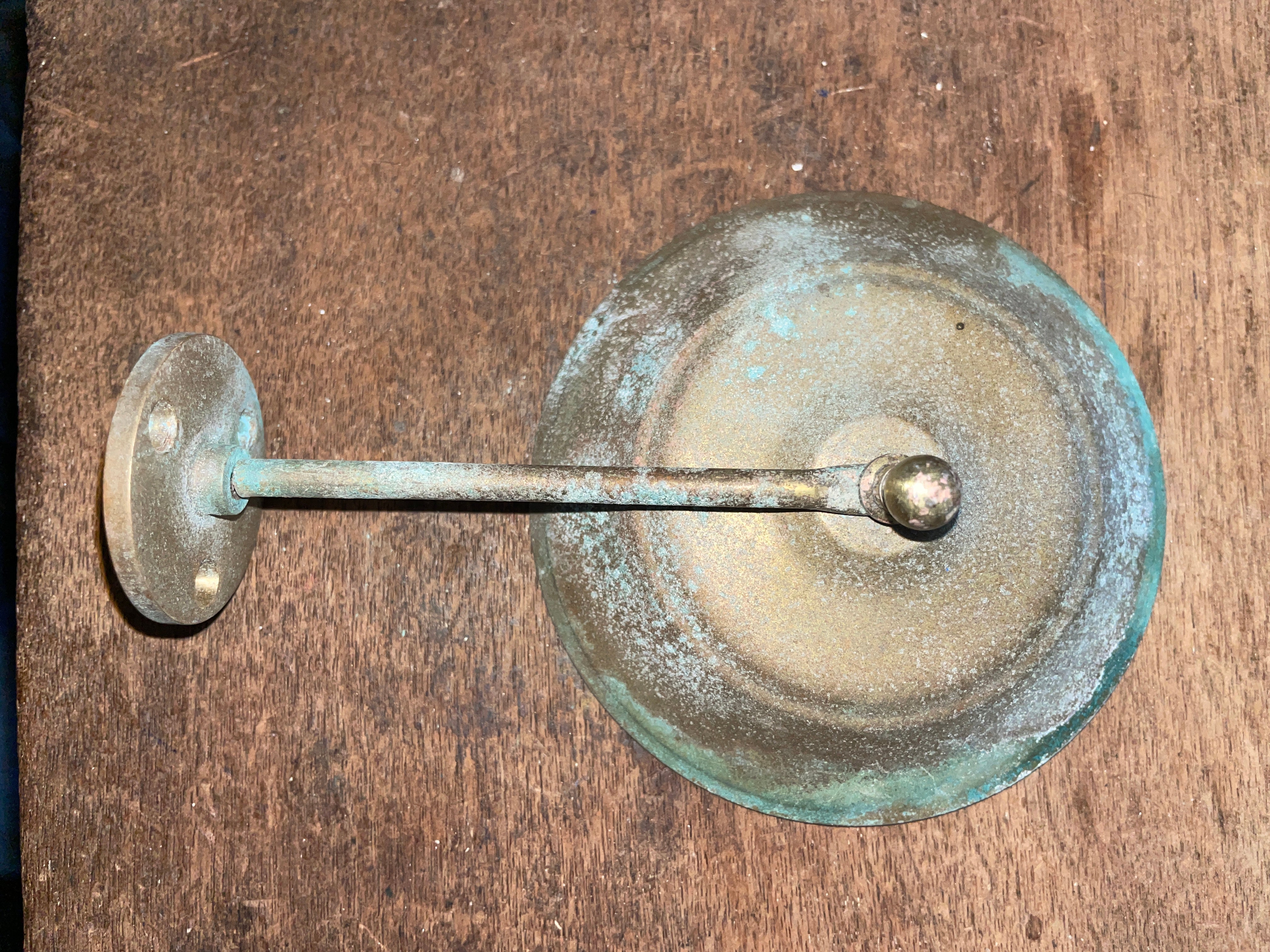 This small brass oil lamp deflector is in good condition. It does have some pitting damage. Not bad it might clean off. The base is 1 1/2” diameter. The oil lamp deflector is 3 7/8” diameter. It will sit 5 1/2” off the wall when mounted.