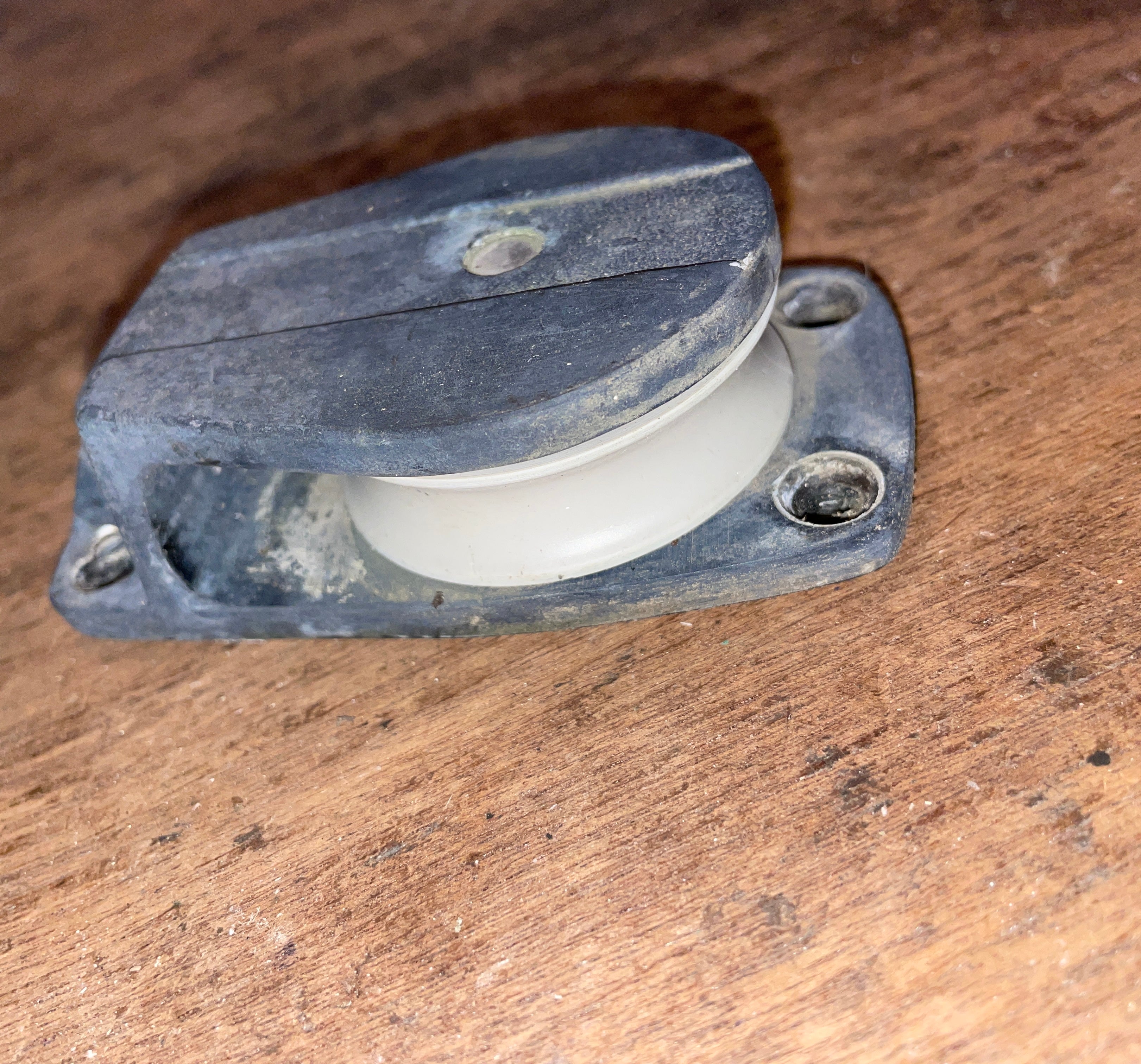 This small boat foot block is in good condition. Has a 2 1/8” sheave and can fit up to 1/2” line. The base is 3 7/8” long x 2 1/8” wide.