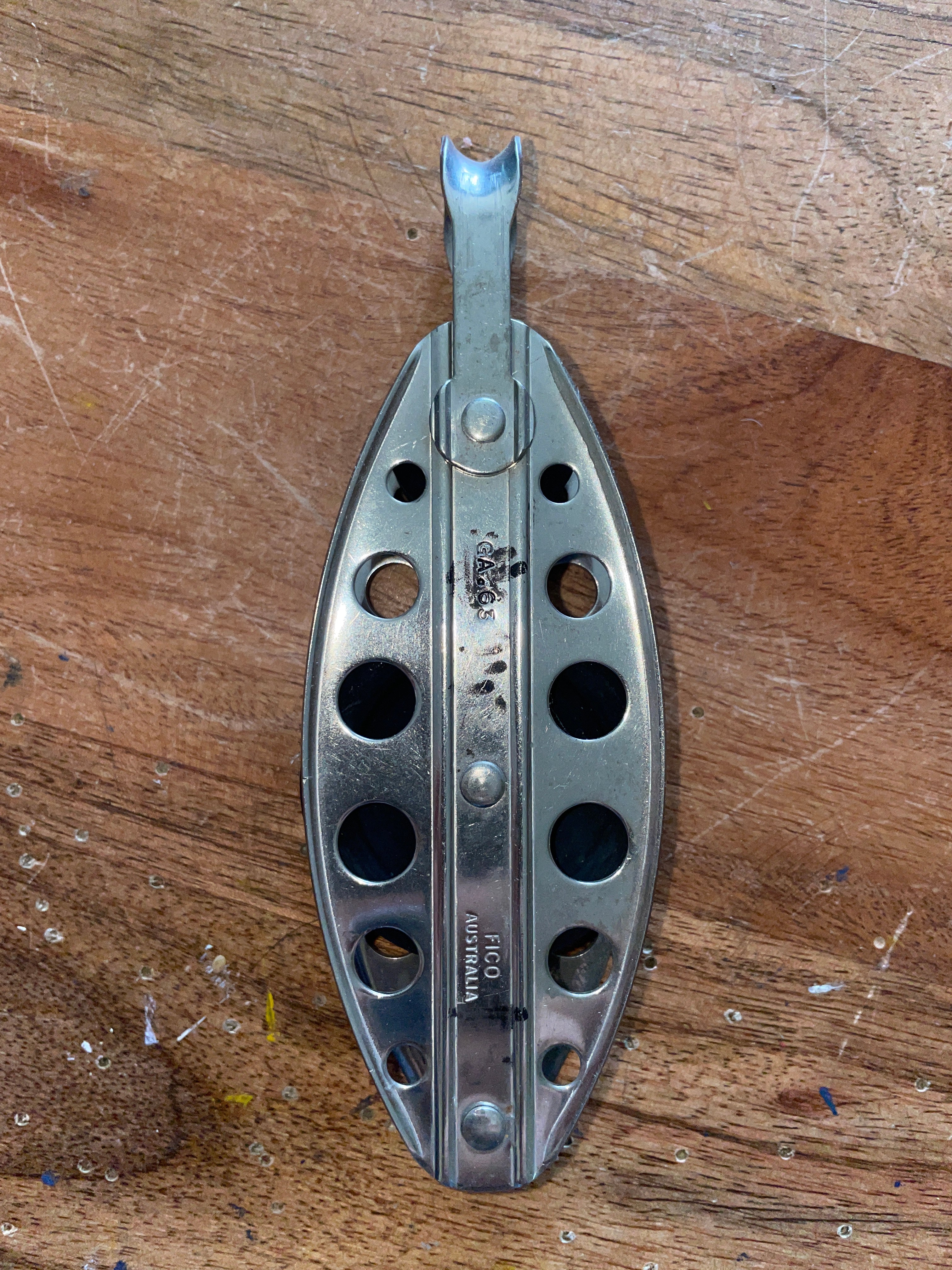 This small fico fiddle block is in great condition. The body is stainless steel with plastic sheaves. The larger sheave is 1 3/4” and the smaller is 1”. They fit MAX 3/8” line diameter. Has a Beckett at the bottom. Overall length of this block is 5 1/4”.
