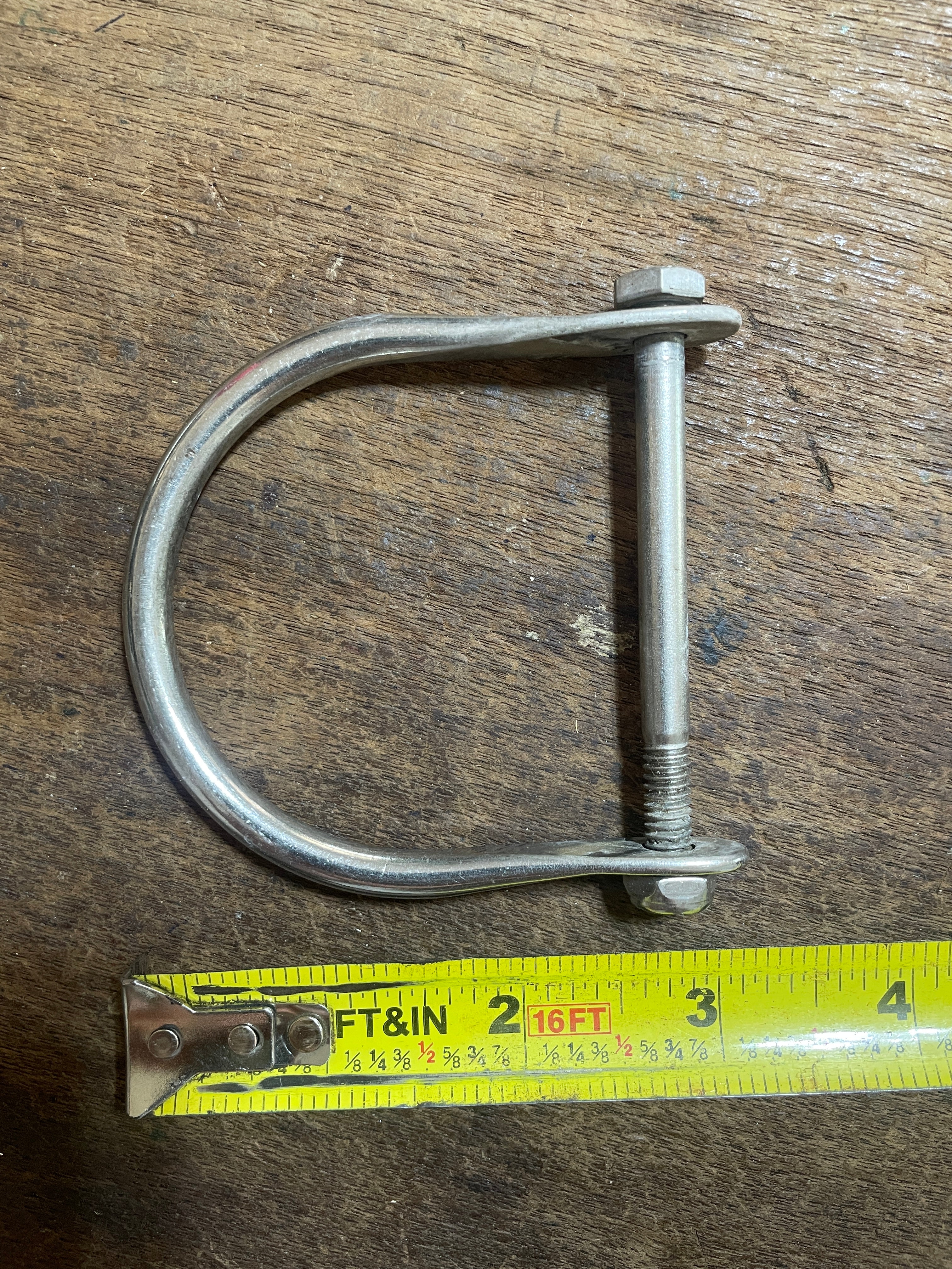 This small stainless steel boom bail is in great condition. The bail is 3 1/8" total length and the inside diameter is 2 9/16". The bolt is 3" total length x 3/16" diameter.