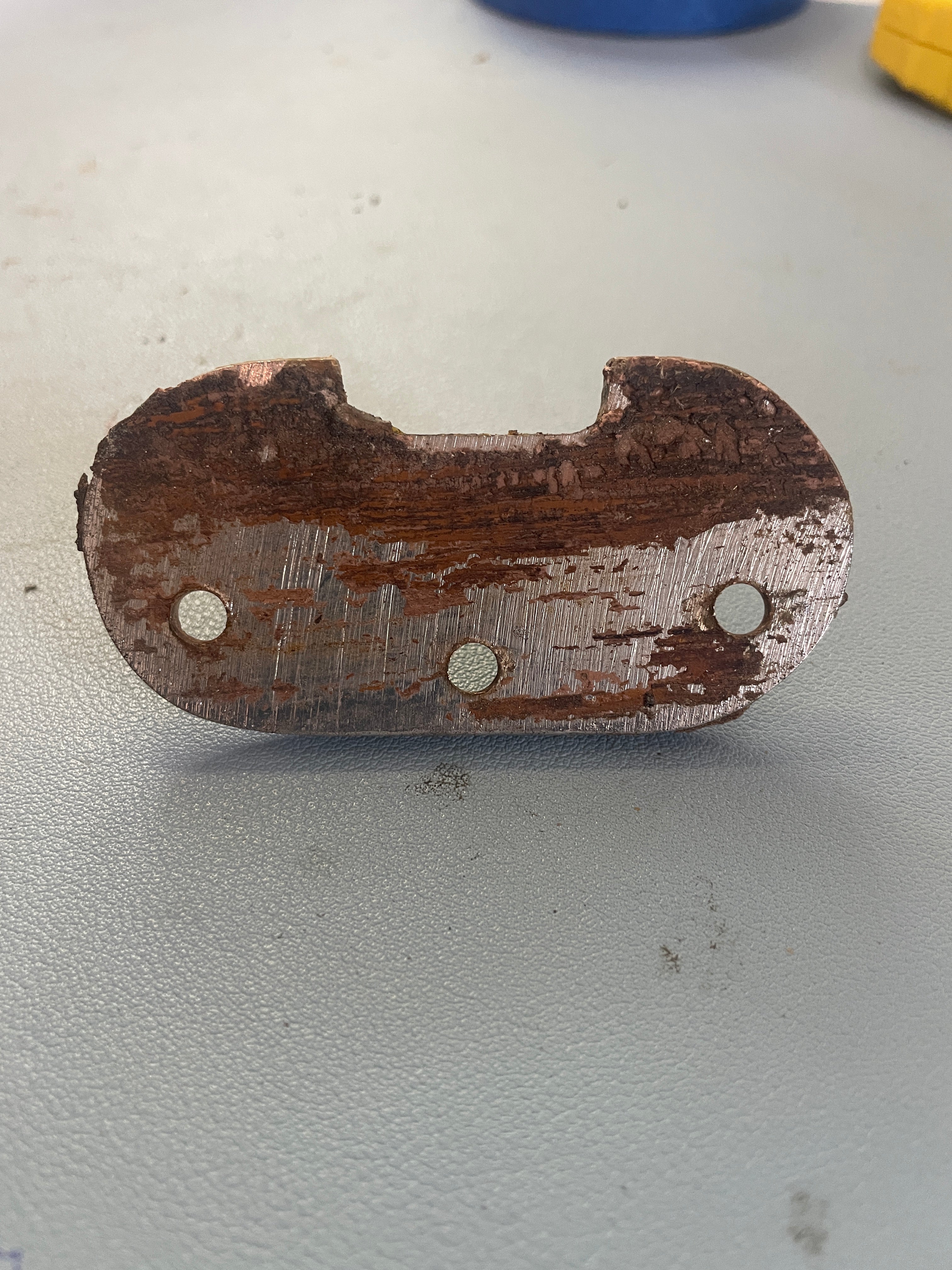 Smaller Chromed Bronze Rounded Rectangle Pad Eye is a ladder bracket. The eye is 7/8" x 5/8". Removed off a 1934 Eisenhower 50'. The base is 3" long x 1 1/2" widest. The center where the indent is is 1 1/4" width. 1 1/4" tall.