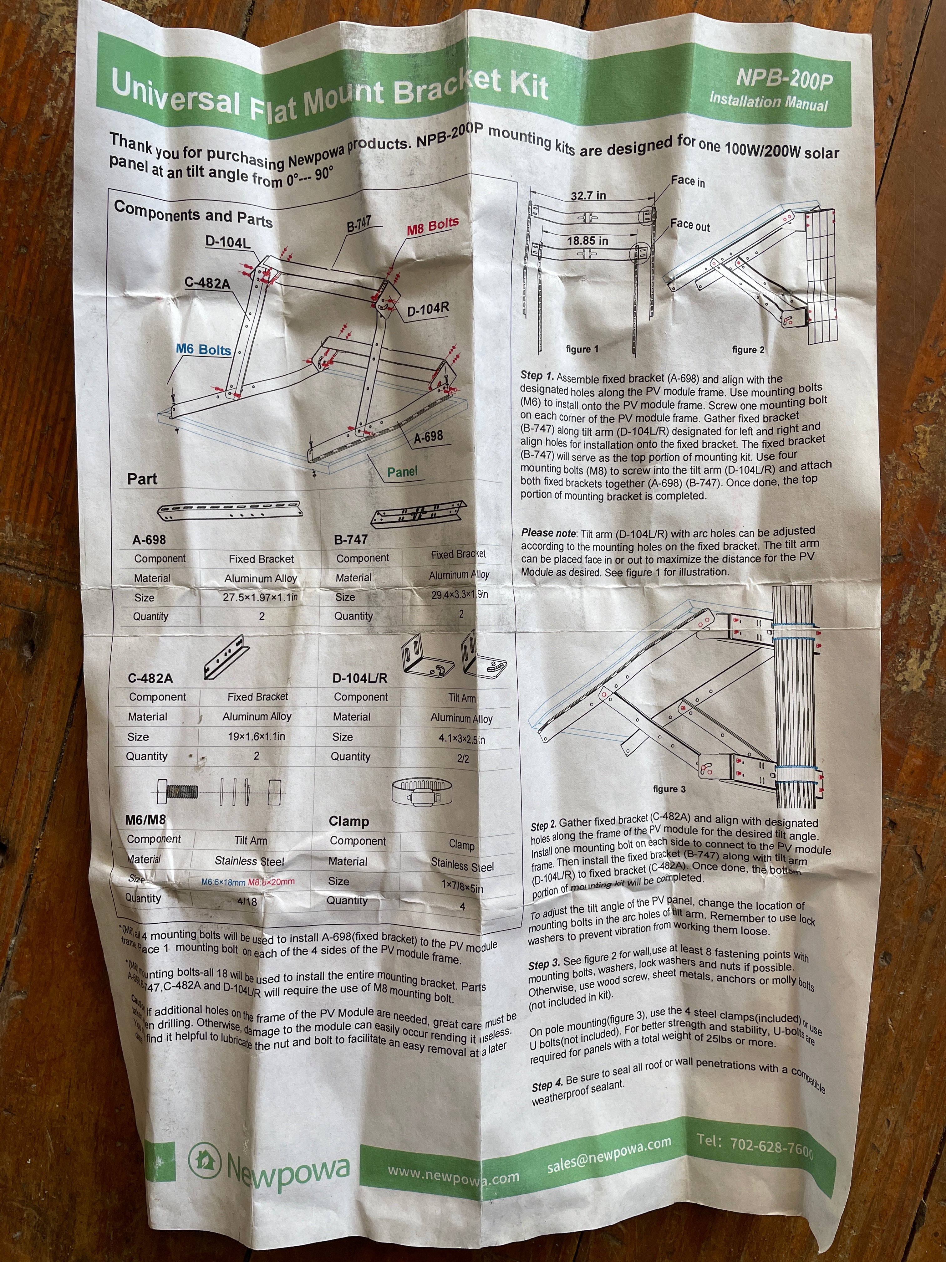 Brand new solarland USA universal flat mount solar panel bracket. Model # NPB-200P. The longest bracket is 29 1/2” long x 3 1/2” wide. Comes with all hardware and the instruction book on how to put it together. It looks like all the pieces are there.