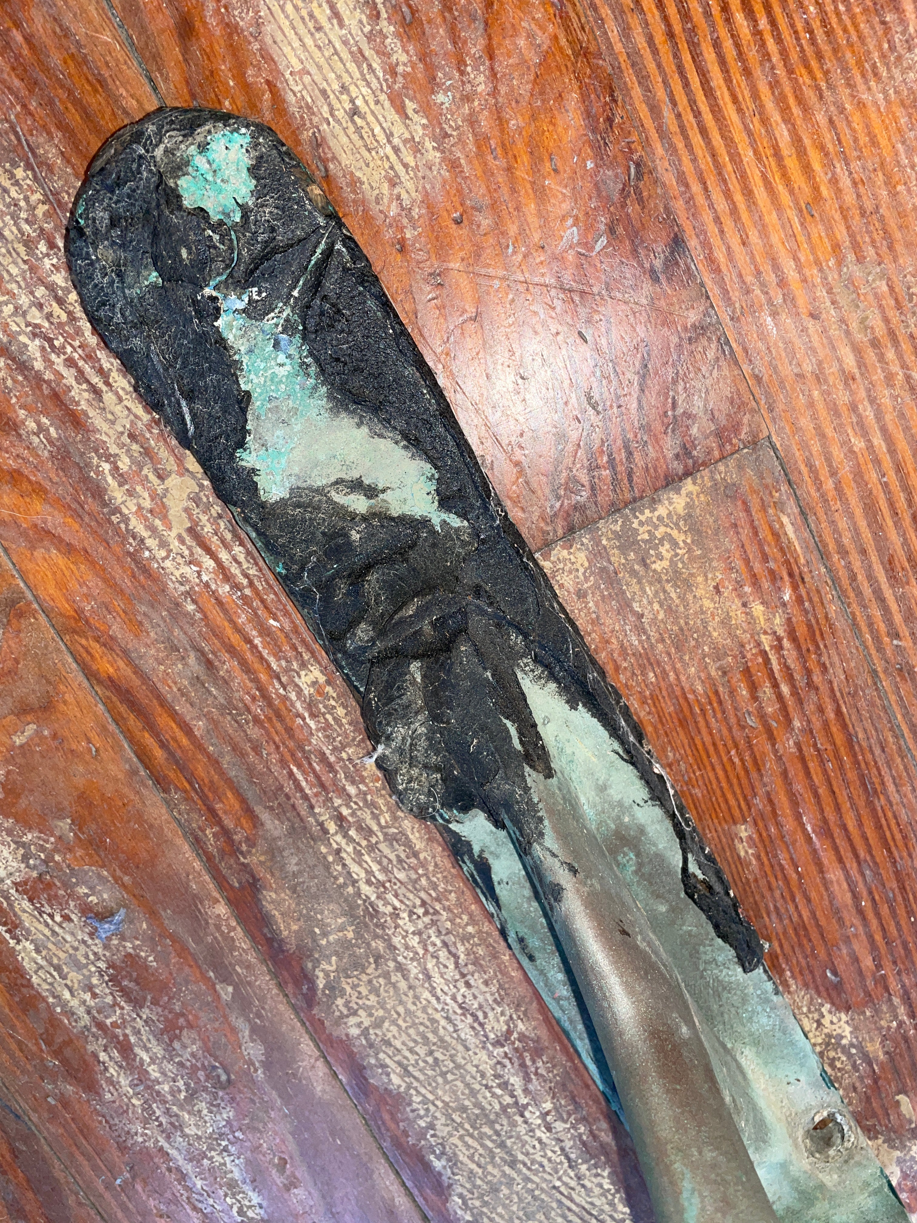 This dolphin swim platform bracket is so unique! This was removed off a 1964 pacific coast trawler made in Hong Kong. The top bracket is 18 3/4” long with 4 bolt pattern. The other bracket is 12” long with 3 bolt pattern. The black stuff should easy to remove (looks to be a caulk of some kind).