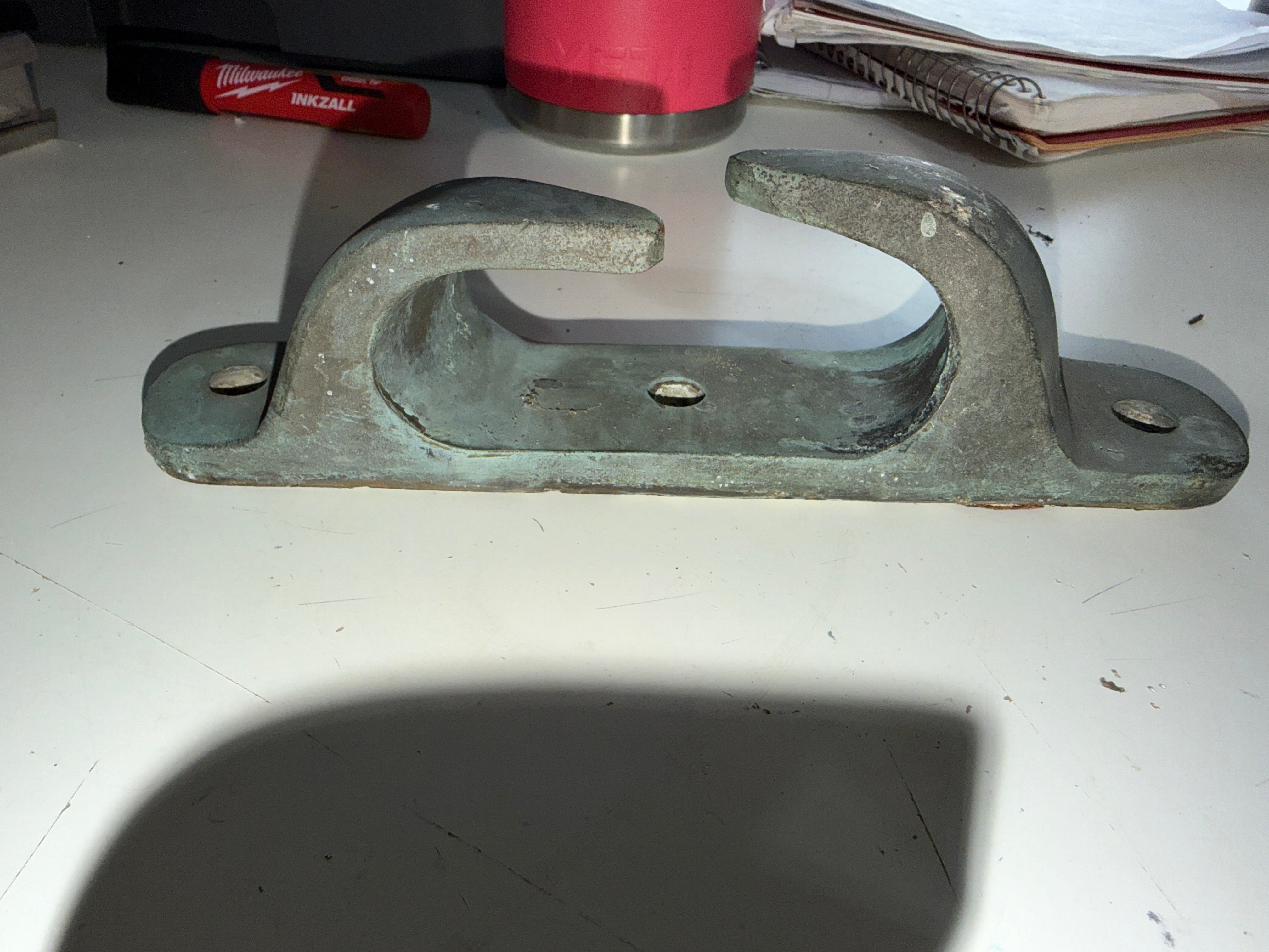 This pair of solid bronze chock cleats are in great condition. usual signs of wear but overall look great. They measure 9 1/2" total length. The width for line is 1 3/8". The cleats stand2 3/8" tall. These are the 3 bolt install that is 4 1/8" apart. The width of the base of the cleat is 1 5/8".