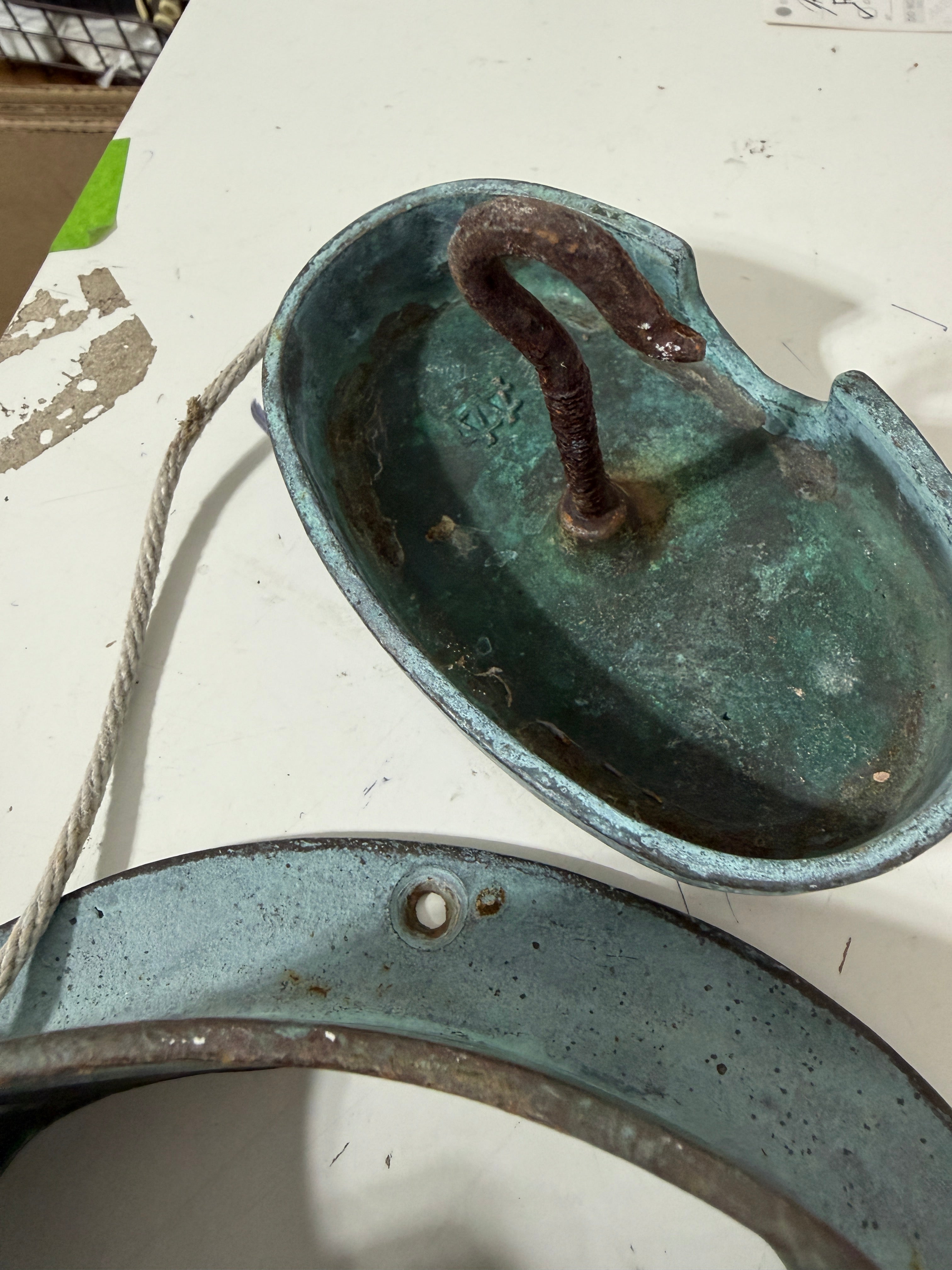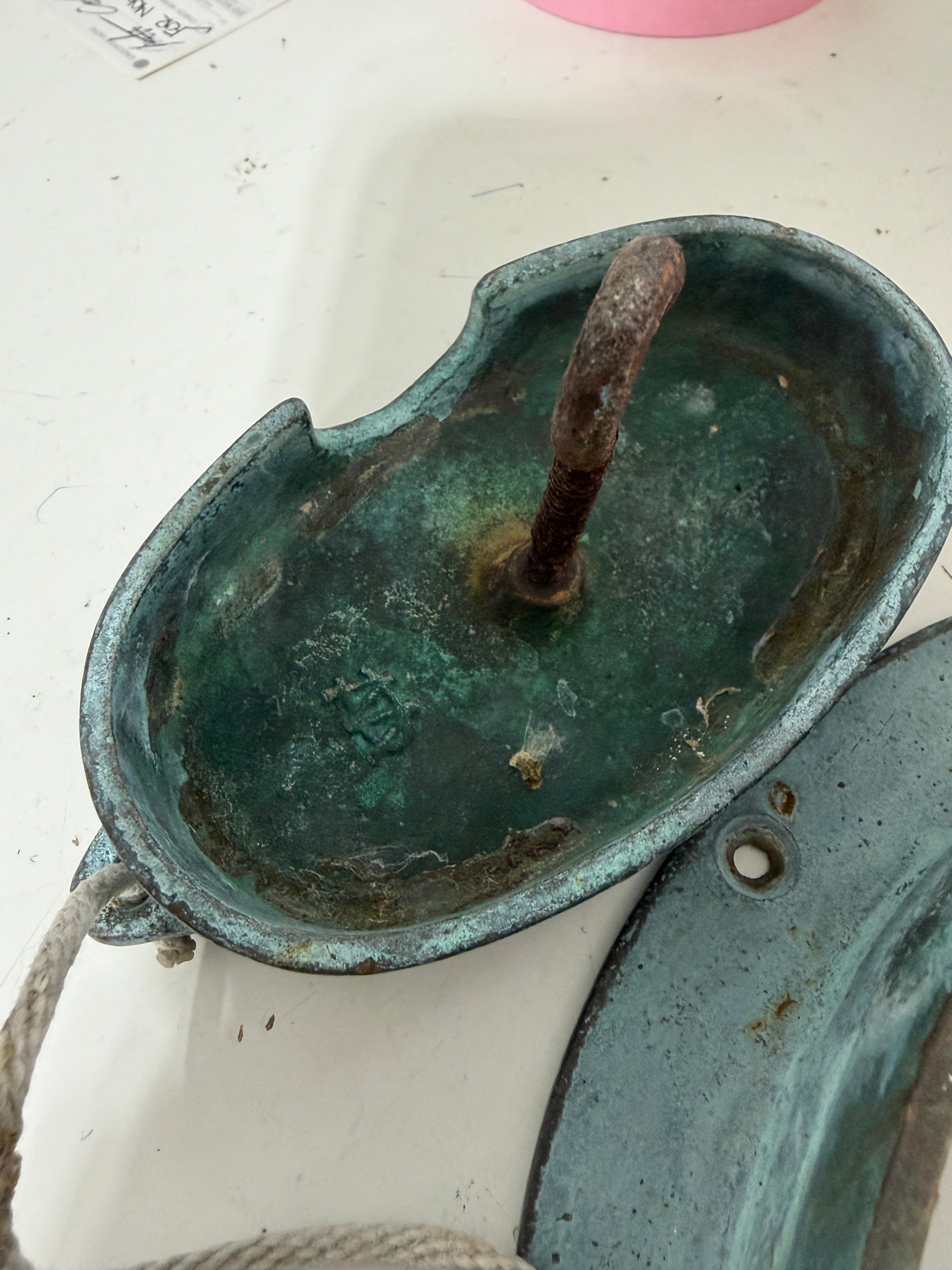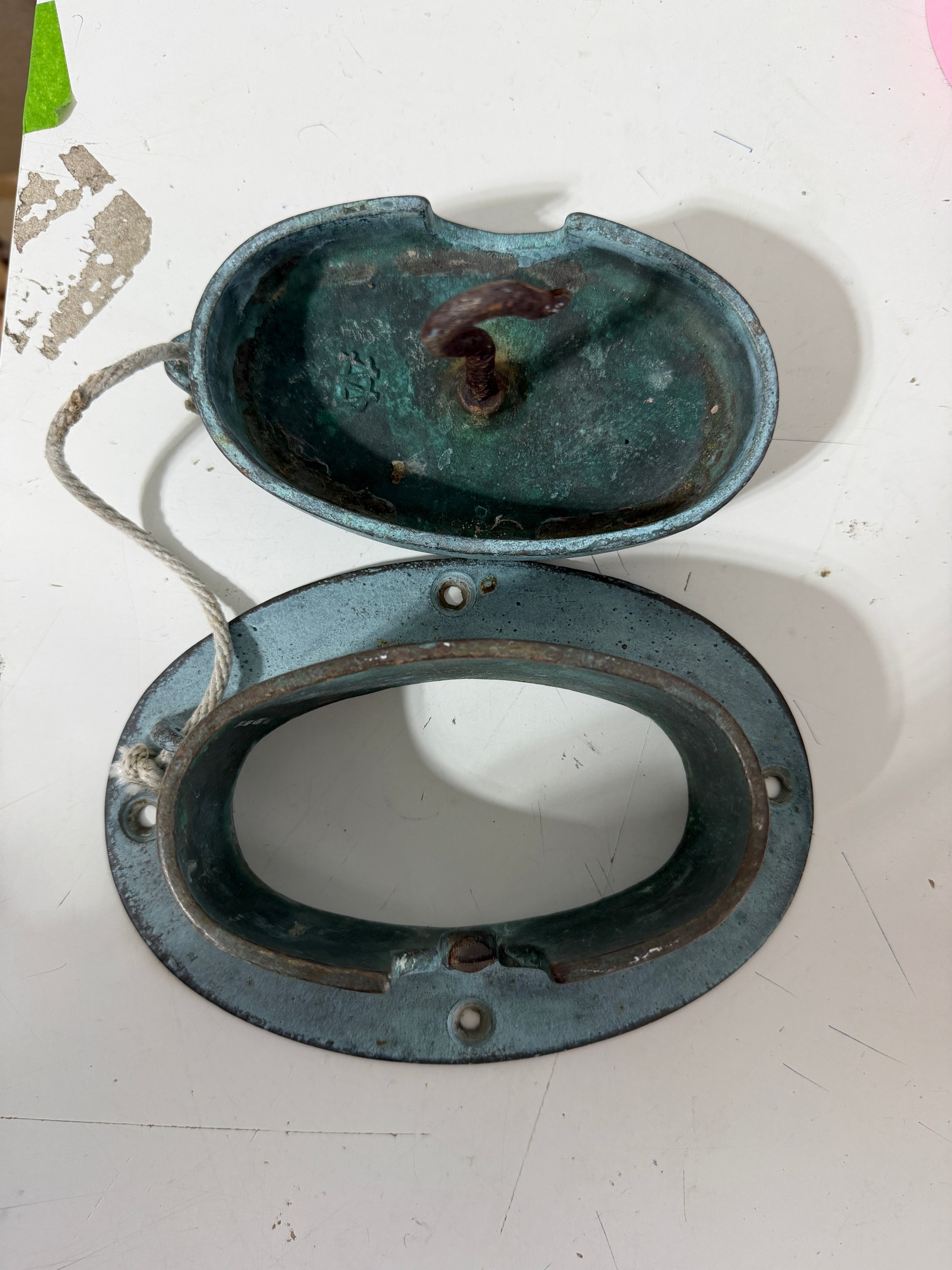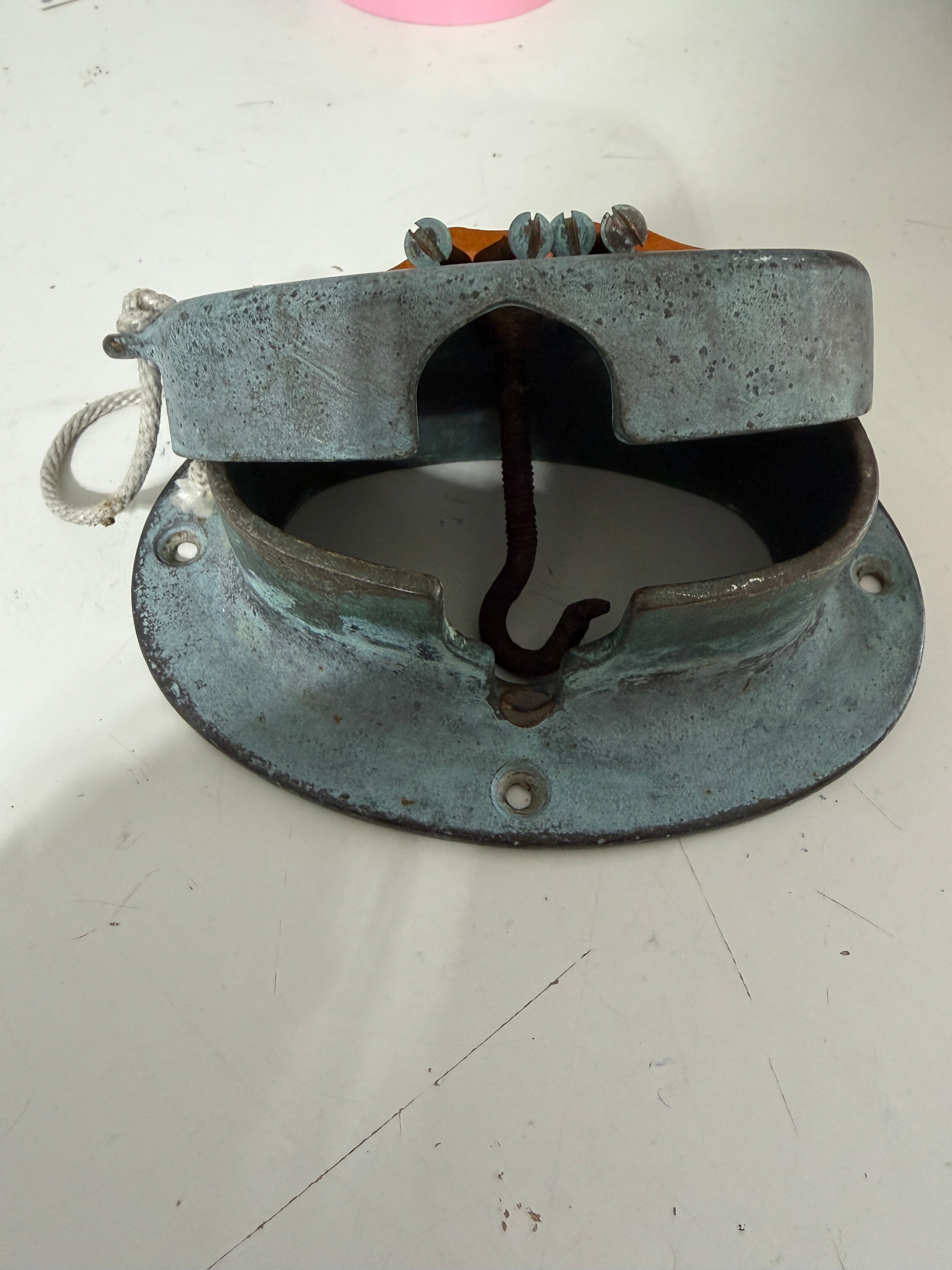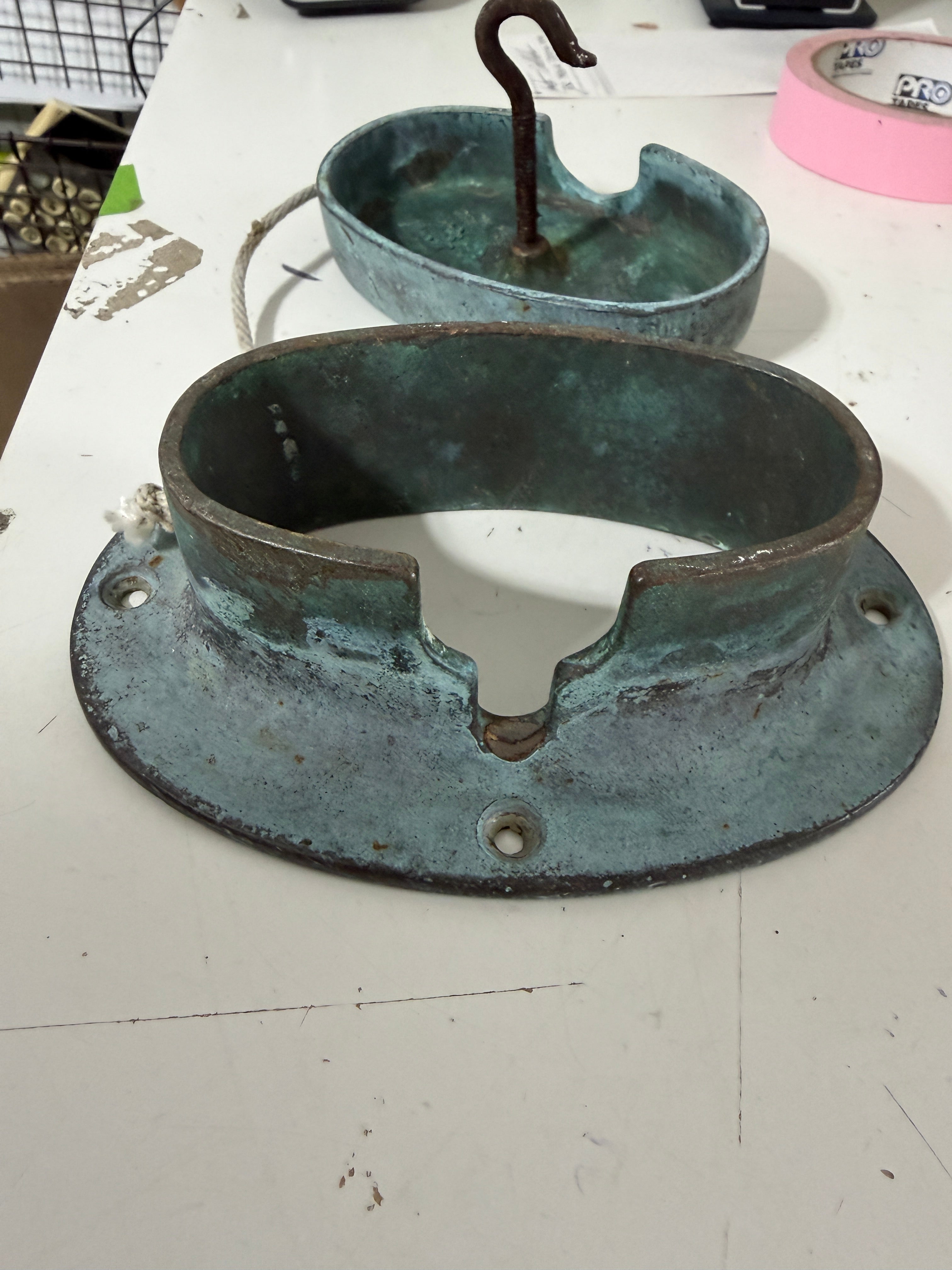 Excellent condition. Originally came off a Grand Banks. Solid bronze. Heavy duty wilcox crittenden. The overall outside diameter is 6 1/2" long x 4 5/8" wide. The inside diameter of the base is 4 1/4" long x 2 1/4" wide. The hole for line is 1 1/8" x 1 1/2" overall length of the hole. Has the hook - though rusty looking it is solid. Comes with screws.