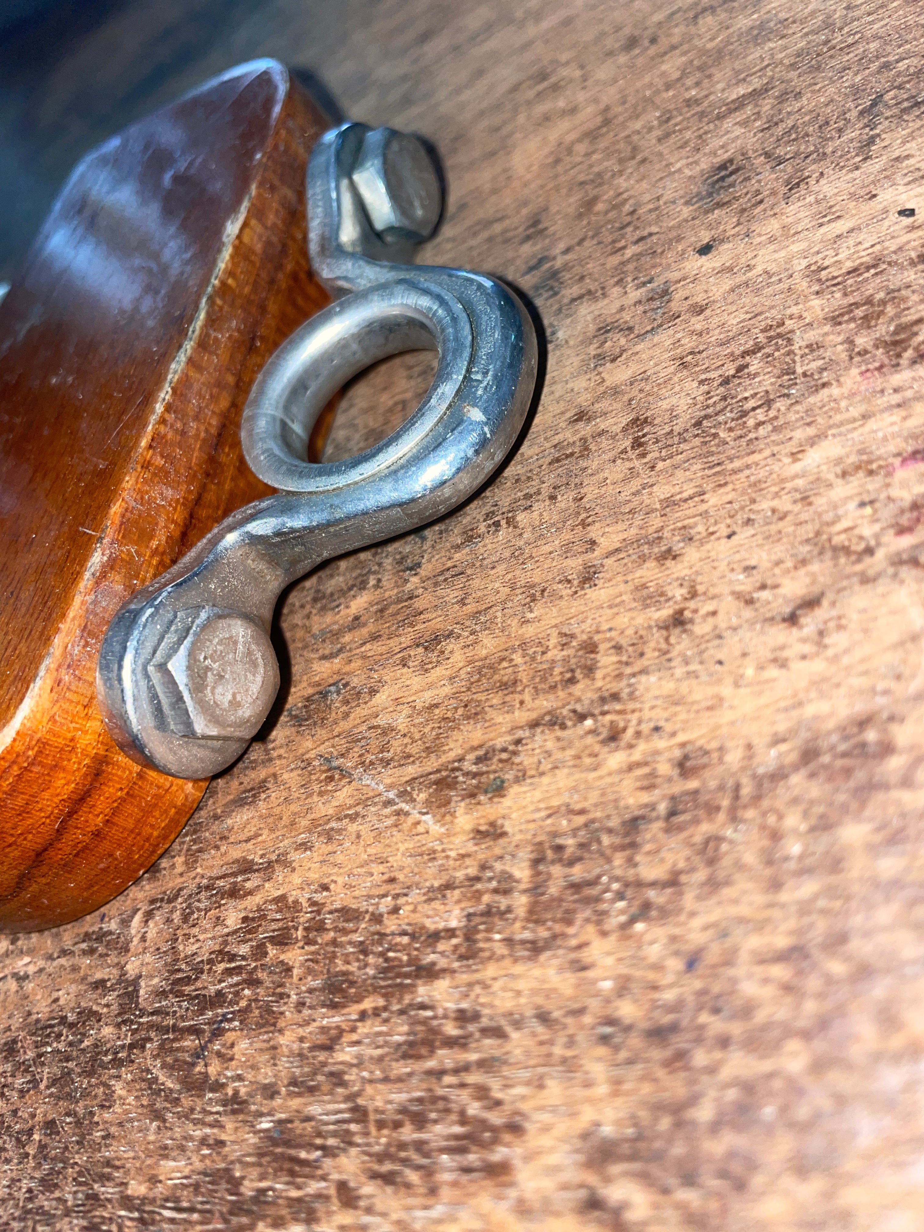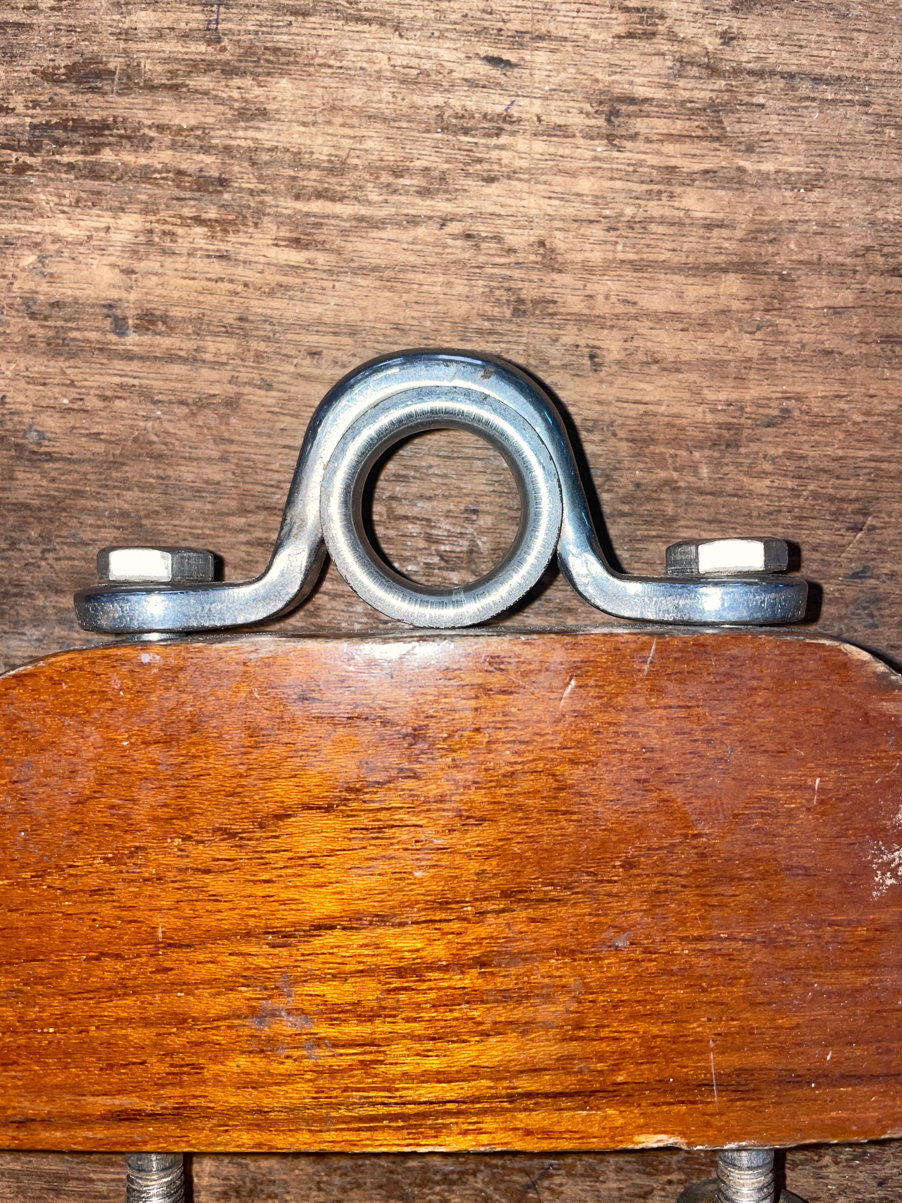 This SS Fairlead has a 11/16” eye. The wood mounting block is 4 1/4” long x 7/8” wide x 2” tall. Comes with hardware.