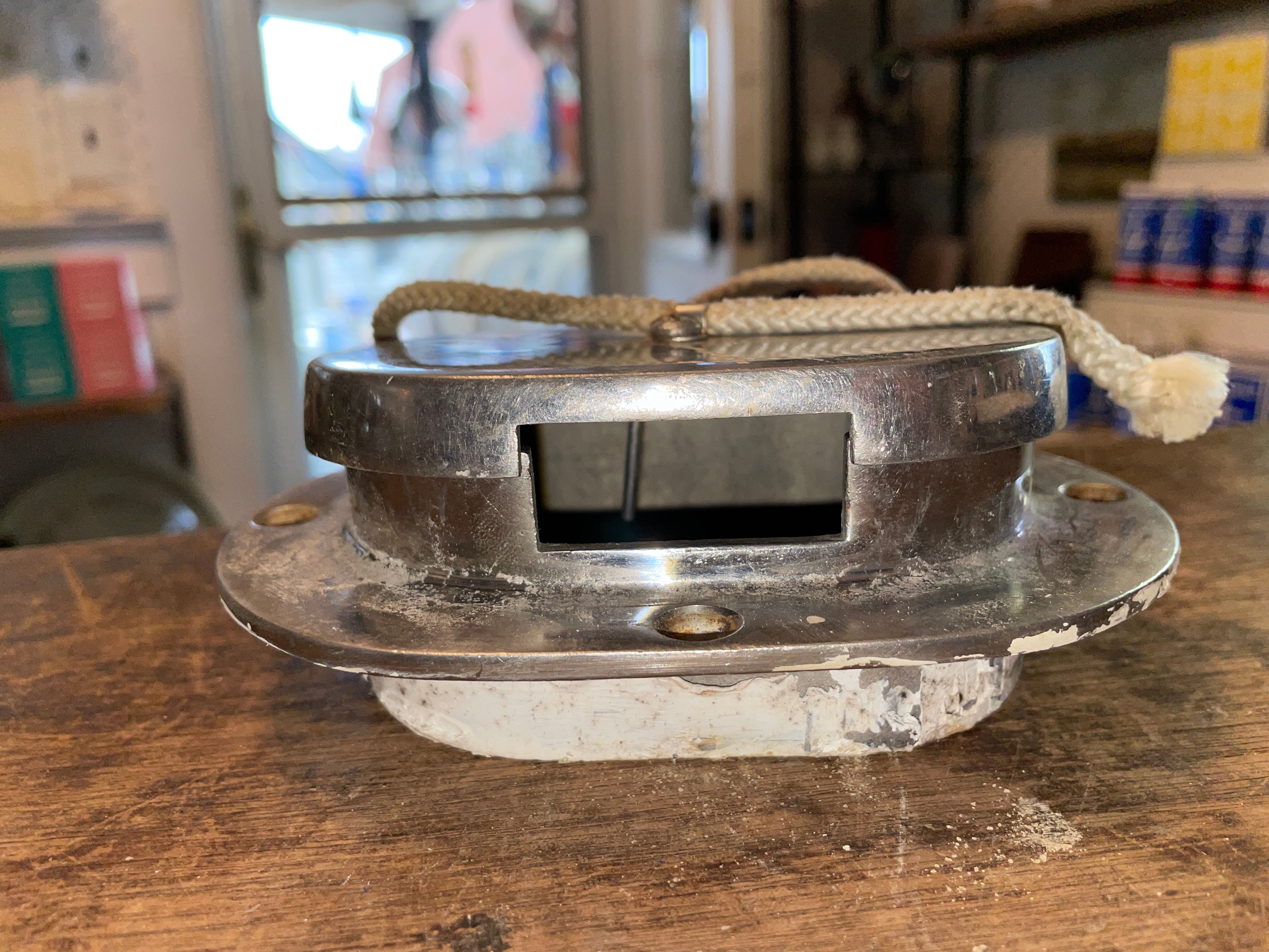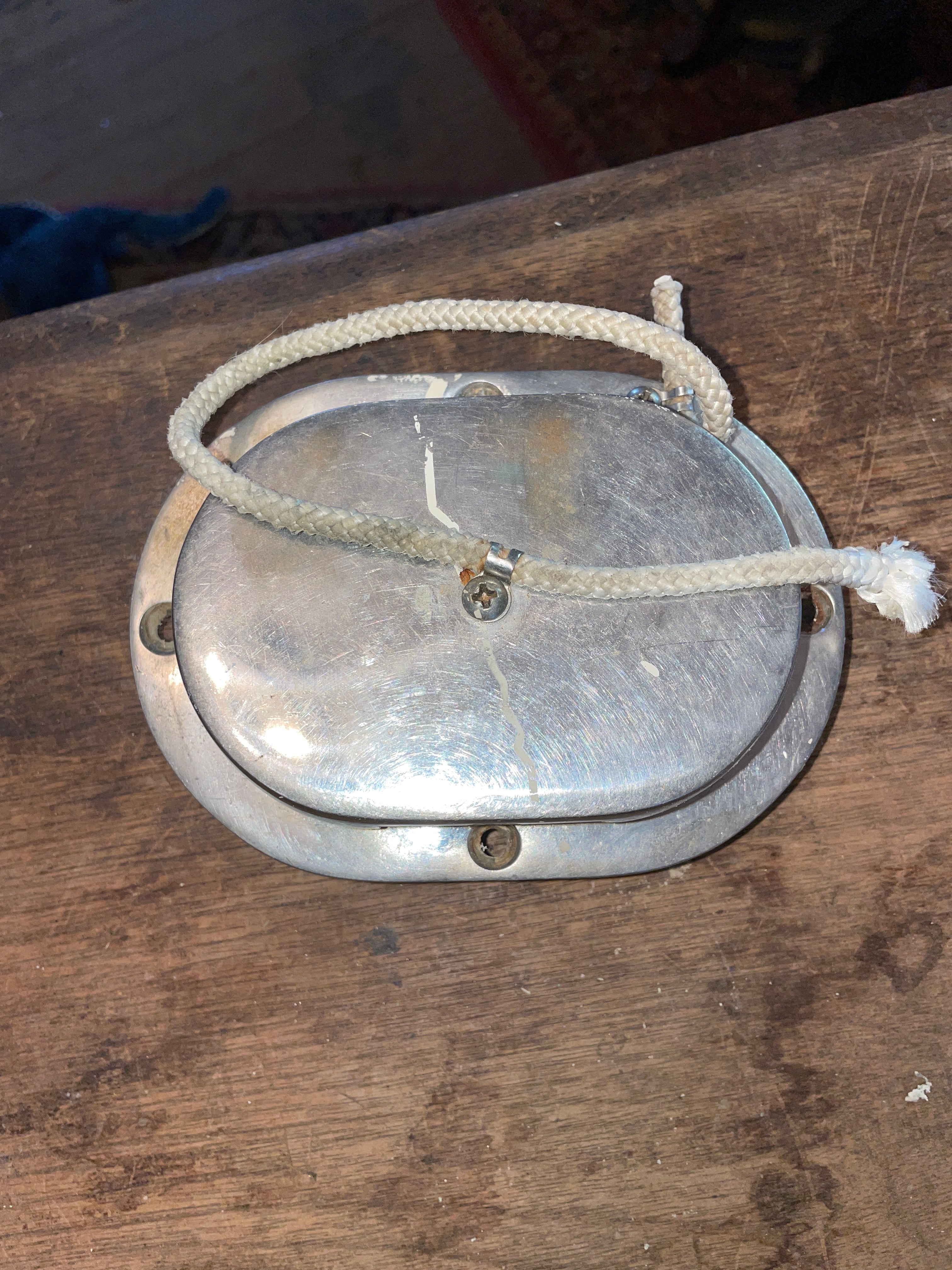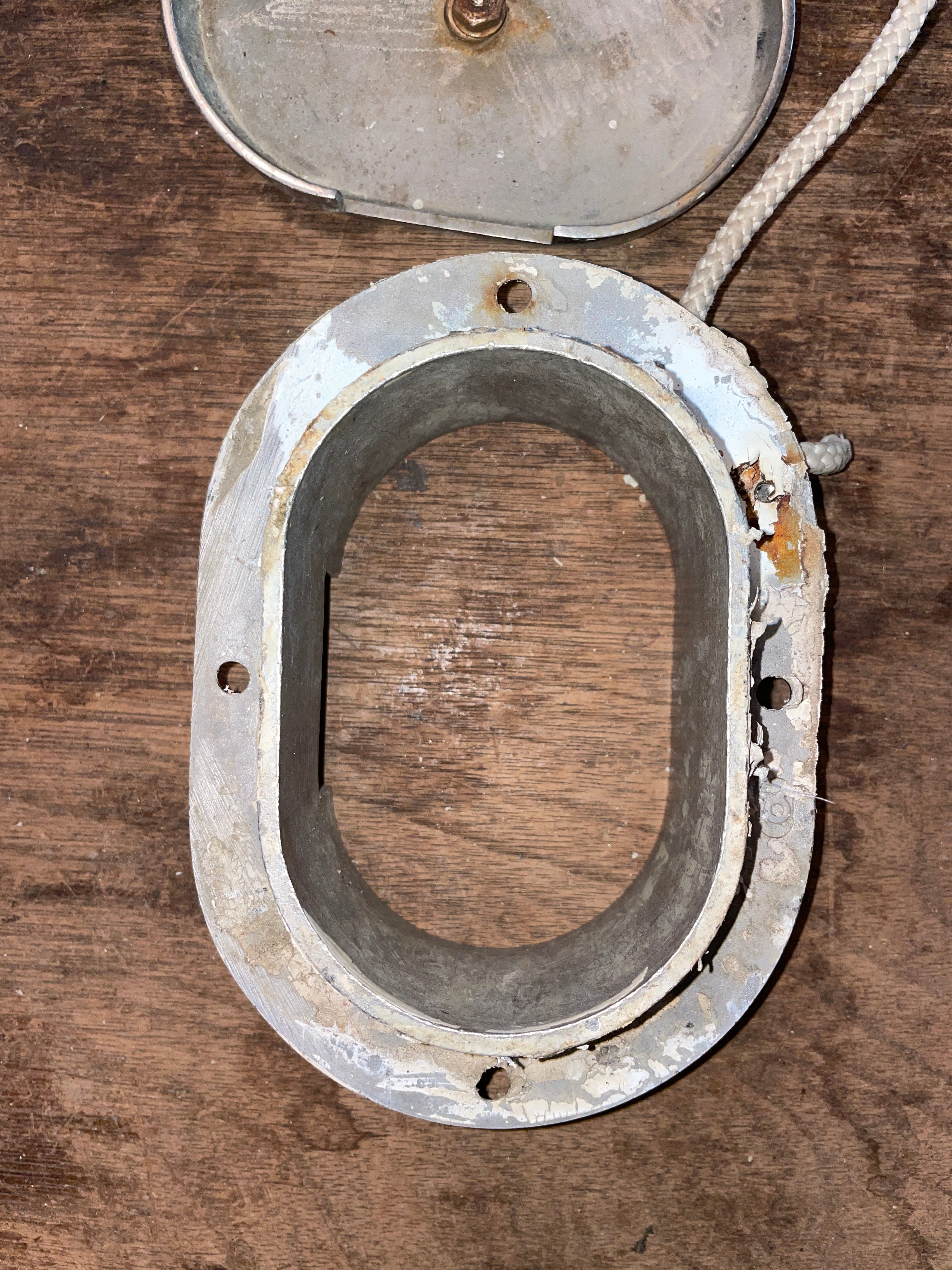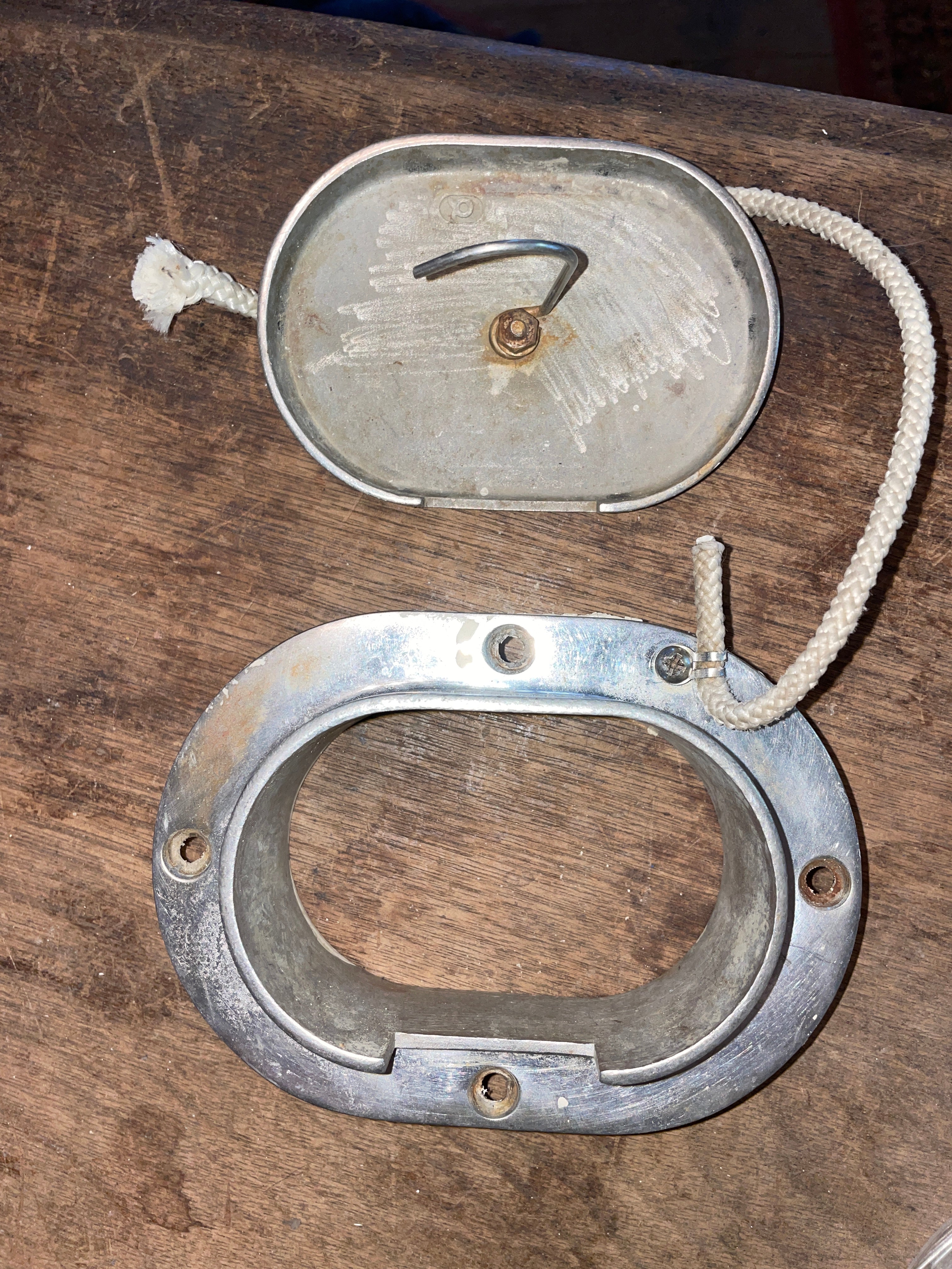 This stainless steel anchor Hawse is in great condition. The ID of it is 4 1/8” long x 2 7/8” wide. The OD of the anchor Hawse is 5 3/4” long x 4” wide and stands 2” tall. Has the hook. The lid is on by a piece of line. Gap for anchor and line with the lid on is 1 1/2” long x 7/16” wide.