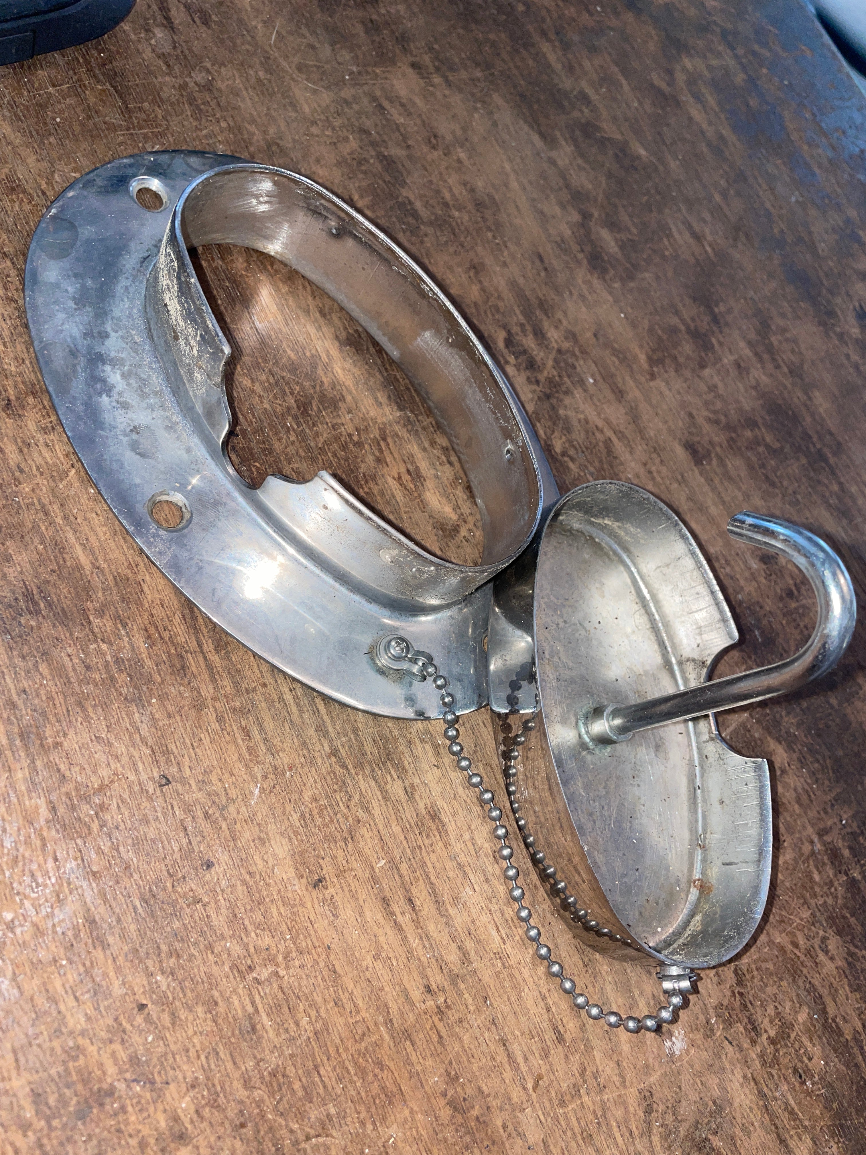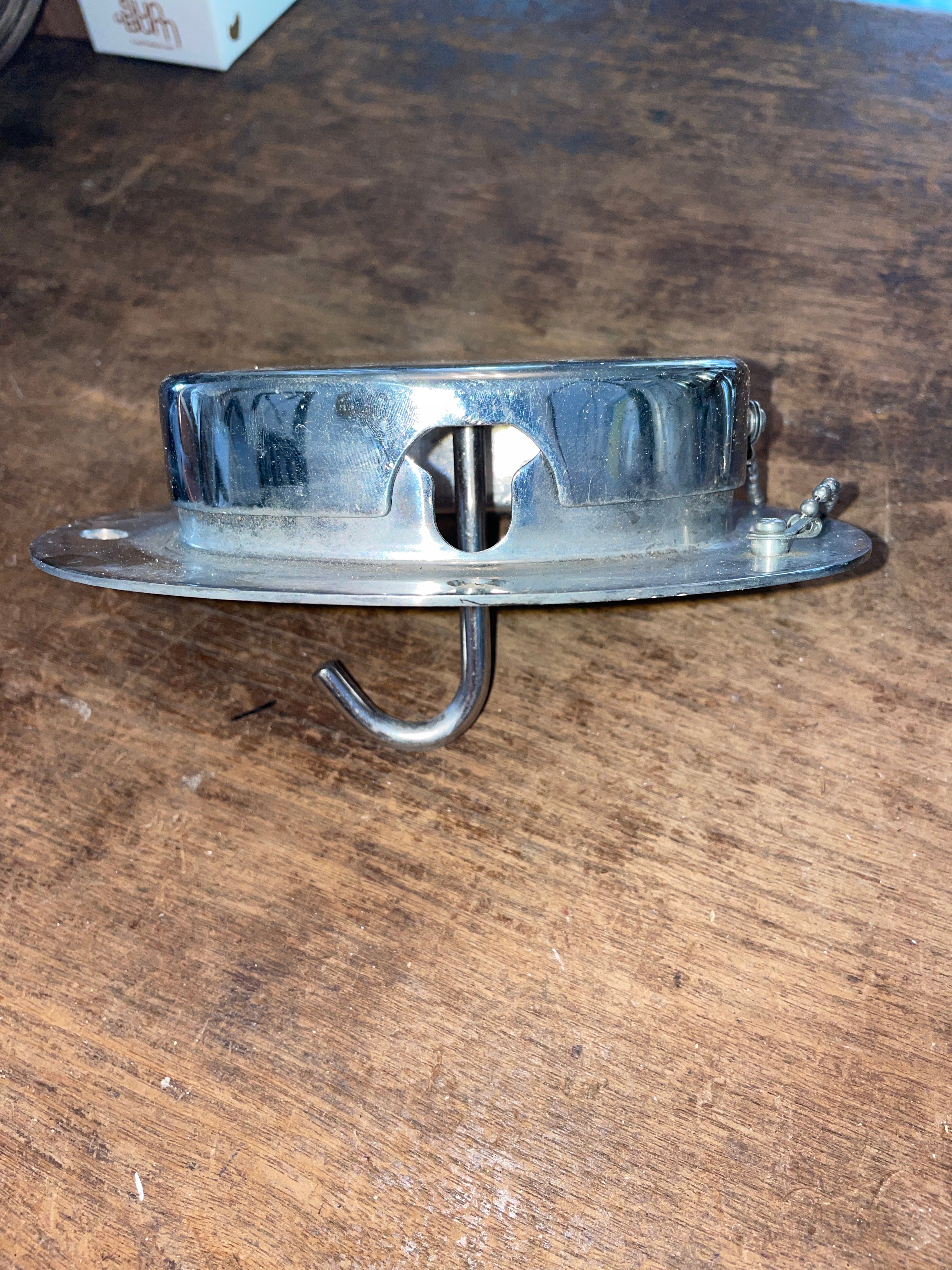 This stainless steel anchor Hawse is in great condition. Hook and chain still intact. The ID of the hole is 4 1/4” x 2 1/4”. OD is 6 1/4” x 4 1/2”. 4 Bolt install.