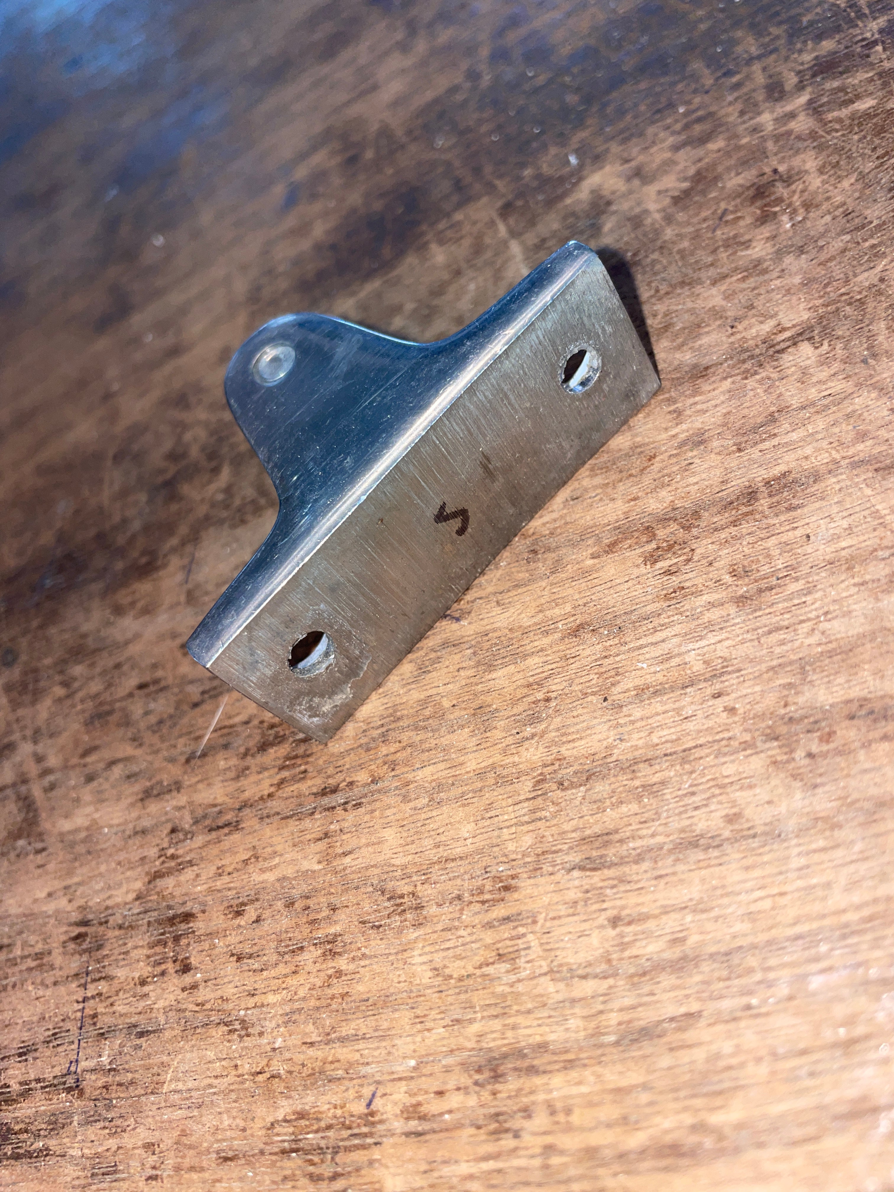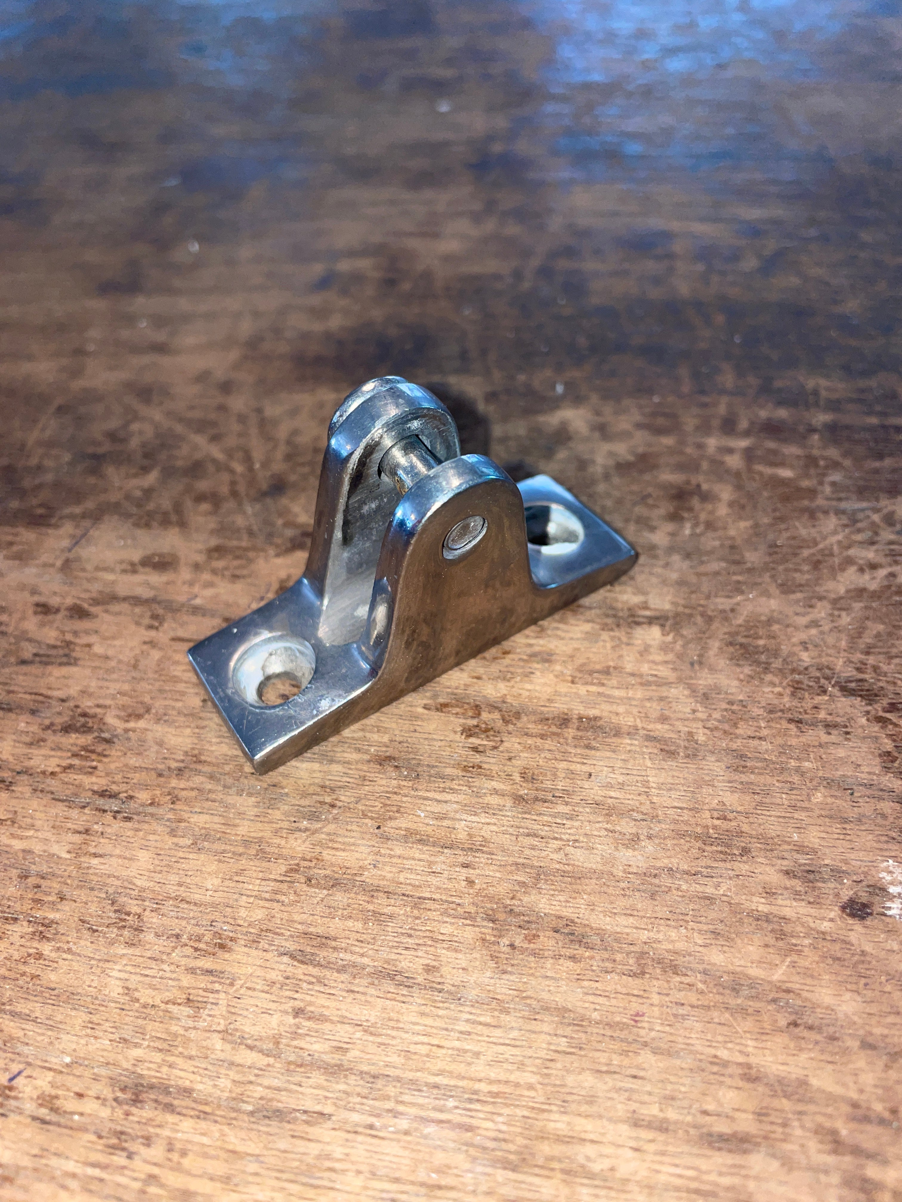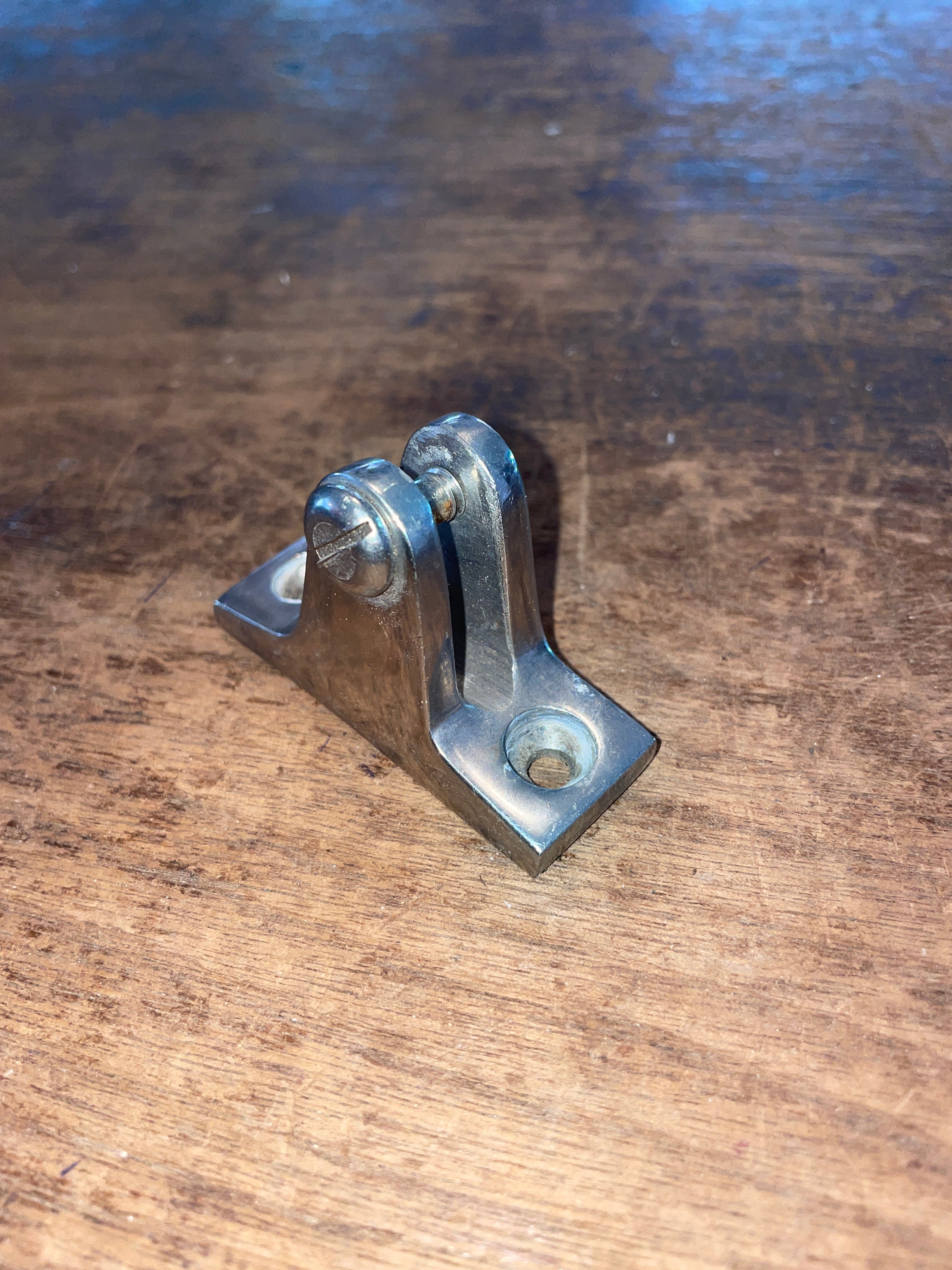 Great condition, stainless steel angled mount plate. Base measures 2 1/4” long x 1/2” wide. Width diameter is 1/4”. Comes with bolt.