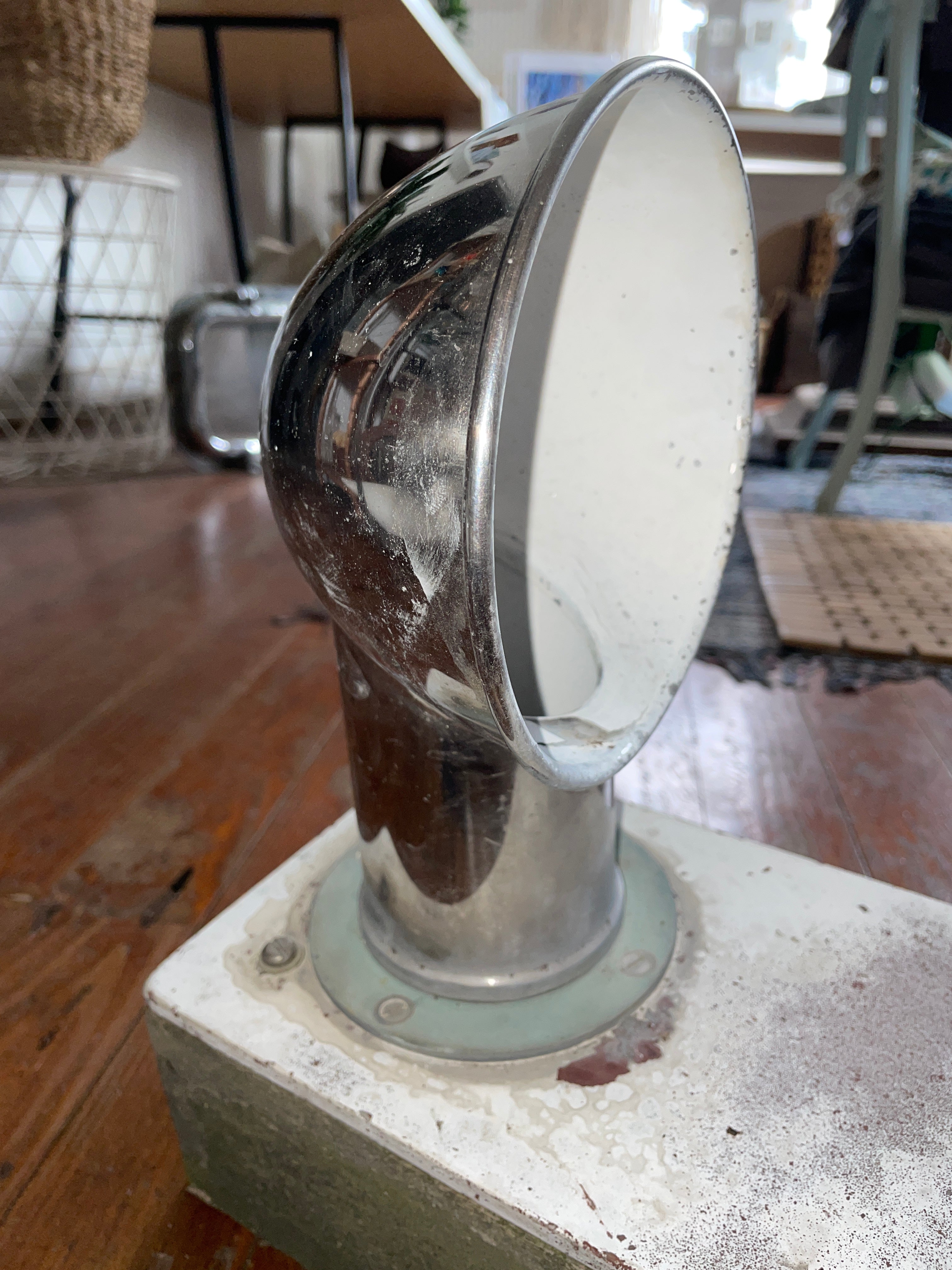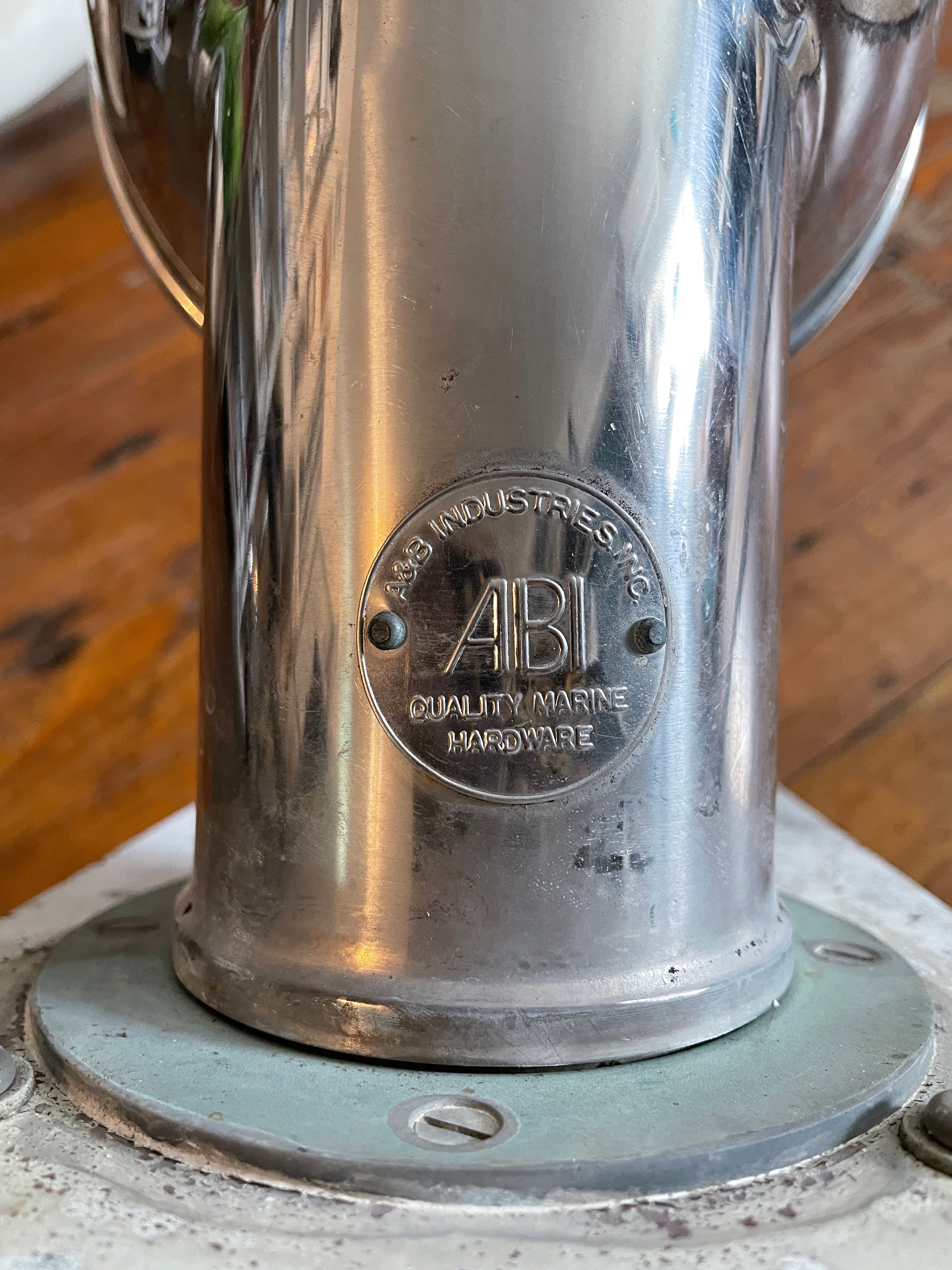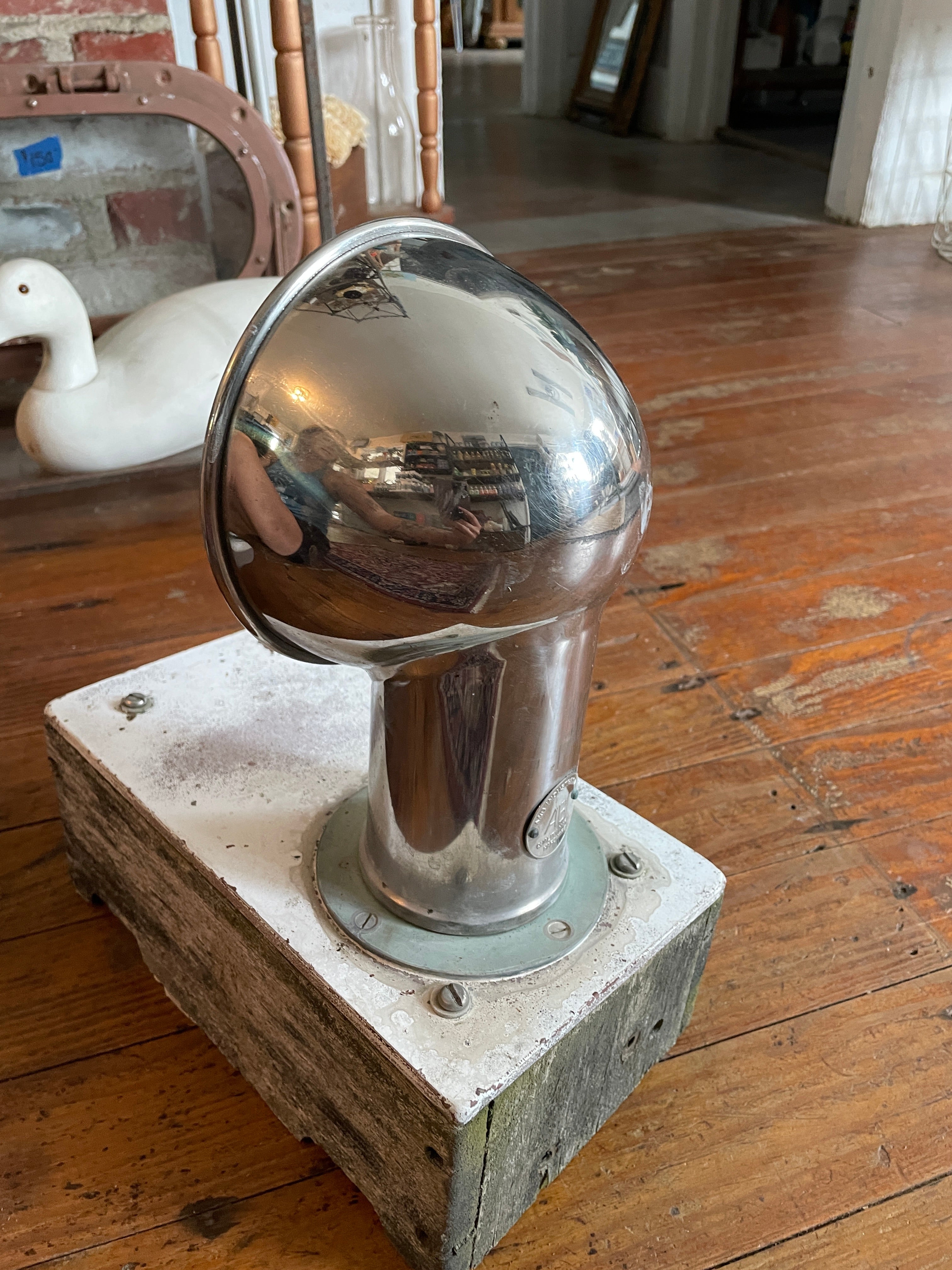 This stainless steel ABI Dorade vent is in good condition. The inside has been painted and that is coming off. The base of the vent is 2 7/8” diameter. It stands 9 1/4” tall. Mouth of vent is 6”. Comes with vent, bronze base and mounting block if you want it. If not we can removed. (Price will not vary). Mounting base is slanted, 11 1/2” long x 6 1/4” wide x 4 1/2” tallest side (3 3/4” shorter side).
