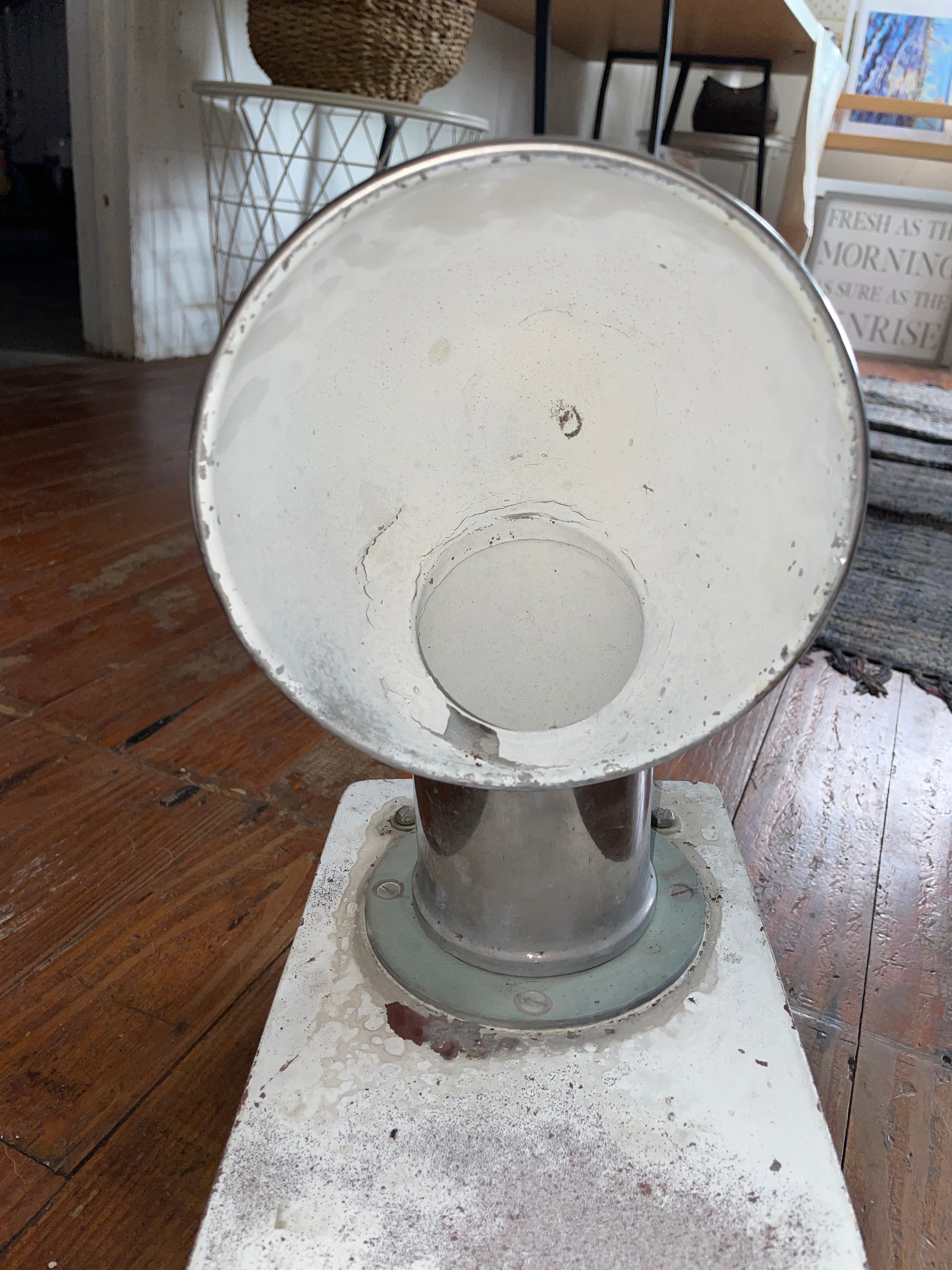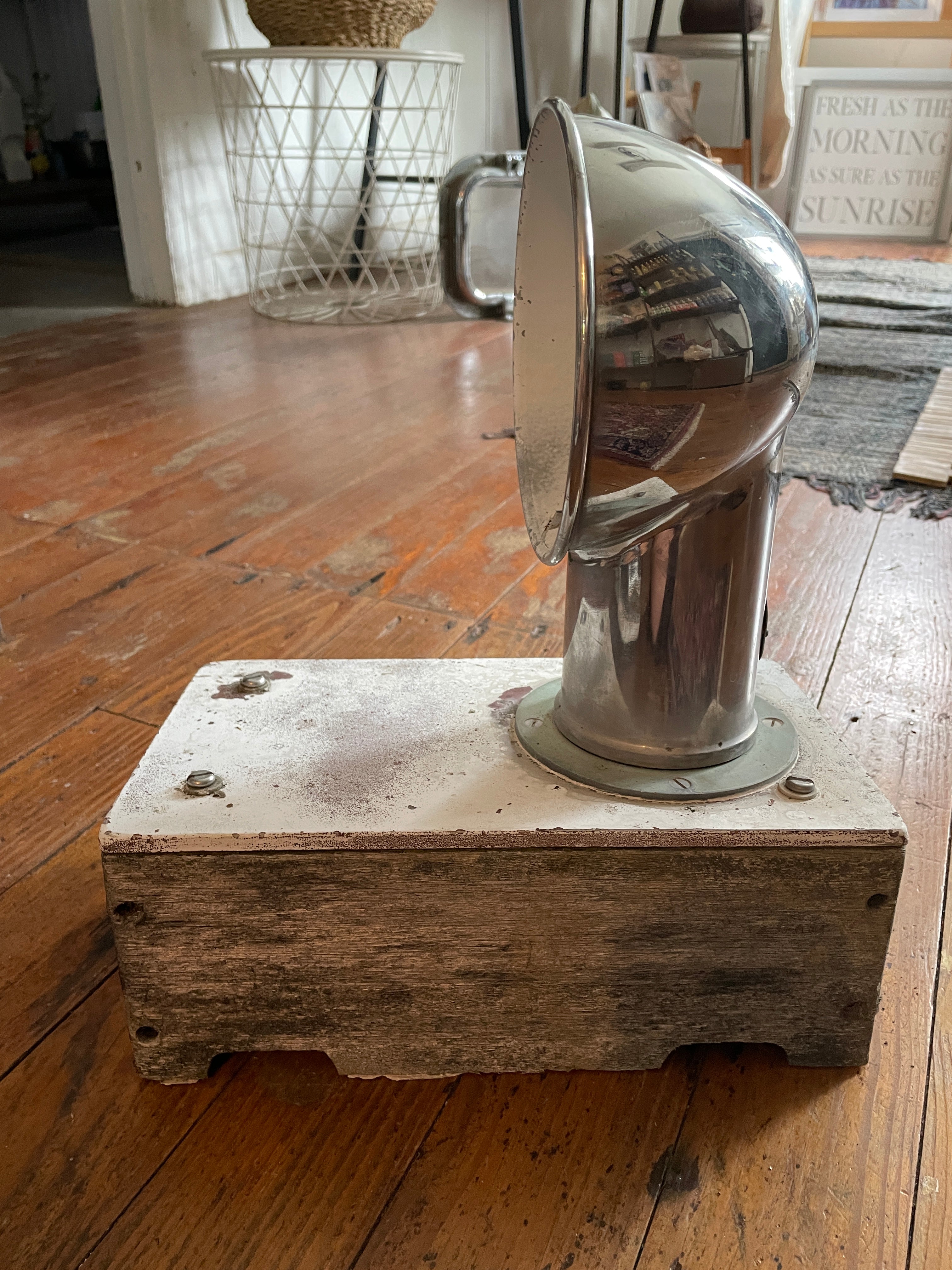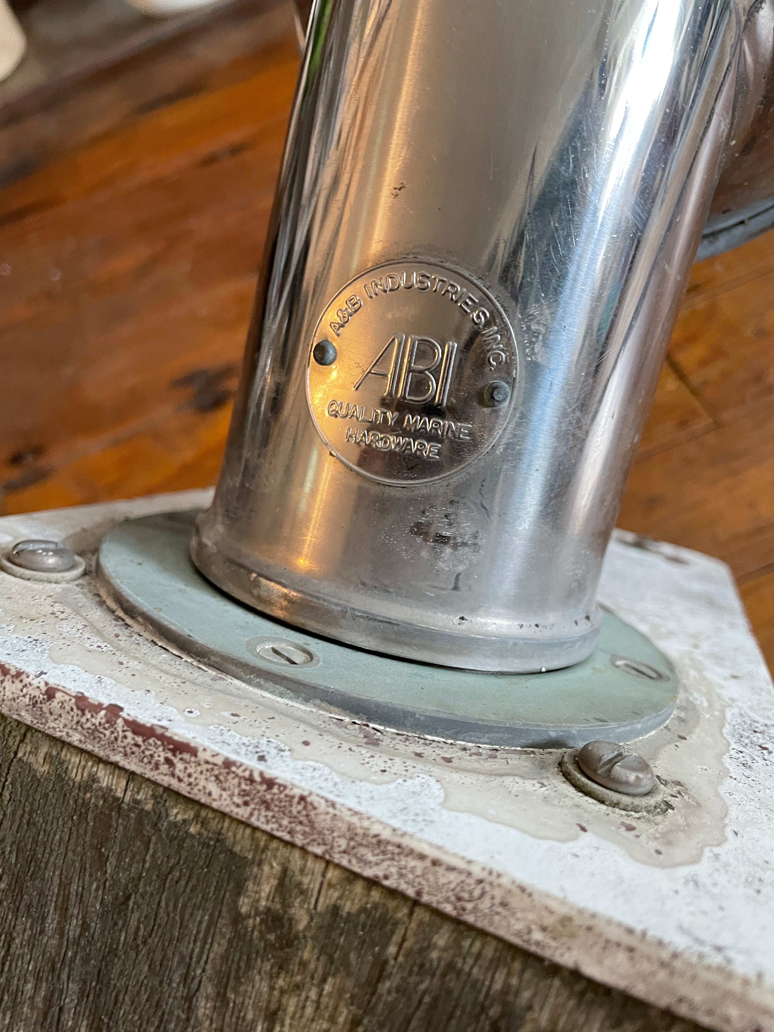 This stainless steel ABI Dorade vent is in good condition. The inside has been painted and that is coming off. The base of the vent is 2 7/8” diameter. It stands 9 1/4” tall. Mouth of vent is 6”. Comes with vent, bronze base and mounting block if you want it. If not we can removed. (Price will not vary). Mounting base is slanted, 11 1/2” long x 6 1/4” wide x 4 1/2” tallest side (3 3/4” shorter side).