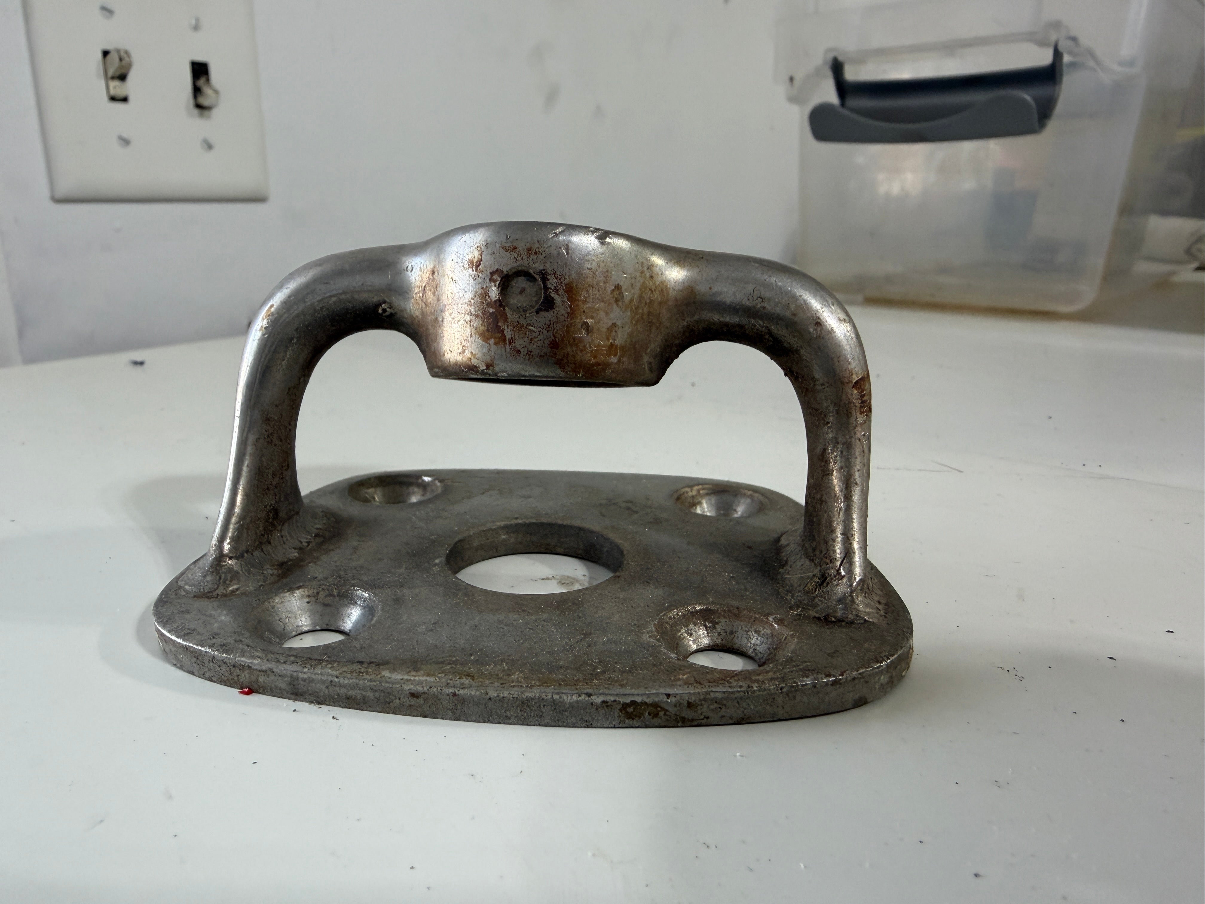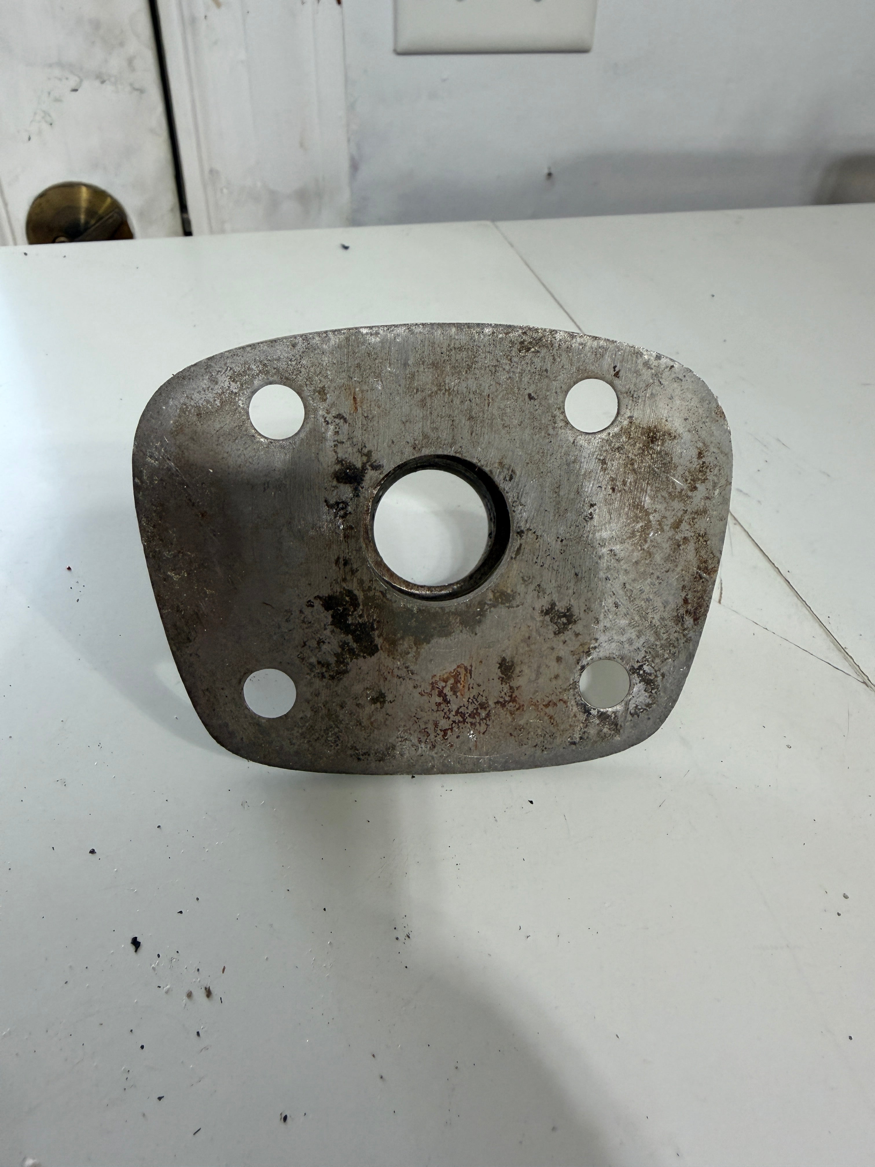 This stainless steel angled "floating" stanchion base is in good condition. Fits 1" diameter tubing. The base is a trapezoid shape. The longer side is 3 7/8" and the short is 3 1/4" x 3" wide at the middle. The bolt holes are 2" x 1 7/8" apart. Stands 2" tall.