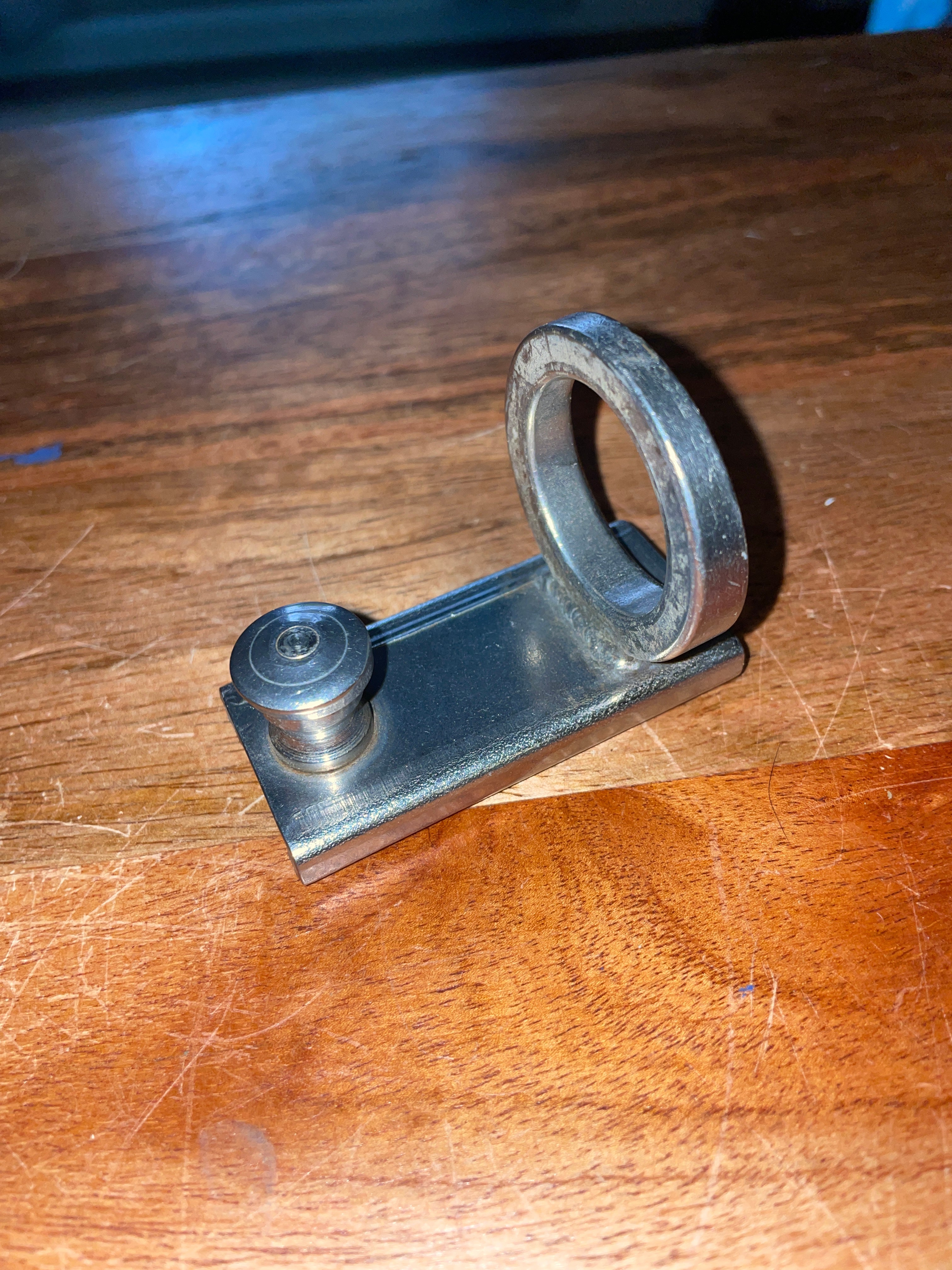 This stainless steel pull top track car is in great condition. It fits for a 1” track size. The ring is 1 1/8” diameter. This car is 2 1/2” long and stands 2” tall.