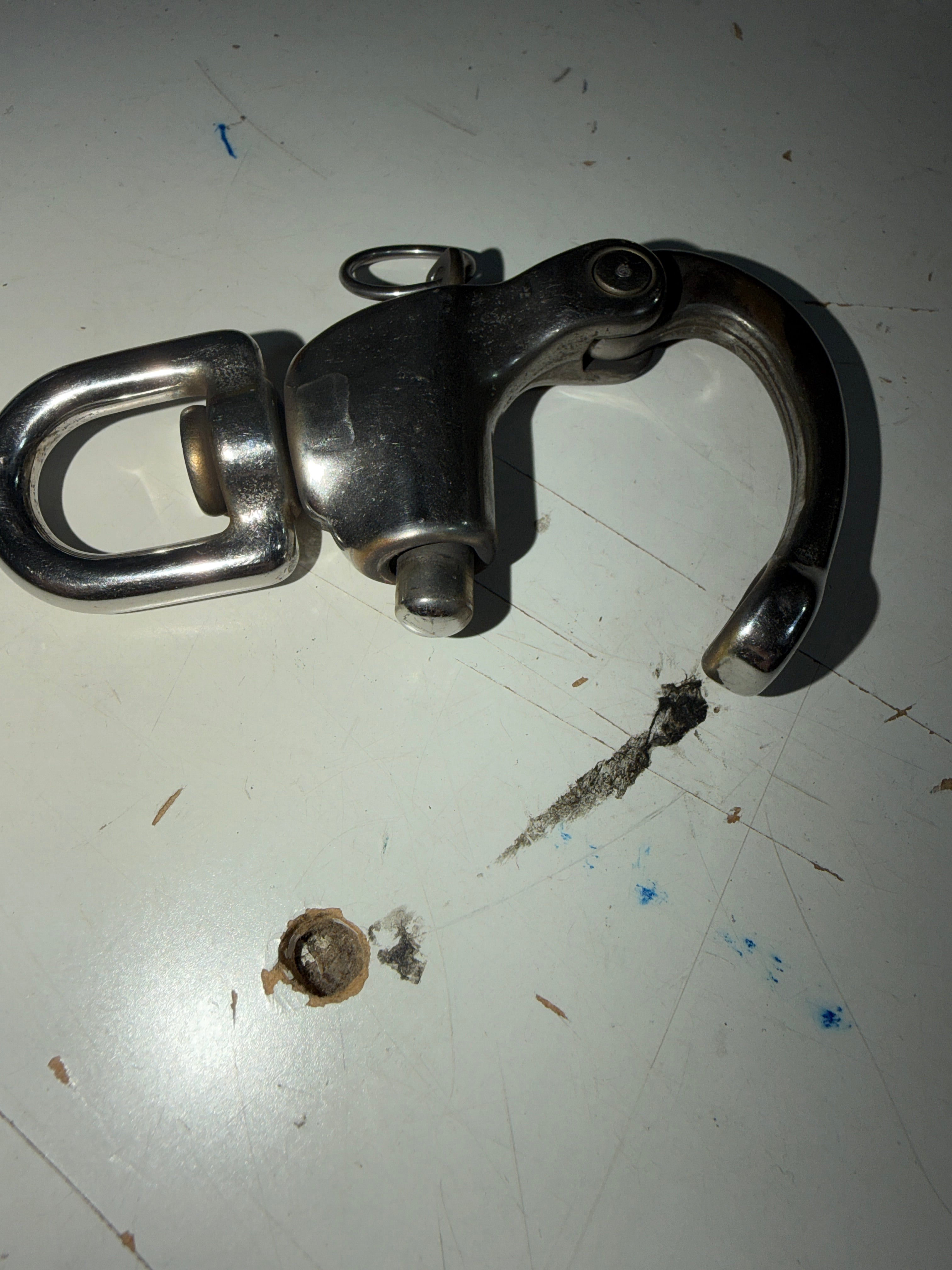 This stainless steel swivel bail shackle is in good condition. Works as should. The bail is 5/8" x 5/8". 3 1/2" total length.