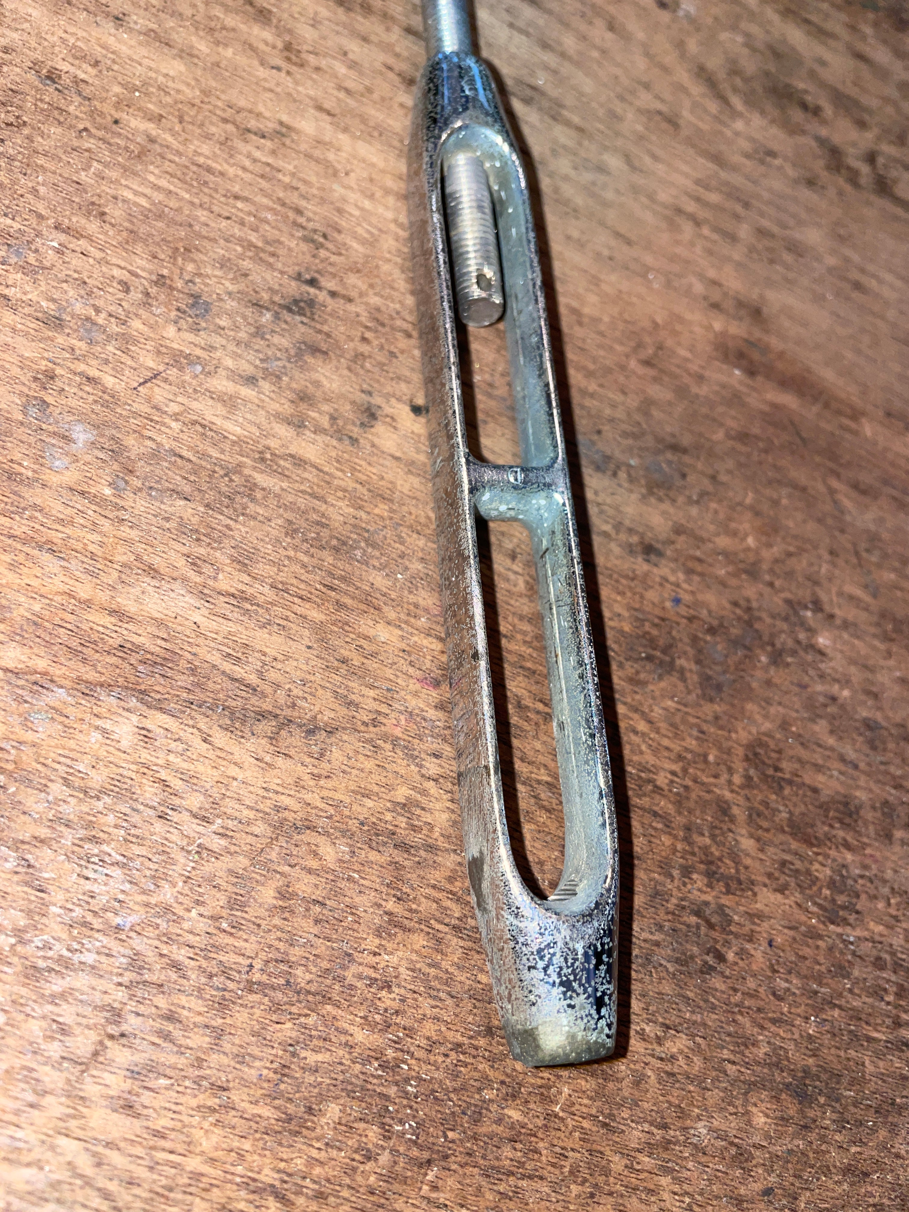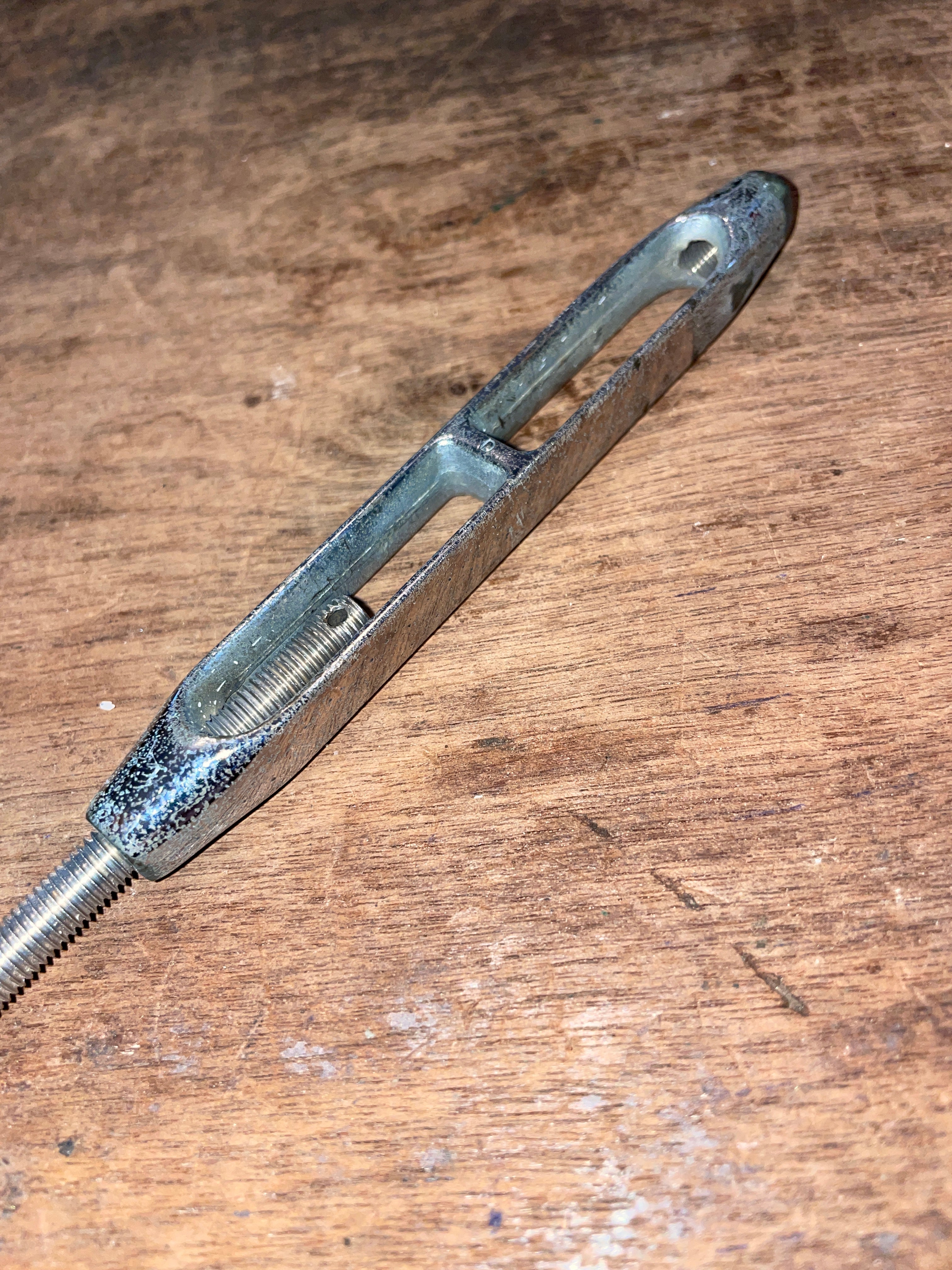 This small stainless steel turnbuckle is in good condition. The open body is 4 1/2” length x 5/8” width. Will come with the T bolt and shackle. The rod is 1/4” diameter. The pin for the shackle is also 1/4” diameter. Some pitting but otherwise good condition.