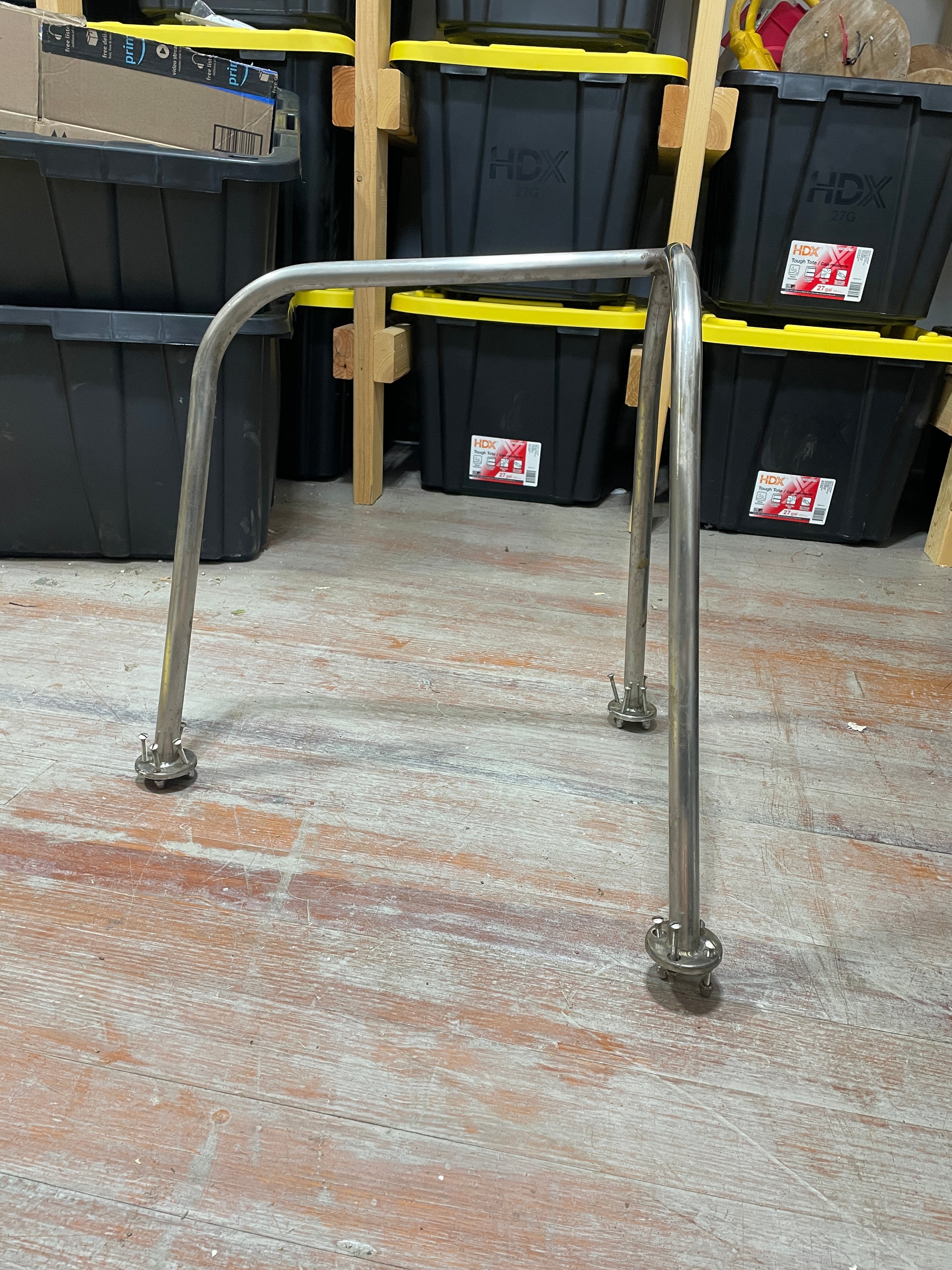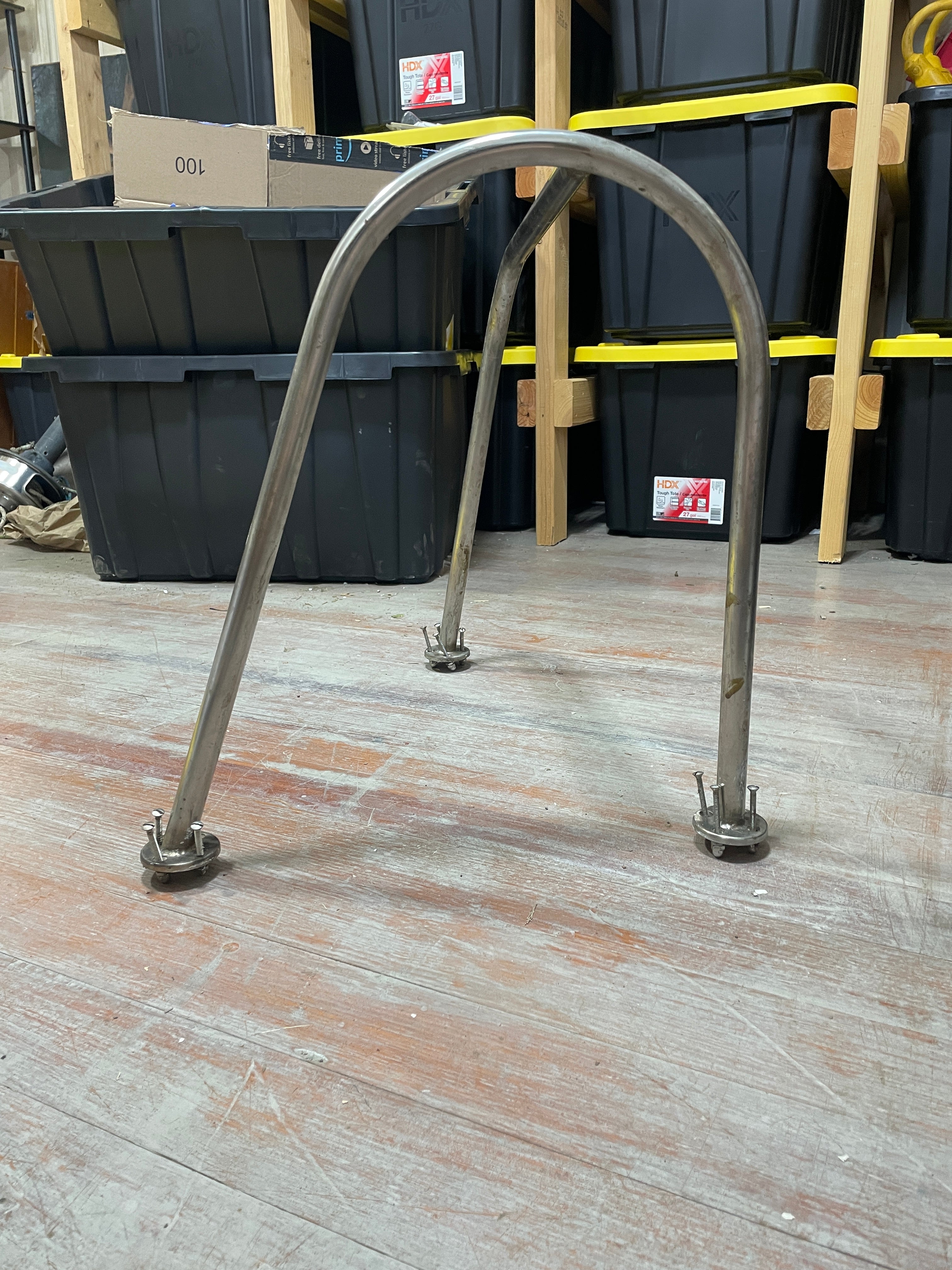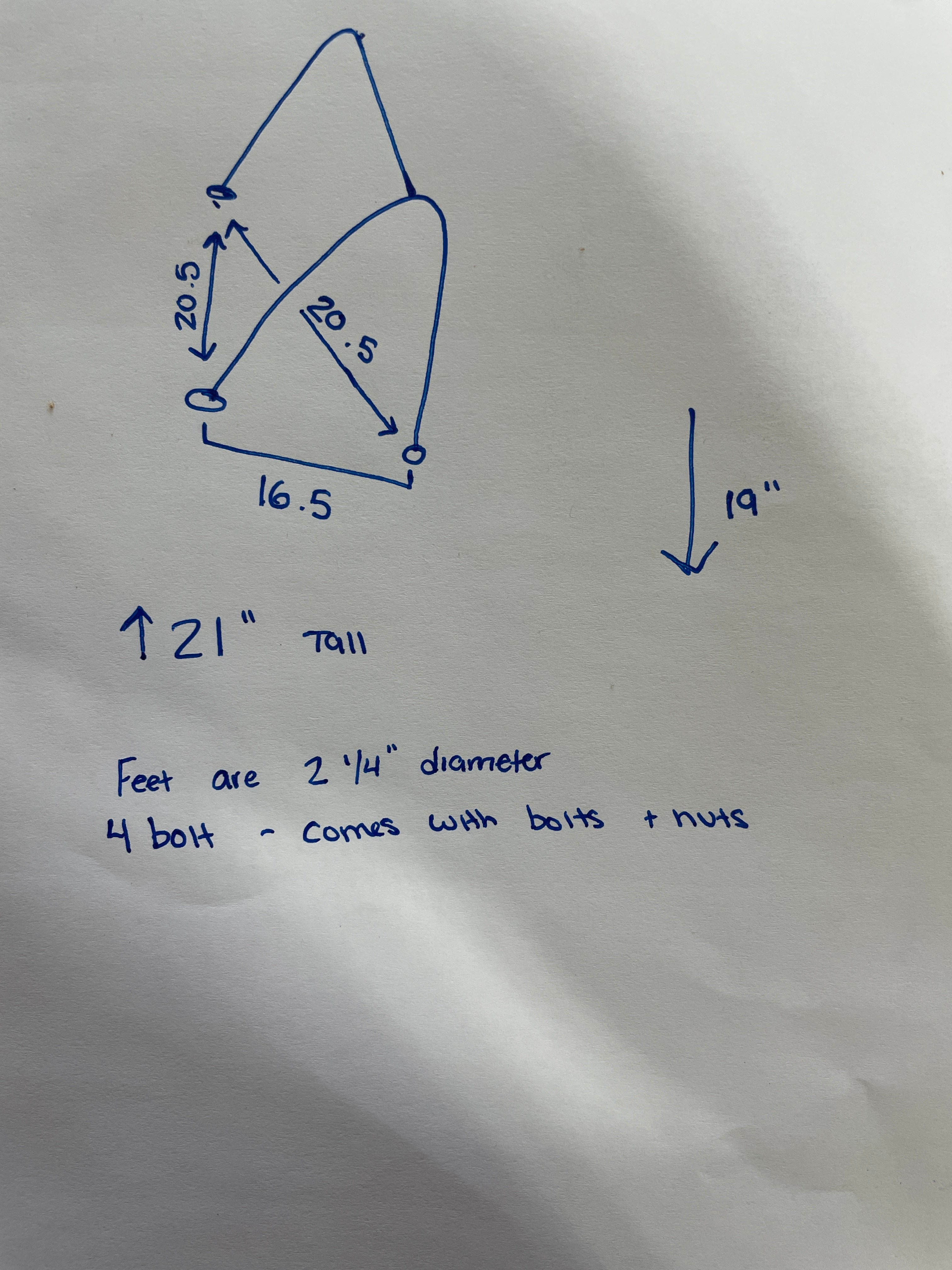 This stainless steel vent guard is in great condition. It is slightly angled. This guard stands 21" total height. The 2 front feet are 16 1/2" wide. It is 19" total length straight. From the front to the back middle foot the guard is 20 1/2" long. The feet are 2 1/4" diameter with 4 bolt install. Comes with the bolts and nuts.