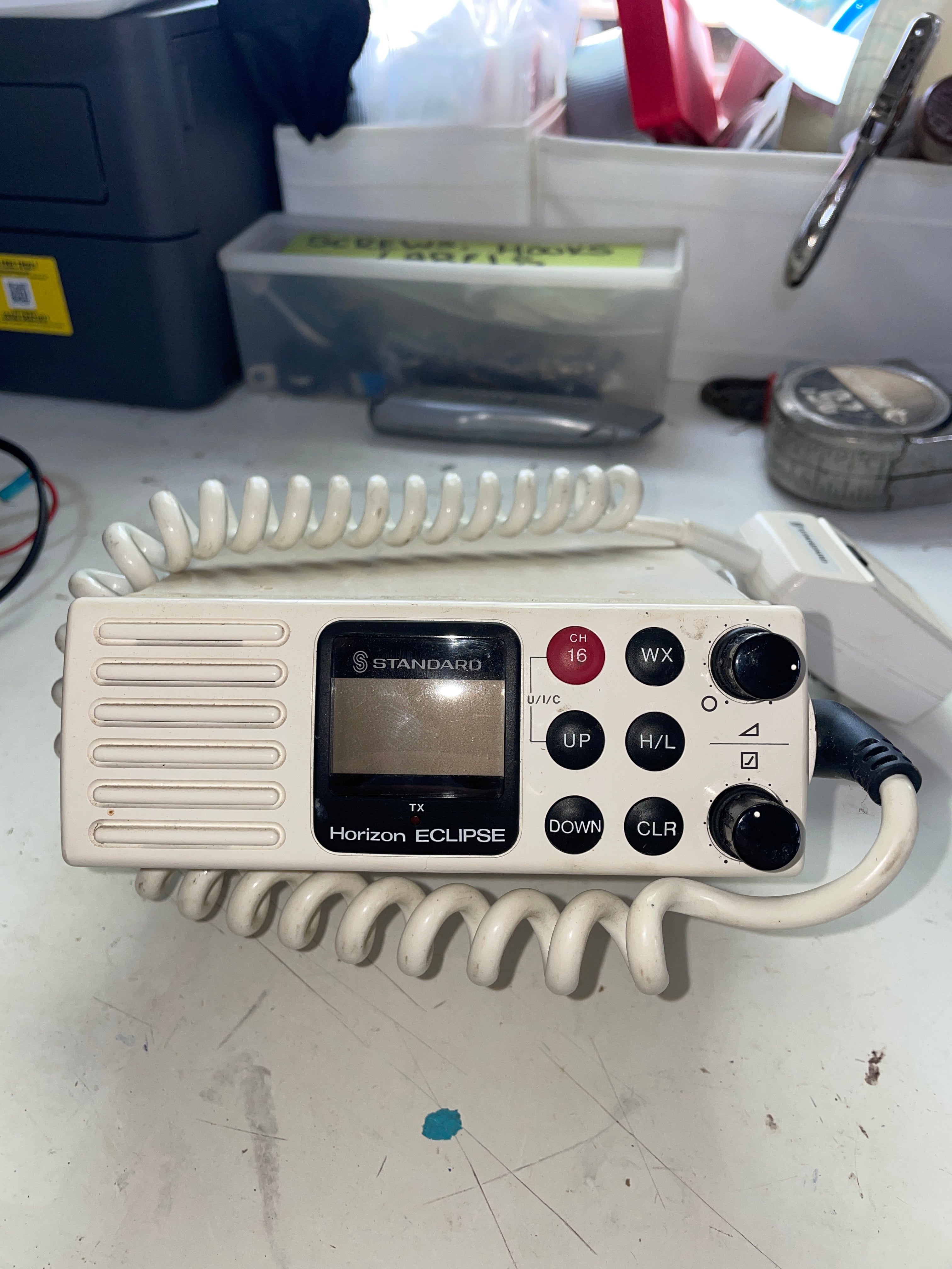 This standard horizon marine radio is in great condition. It is the eclipse version. Older style but works as it should. Comes with the mounting bracket. All wires have been cut rather short but easy to retire when installed. Microphone is also in great condition. Very clean unit!