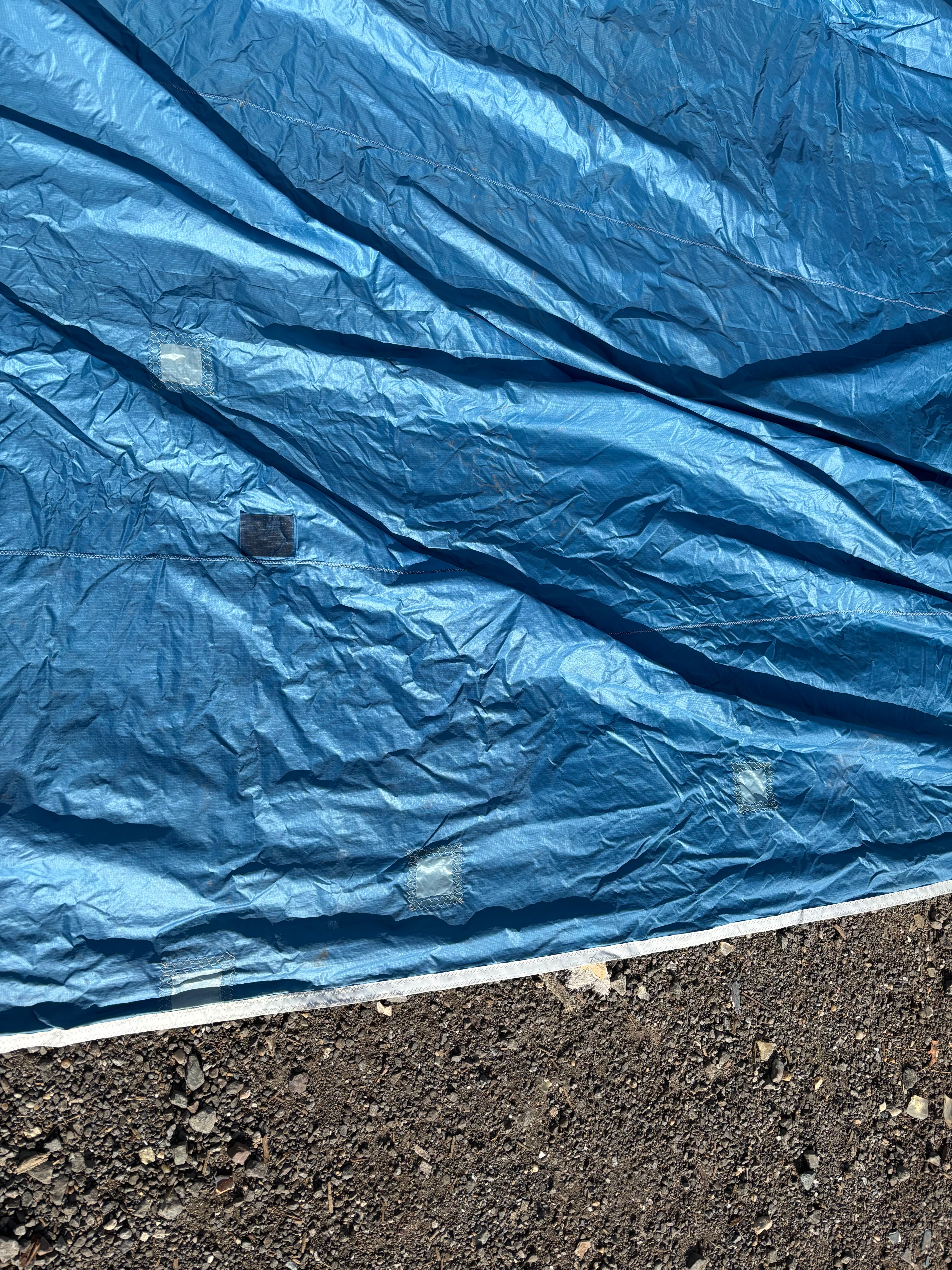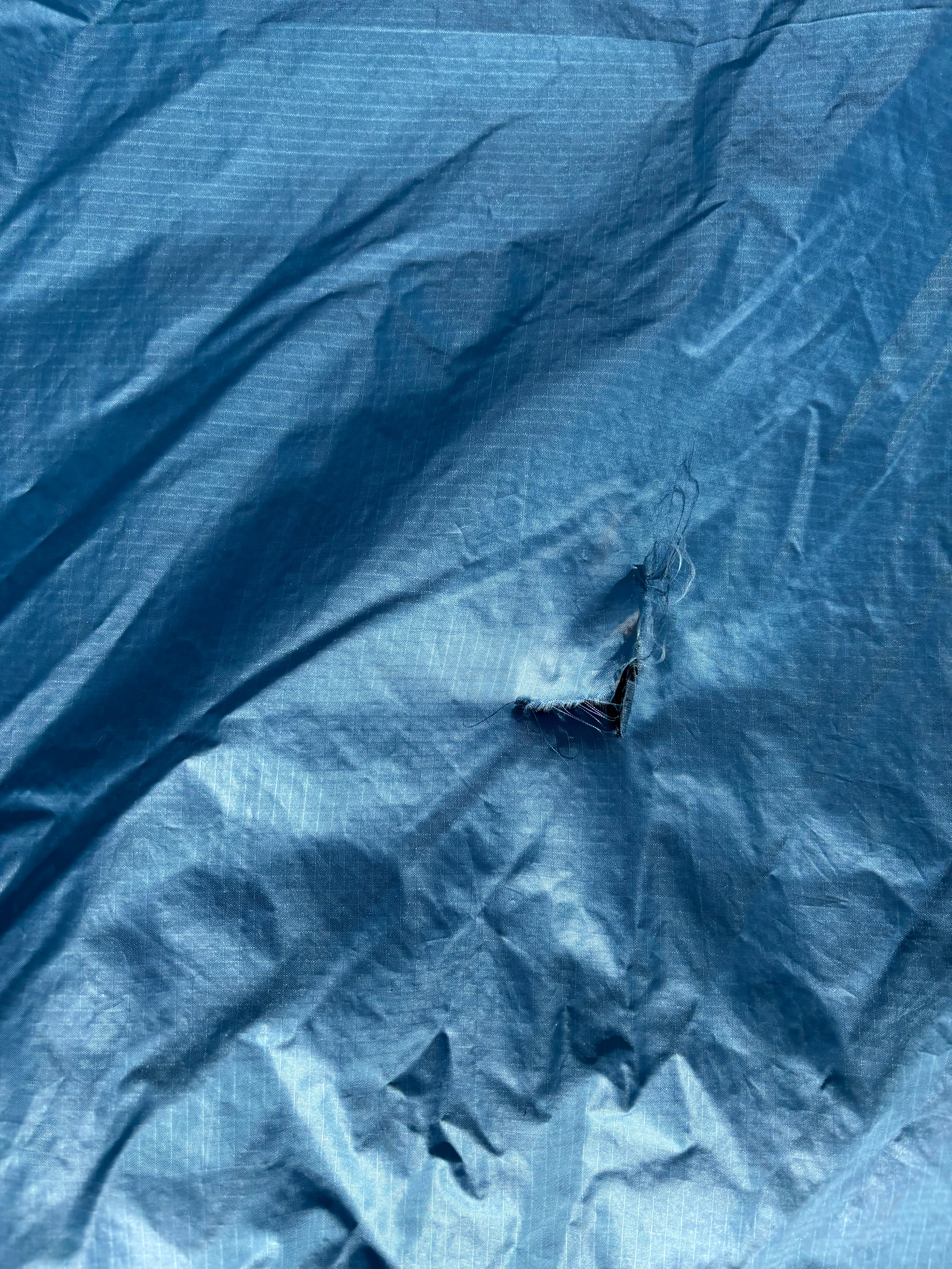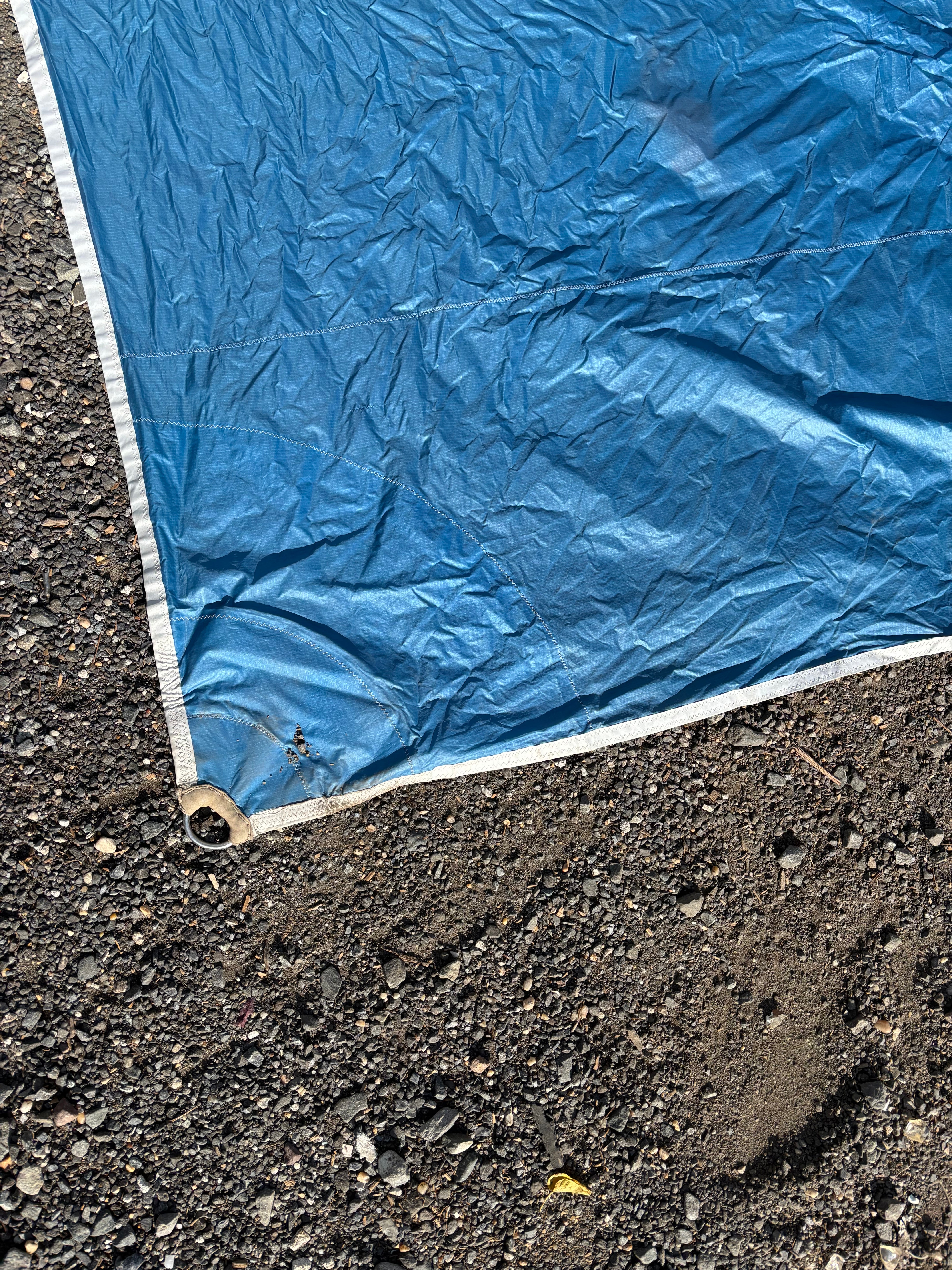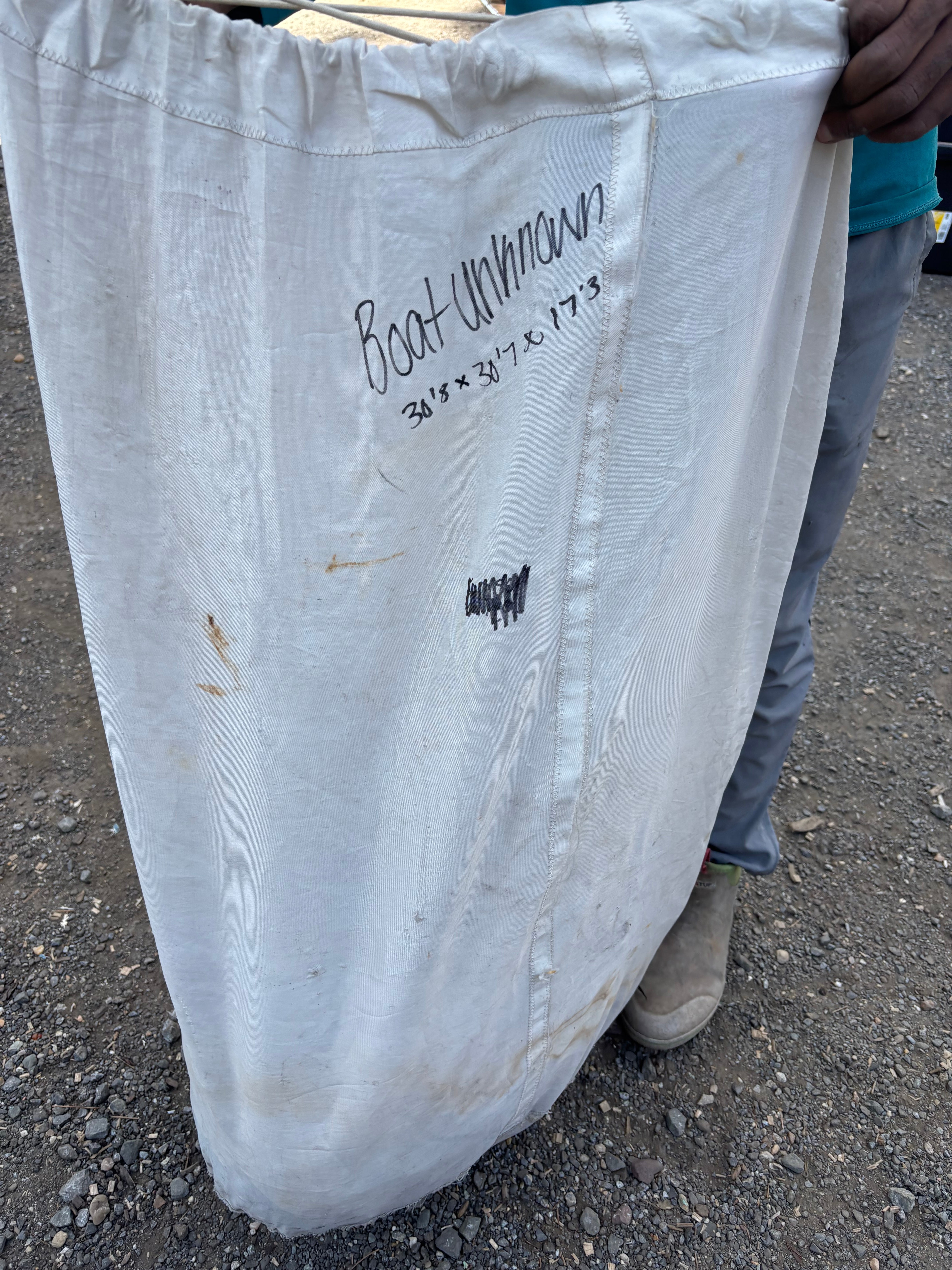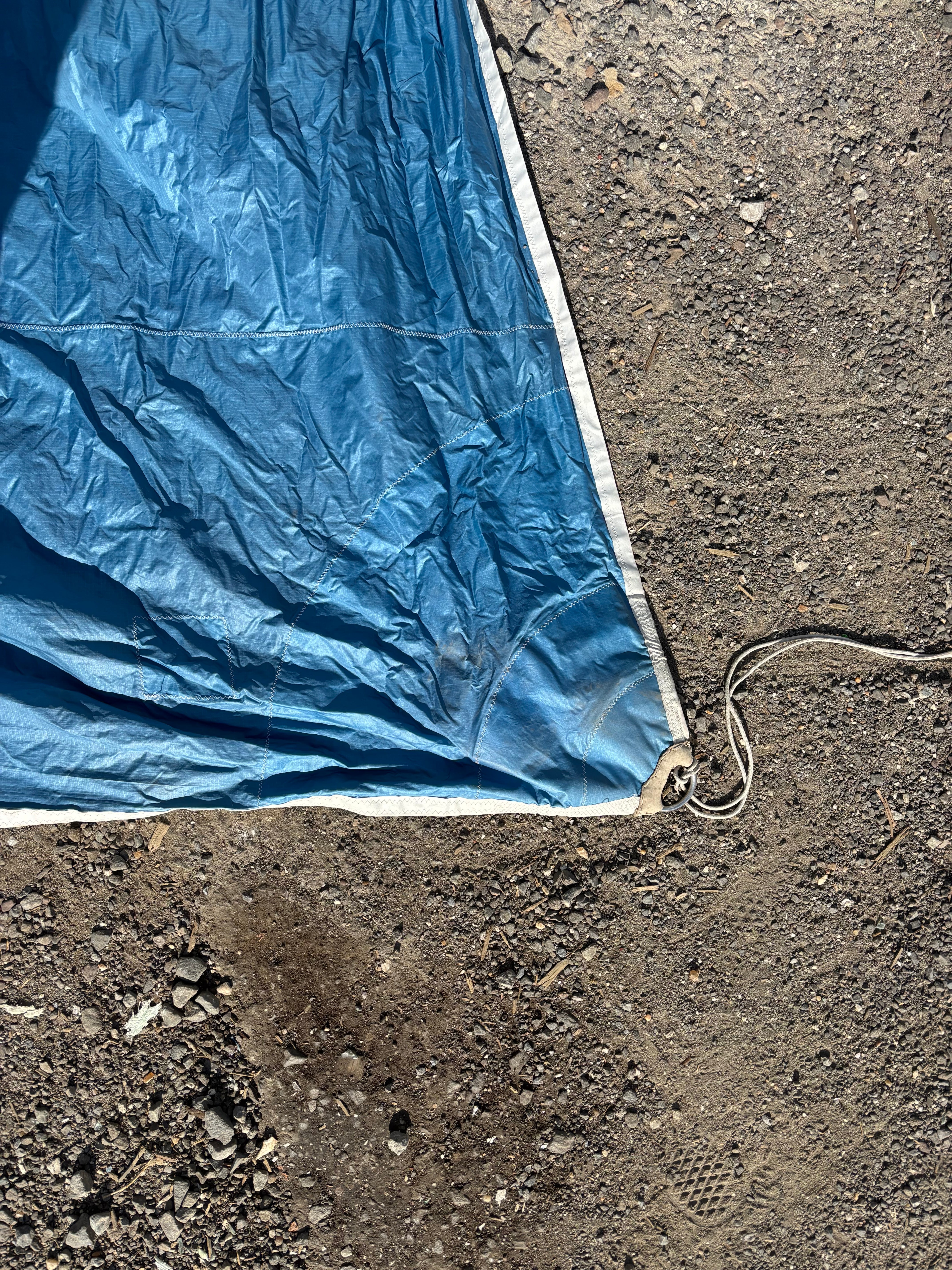 This symmetrical spinnaker is in fair condition. It does have quite a few repairs and a new hole at the top. All of these repairs and damages are shown so please look at all the photos. Blue and white coloring. Numbered 540. unknown what this was removed off of.