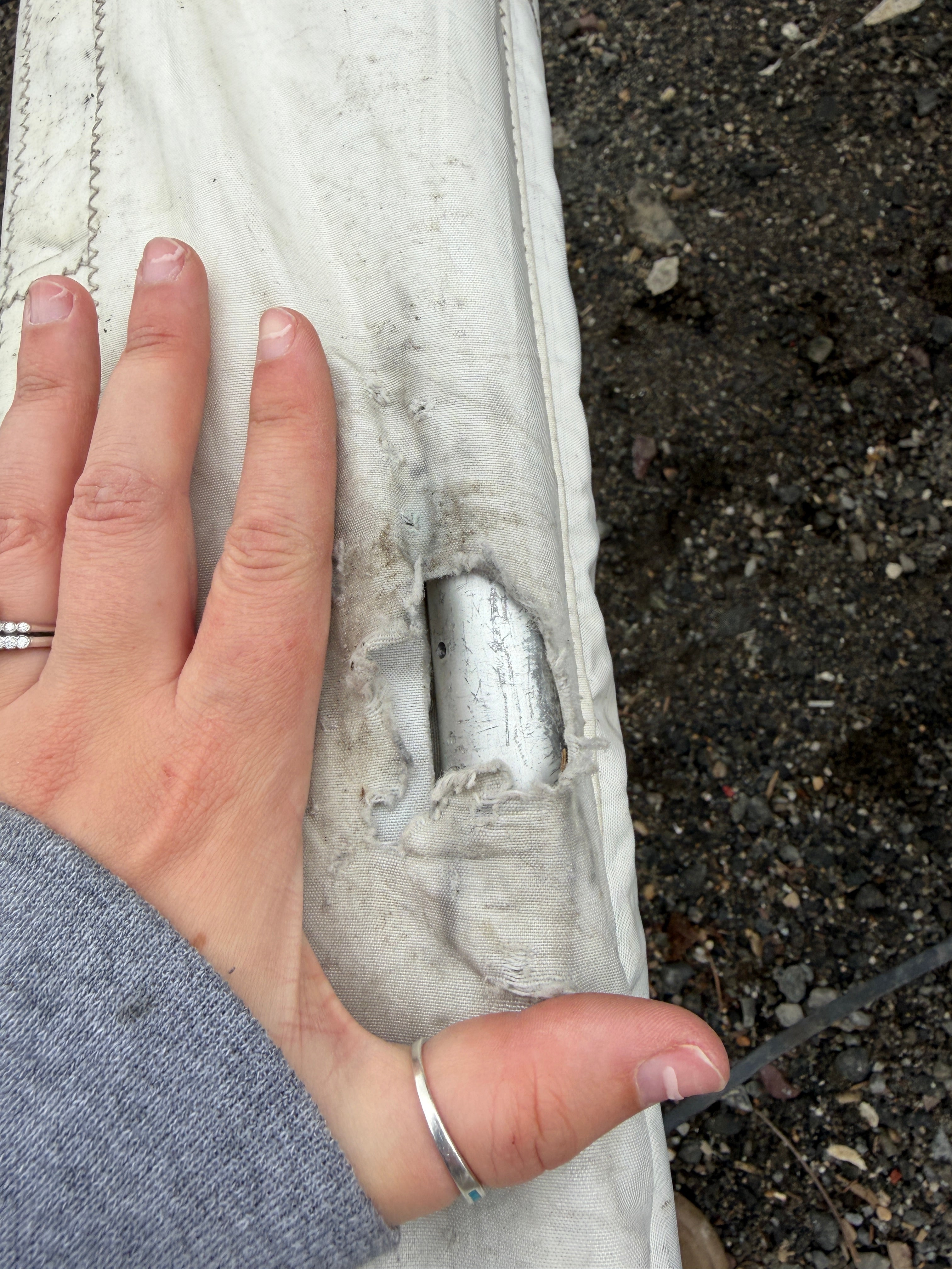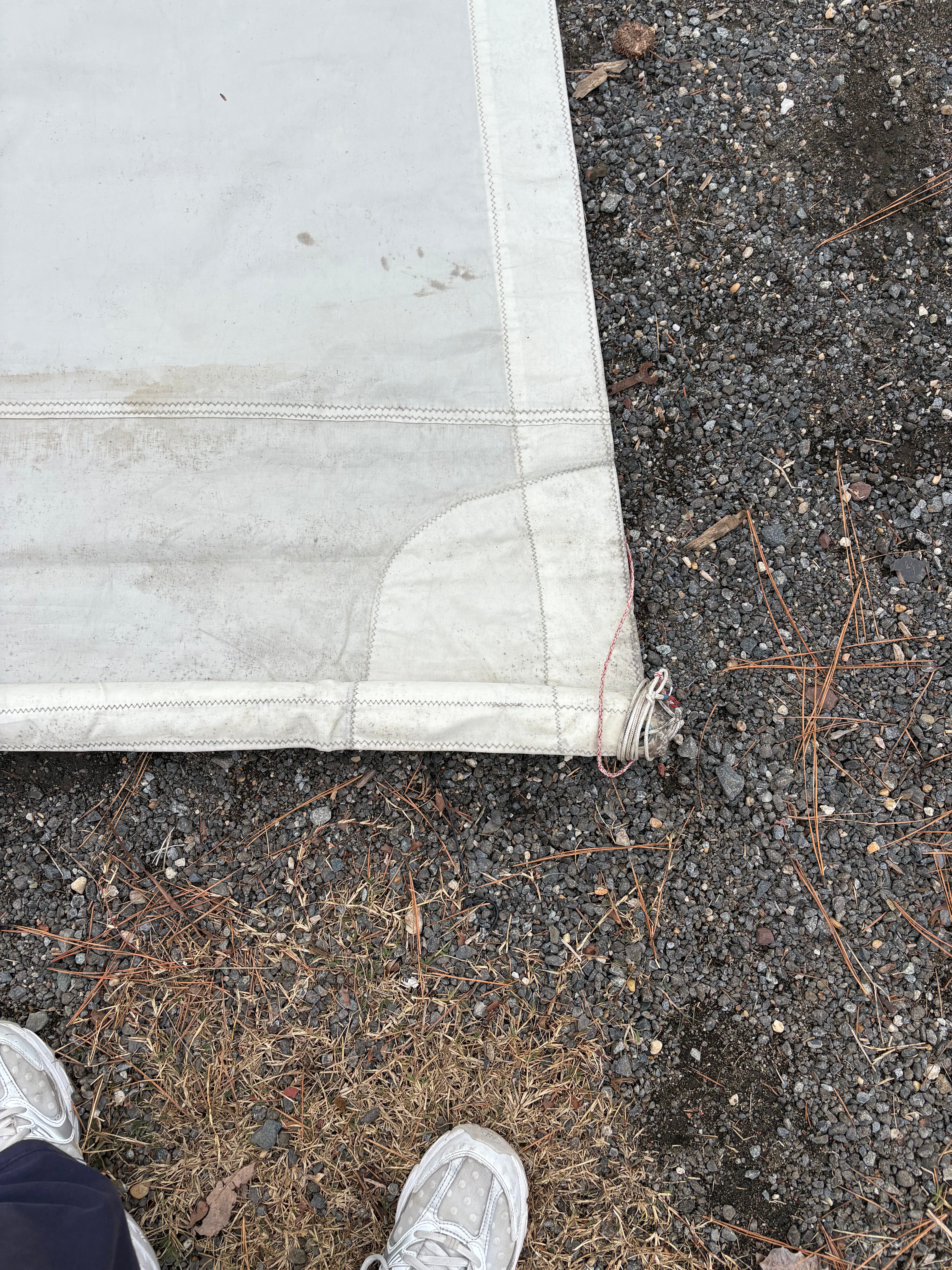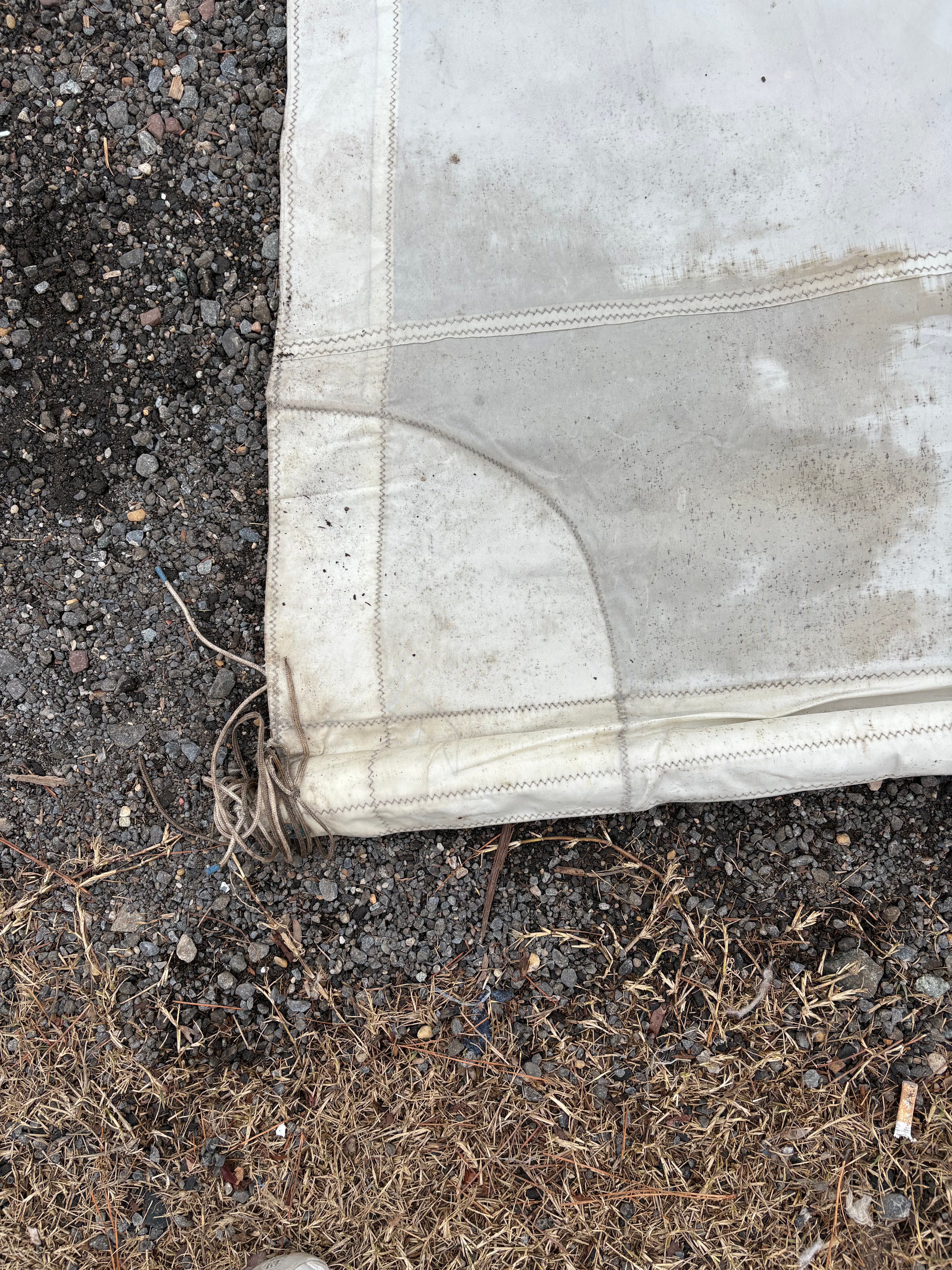 This was removed off a tartan 34C. It is sail material. The largest rod measures 9' 7.5" long. The middle rod is 8' 6.5" and the bottom rod where the canvas splits is 7'2". The very bottom with the split canvas is 6'. Total length down the side is 11'10". The rods are aluminum. There is a whole at the very top rod.