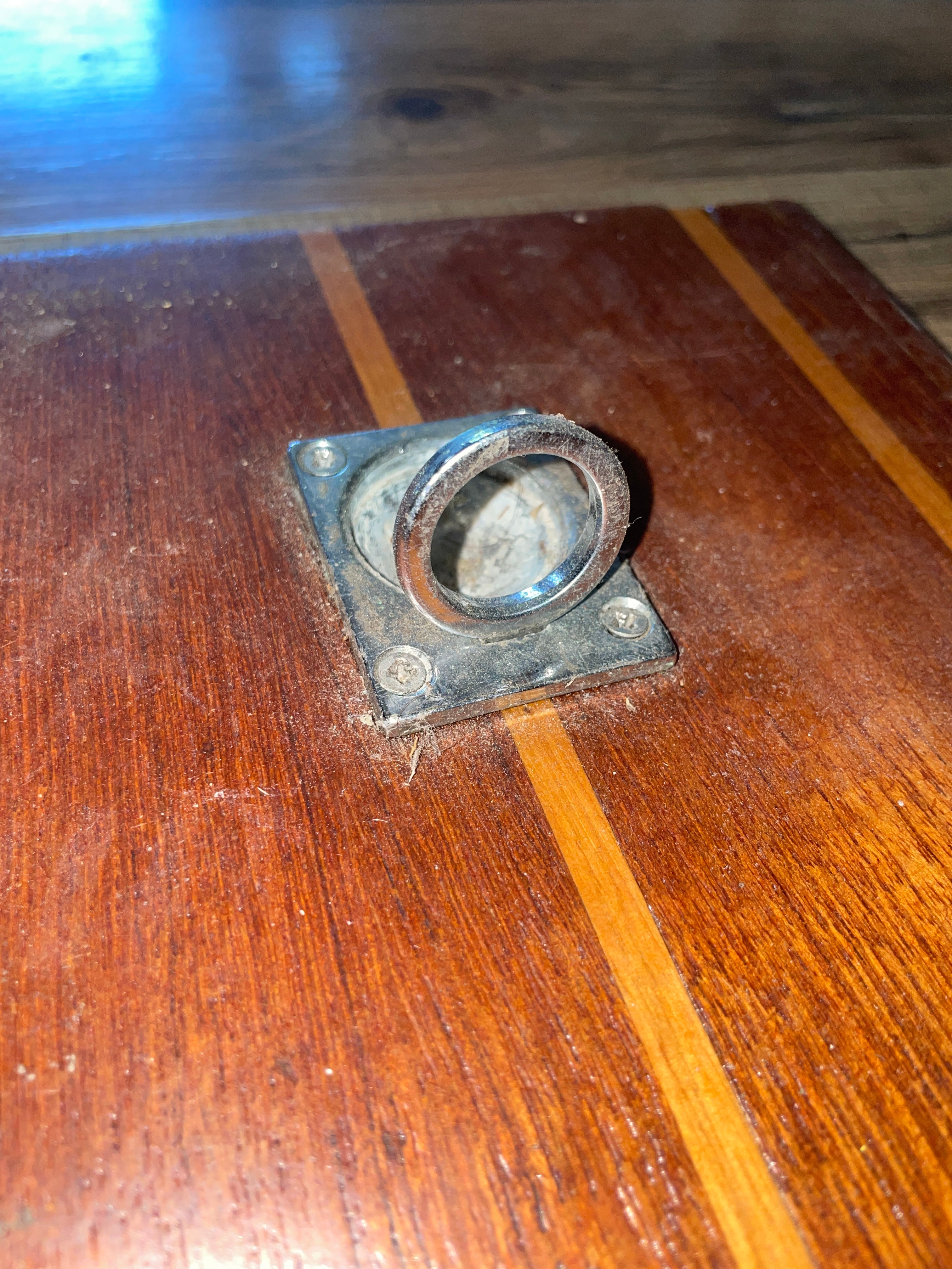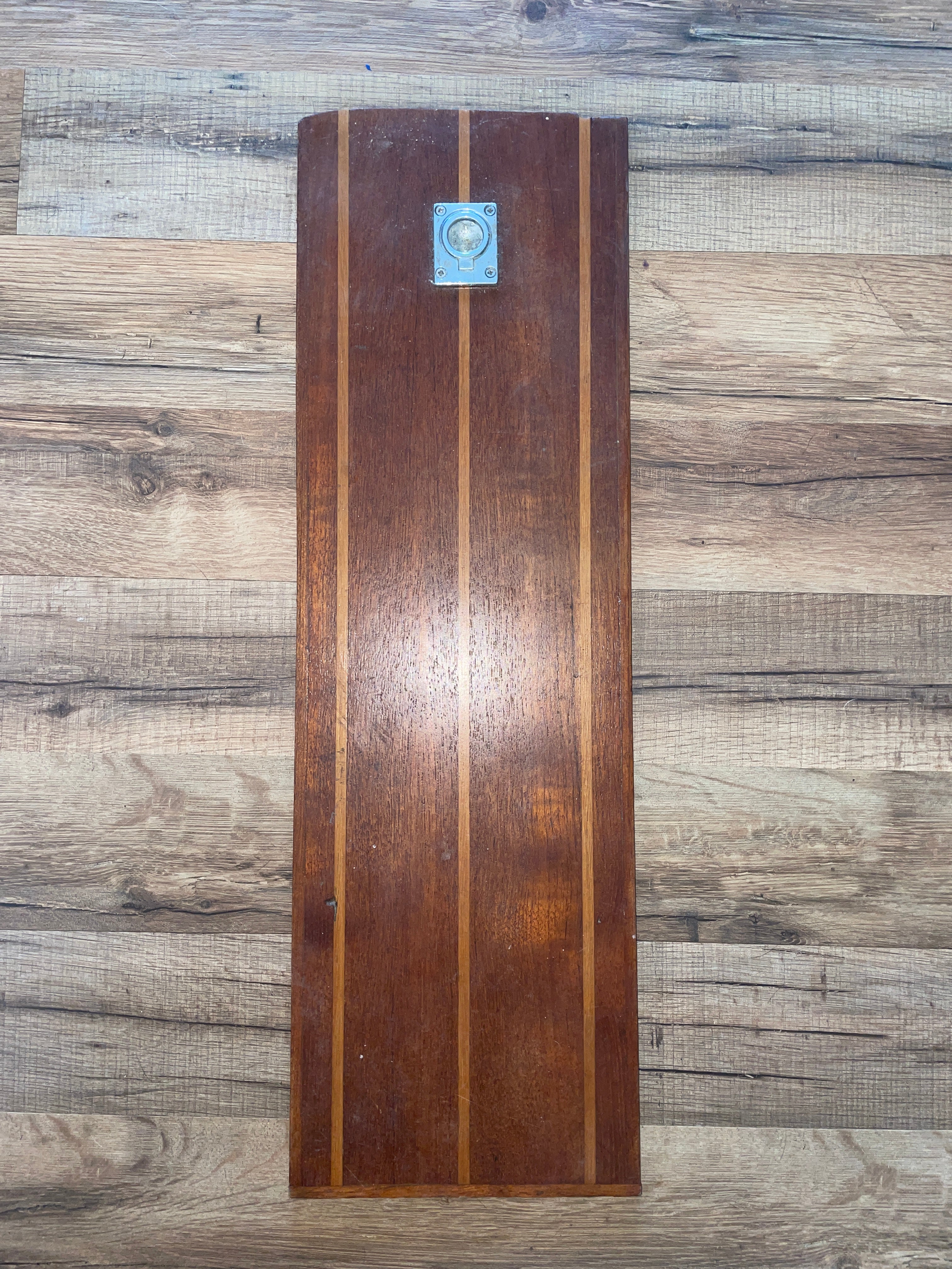 This teak and holly floor hatch is in good condition. It measures 23” long (this is the shortest length as it is slightly rounded at 1 end) could easily be trimmed down to be a straight line. It is 7 1/4” wide x 7/16” thick. Hatch handle works as should.
