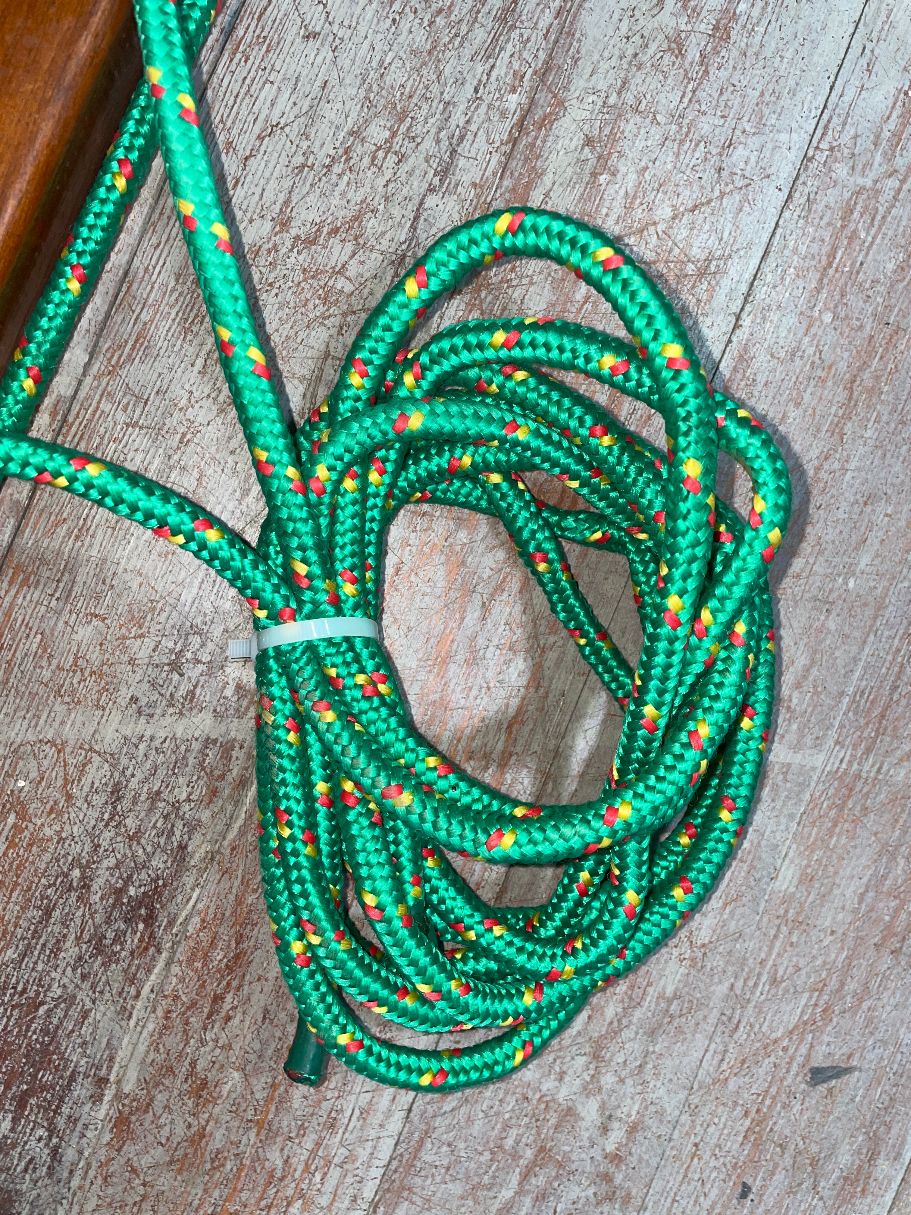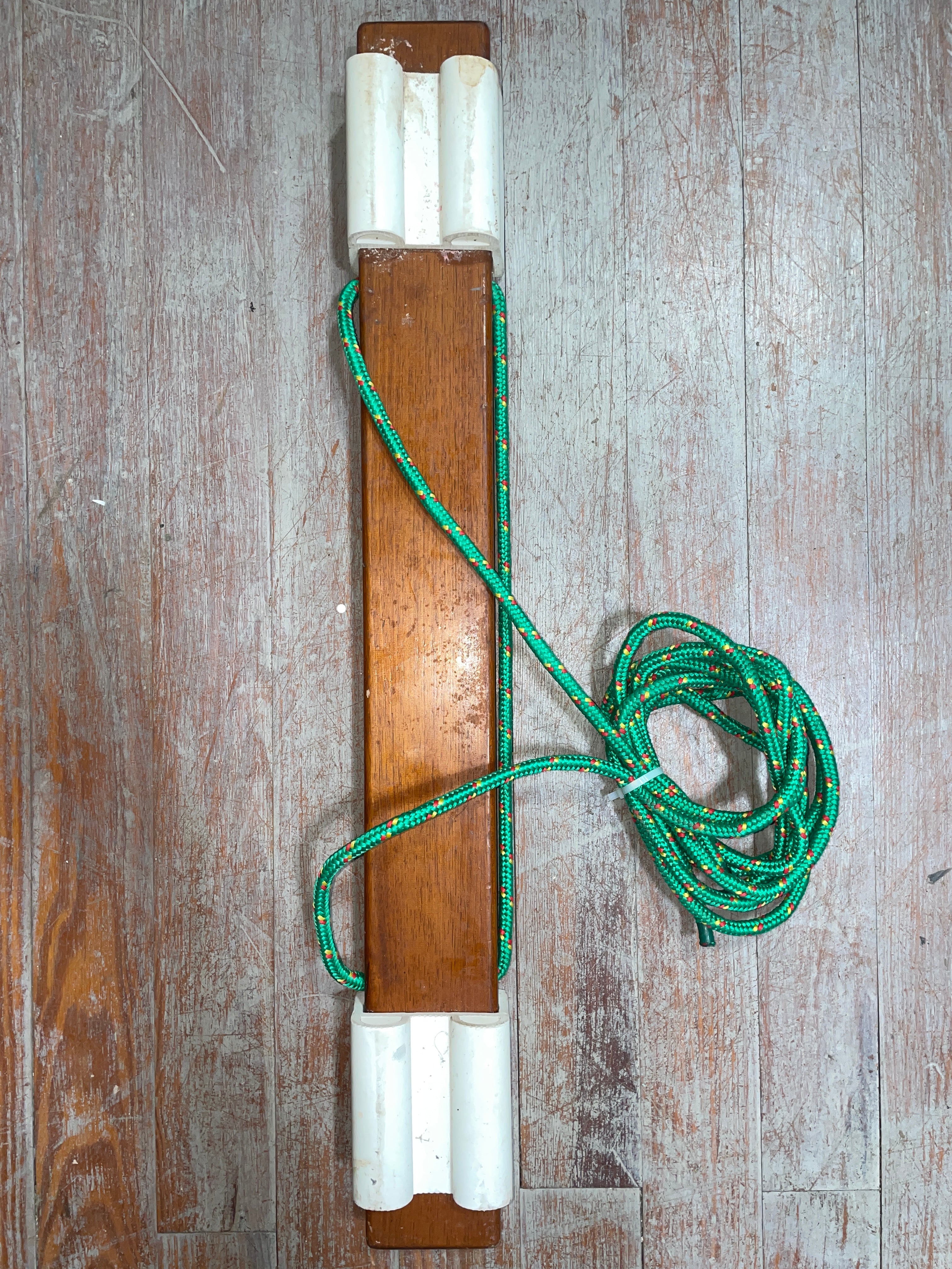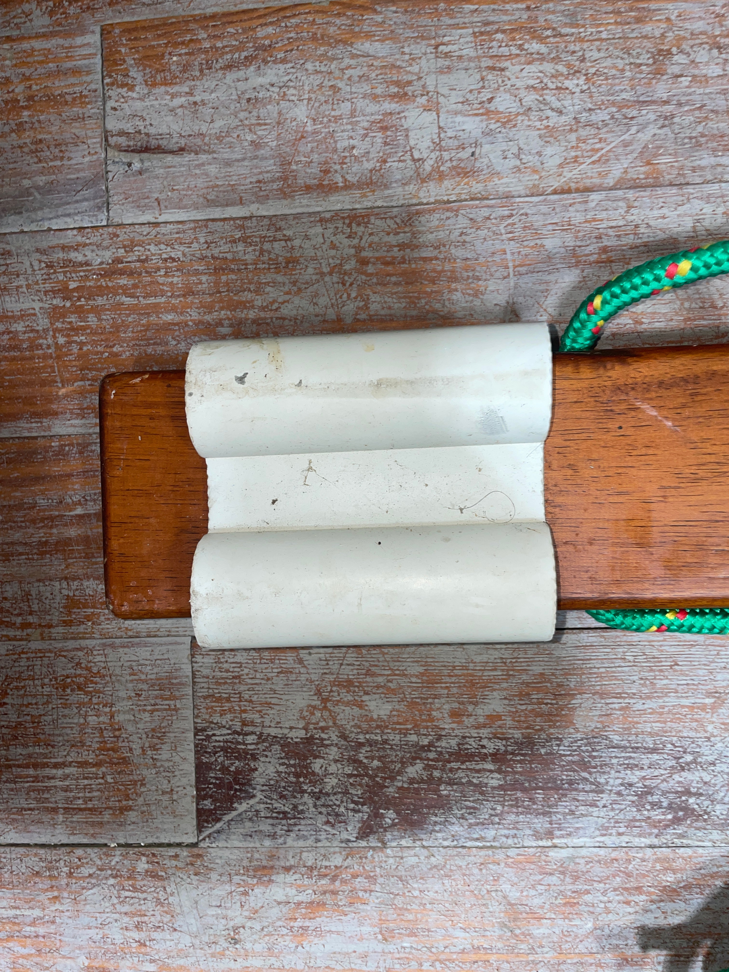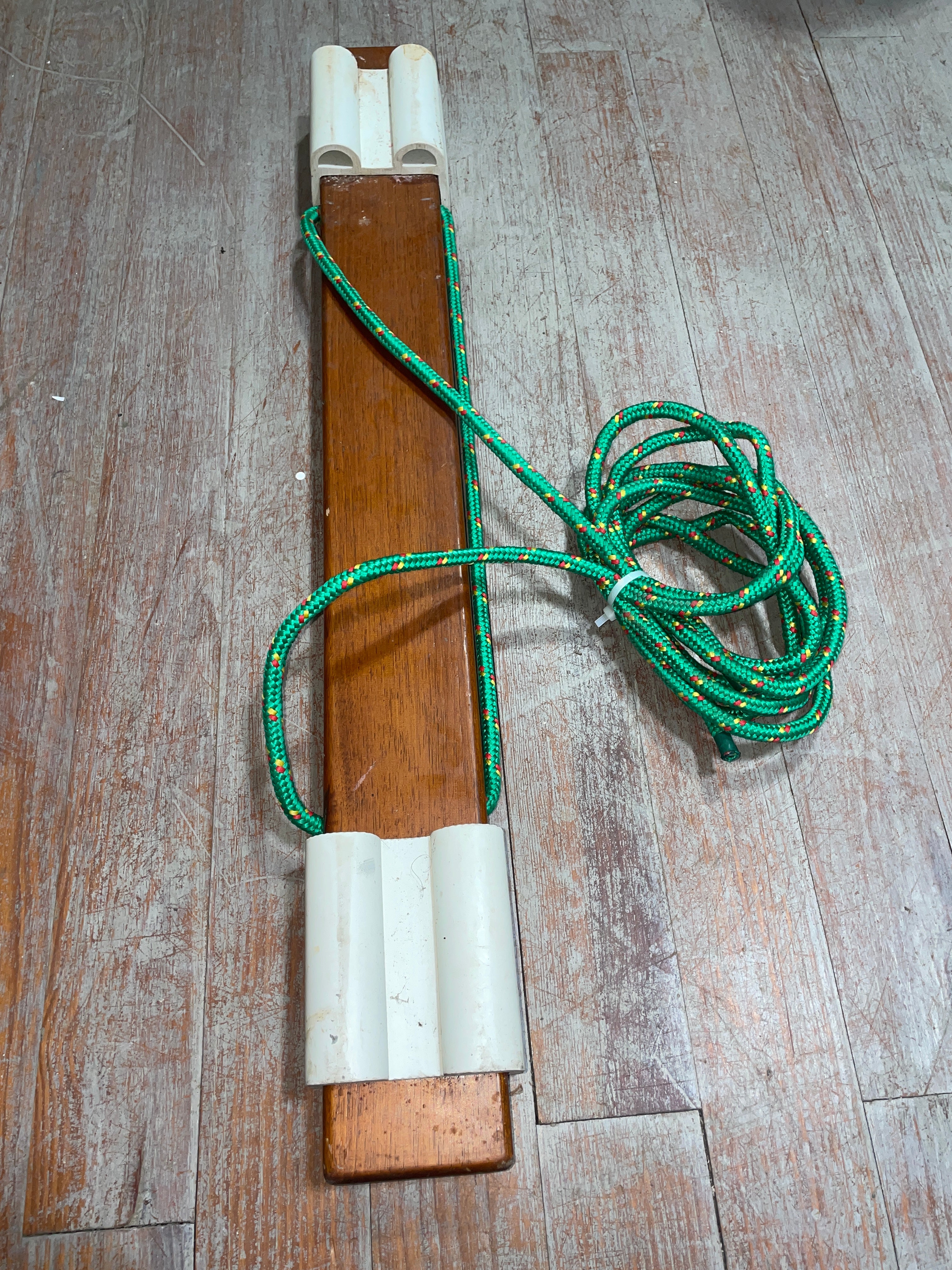 This teak bumper is in good condition. It is 31 1/2" total length x 3 1/2" wide. Has approximately. 6' of rope on each side.