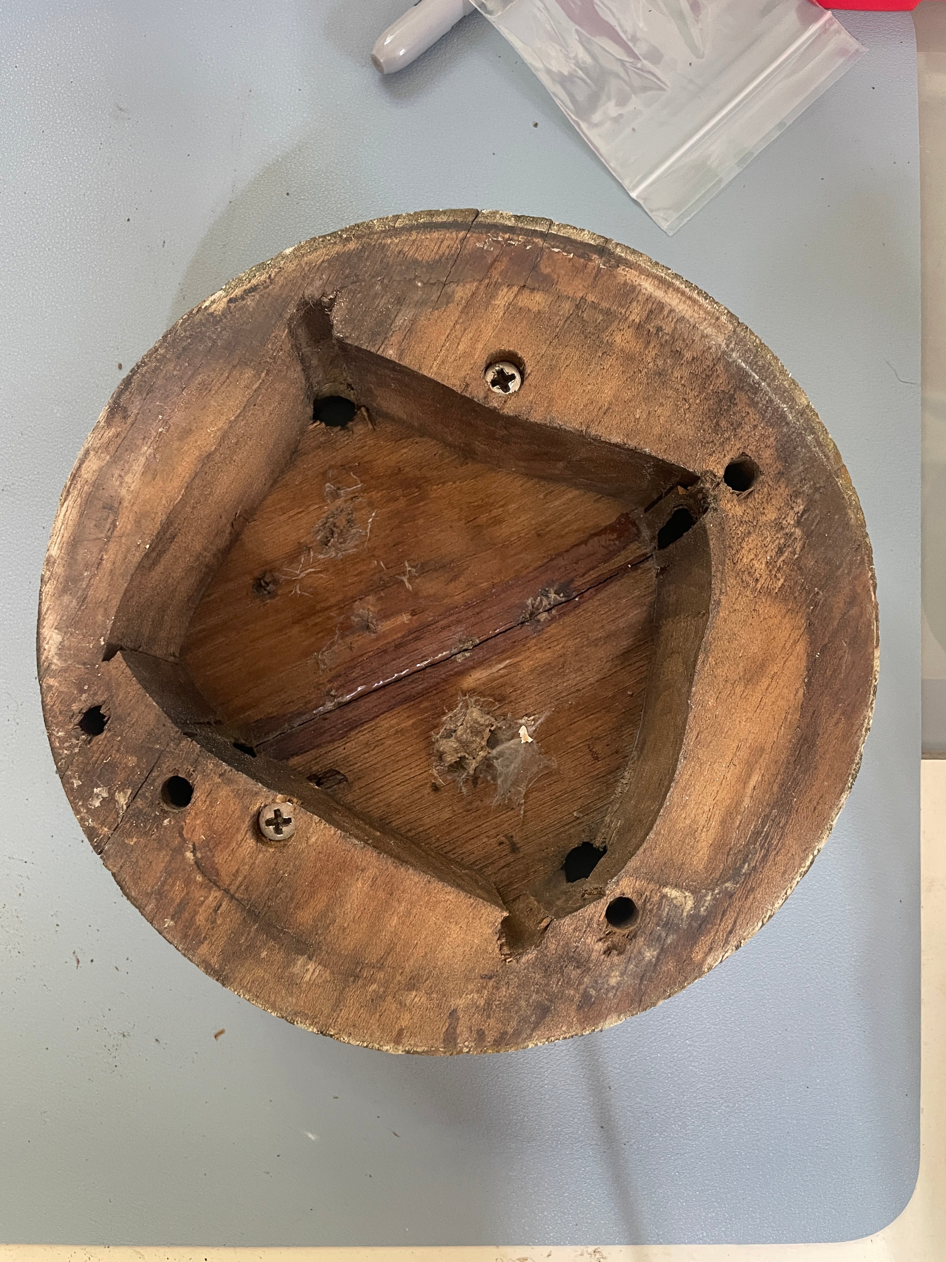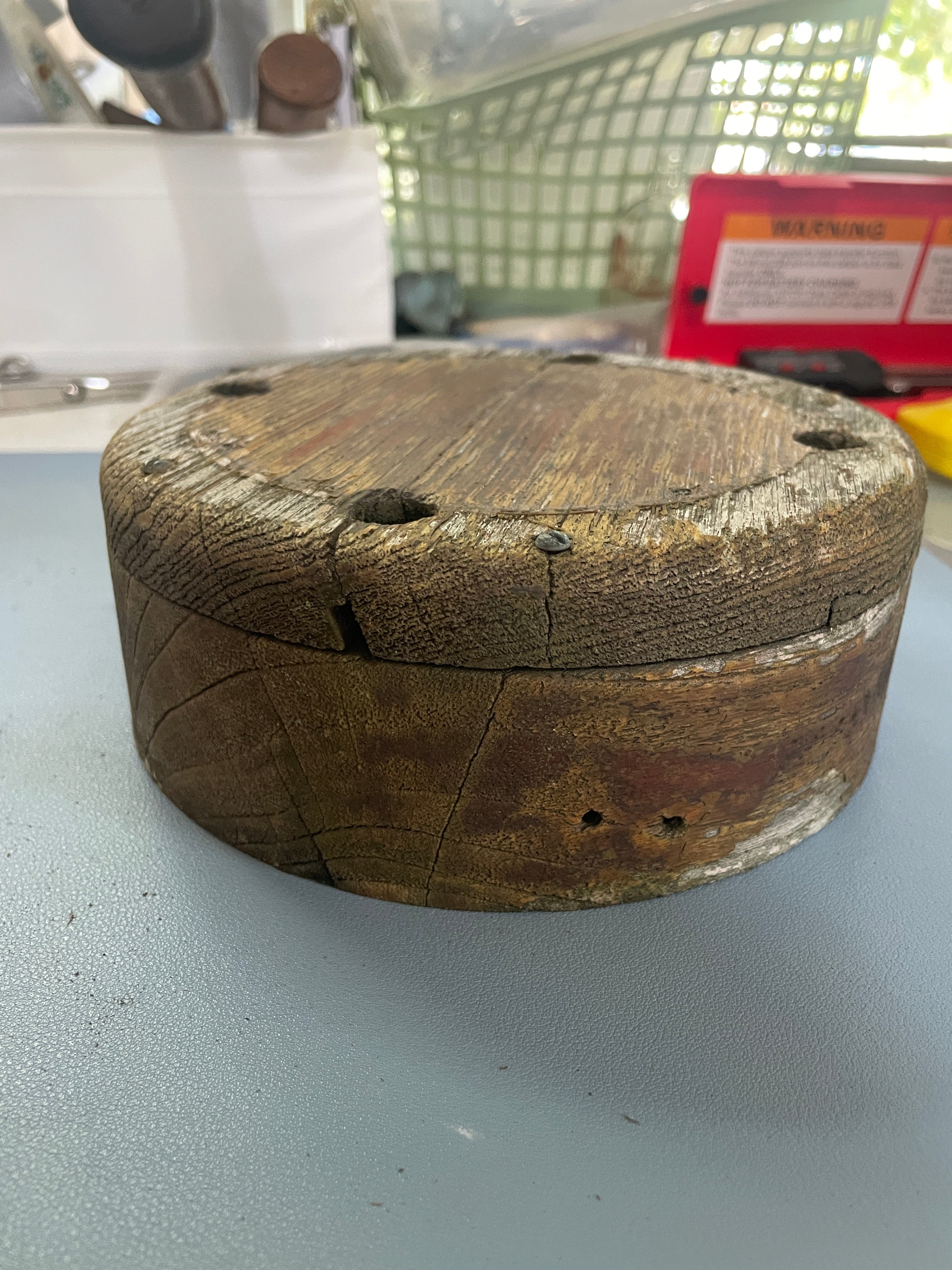 Teak Clutch & Throttle Control Base. It is 6 7/8" Diameter and it stands 2 1/2" tall. Comes with the bolts for install. The cut out on the bottom side is so the throttle and control don't hit it.