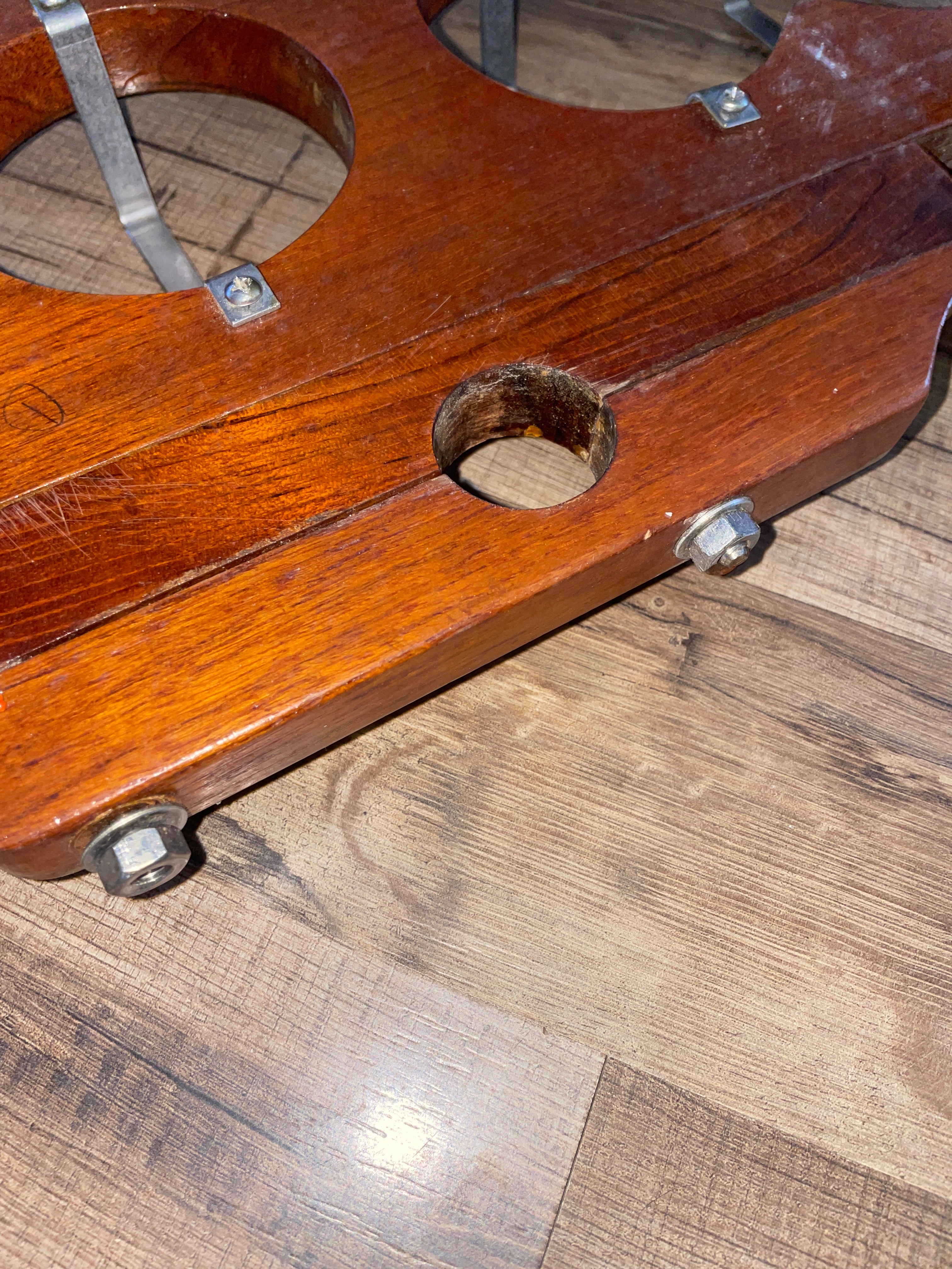 This teak cup holder is in excellent condition. Teak is beautiful. It fits for a guard that is 1 1/4” diameter tubing. The mounting for a pedestal 9 1/2” center to center. Fits 4 cups. It measures 18” long x 7 3/4” deep.