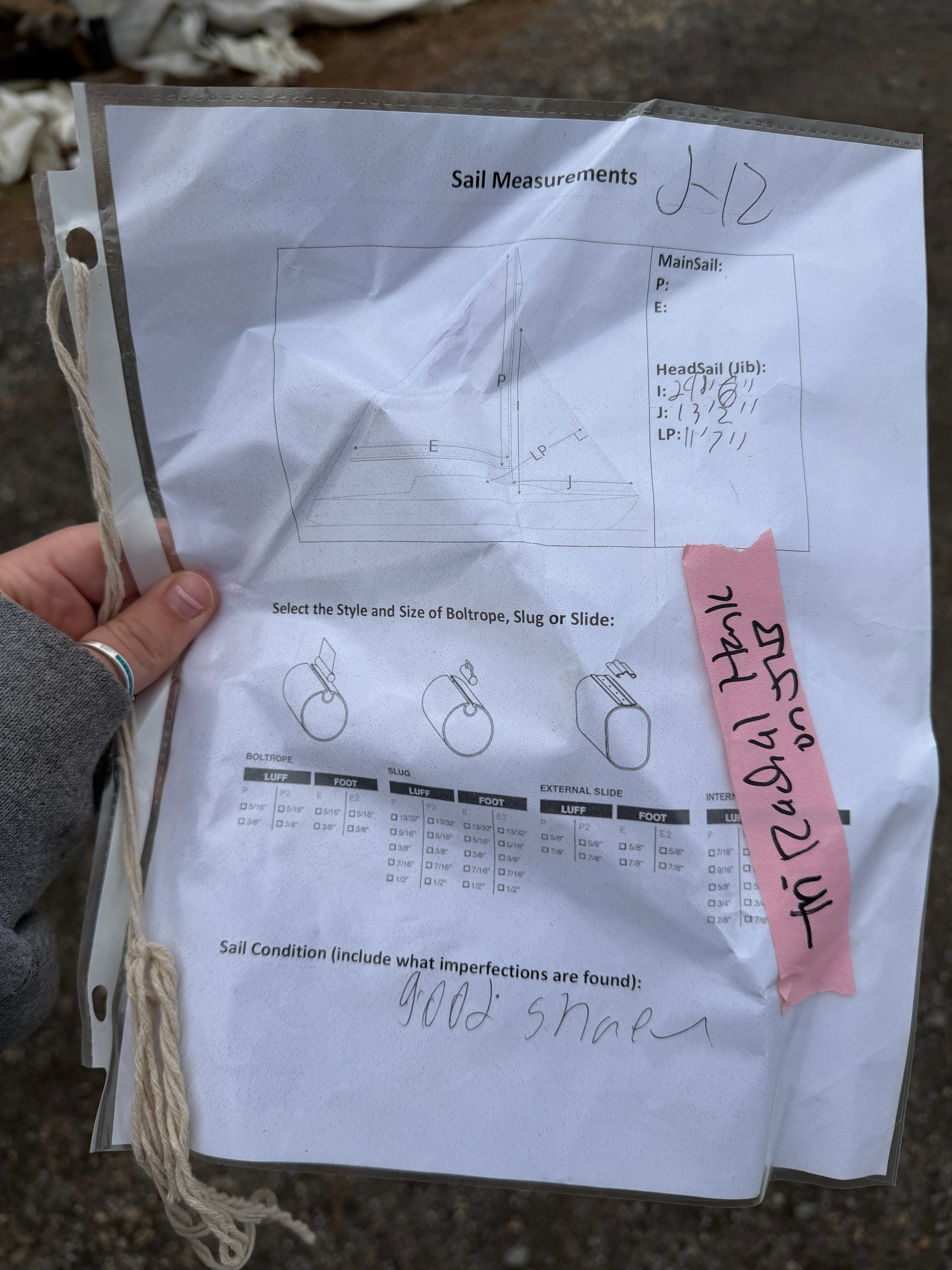 Tri Radial jib sail. Has the bronze hank jib hooks on the one side. The sail measures 29'7" x 13'2" x 11'7". The sail is overall good condition. No rips or tears however it does have some staining. Does NOT come with a bag.
