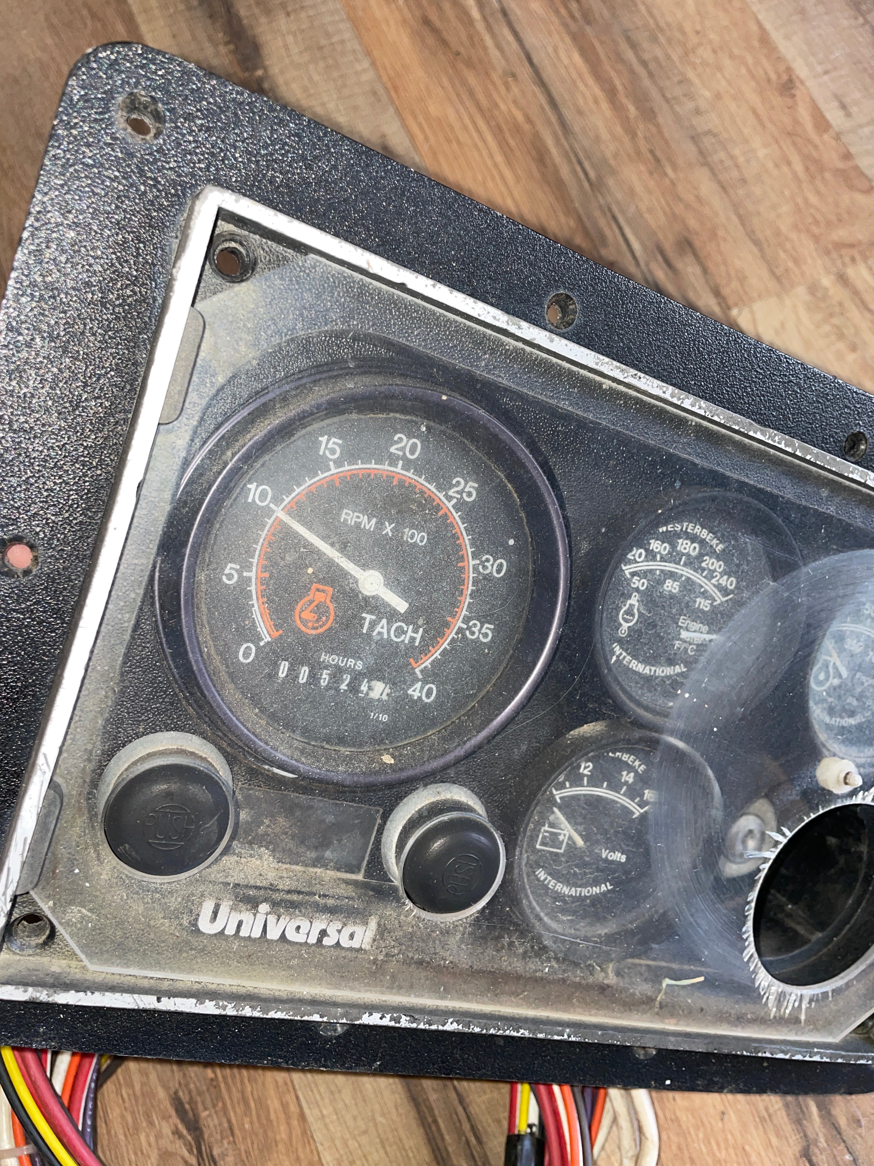 This universal engine panel is in great condition. It comes in the nice casing where the tachs are protected. It does not have keys. There is a great bundle of wiring for the Reinstallation. The Plexi covering is dirty and has some scratching but overall great condition. This was removed off of a Catalina 30 sailboat.