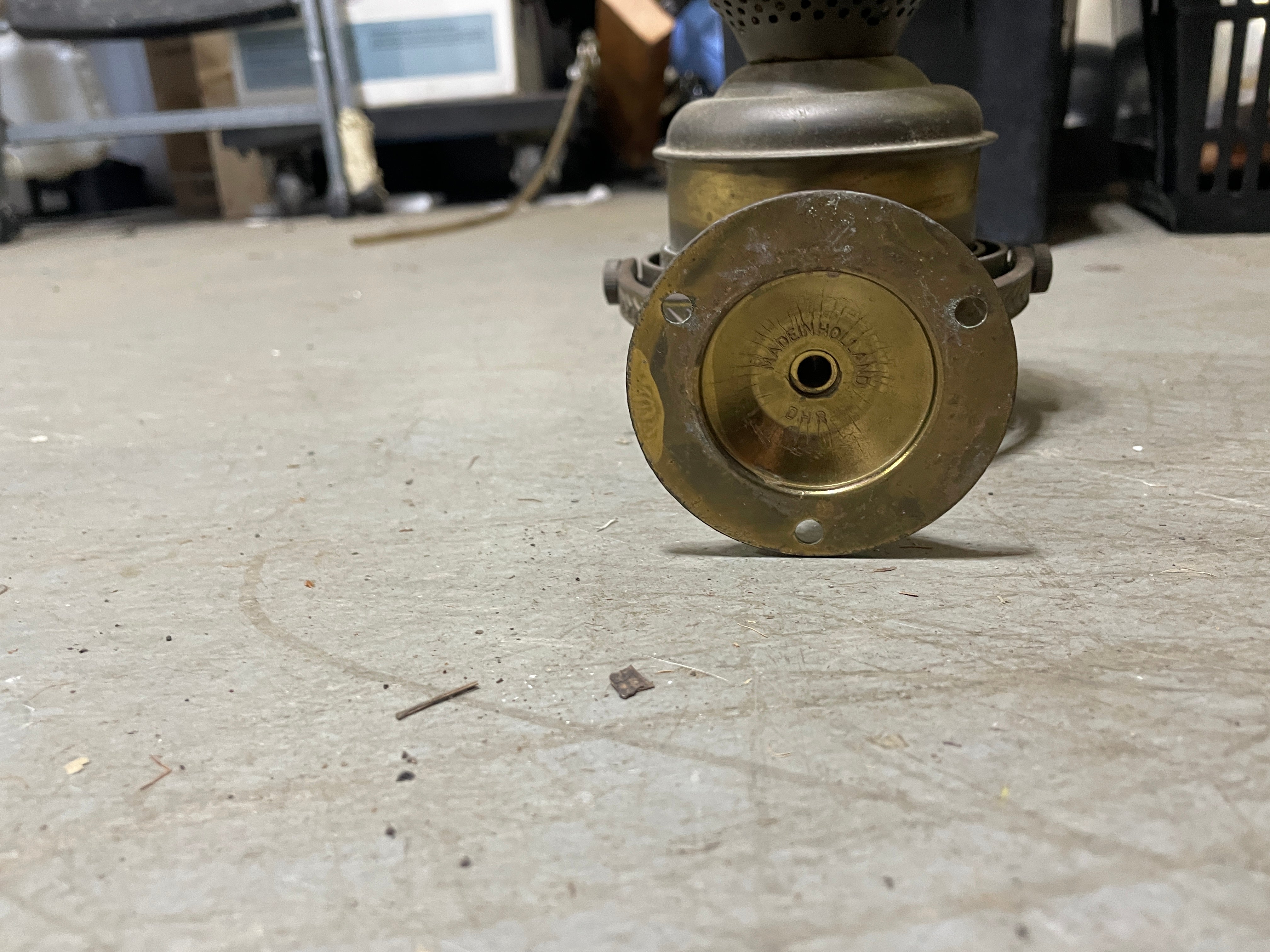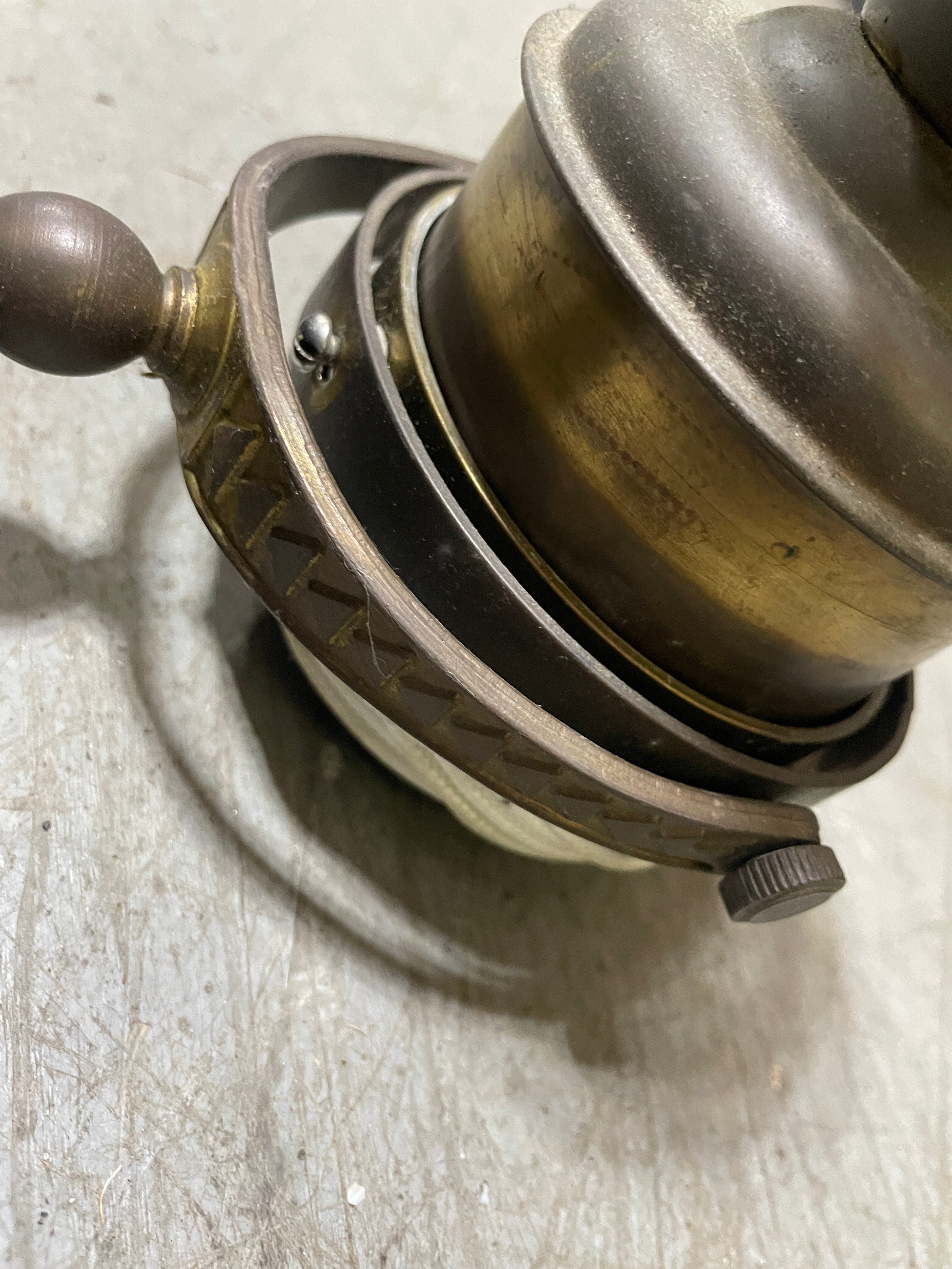 This vintage brass oil lamp is in great condition, It is 10" total height. Comes with the gimbal. The glass is fully intact with no chips or cracks. The glass does look like a bubble style. No oil deflector. Has a nice braid on the base - can be removed if you'd prefer.