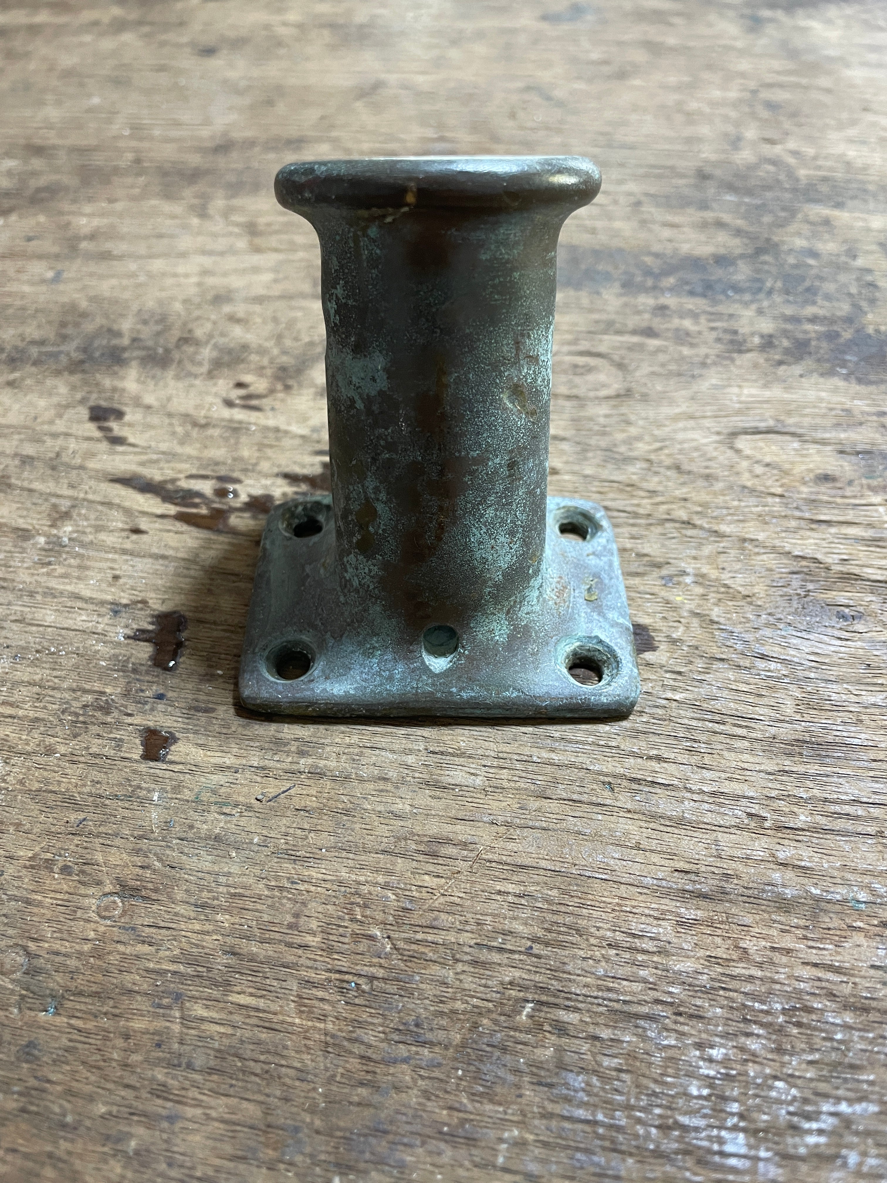 This vintage solid bronze flag pole holder is in great condition. Removed off a 1930s wooden boat. It fits a 1 1/8" pole diameter. It sits at a 60ish degree angle. The base is rectangular measuring 2 1/2" x 1 7/8". Stands 3" tall. Will need new setting screws.