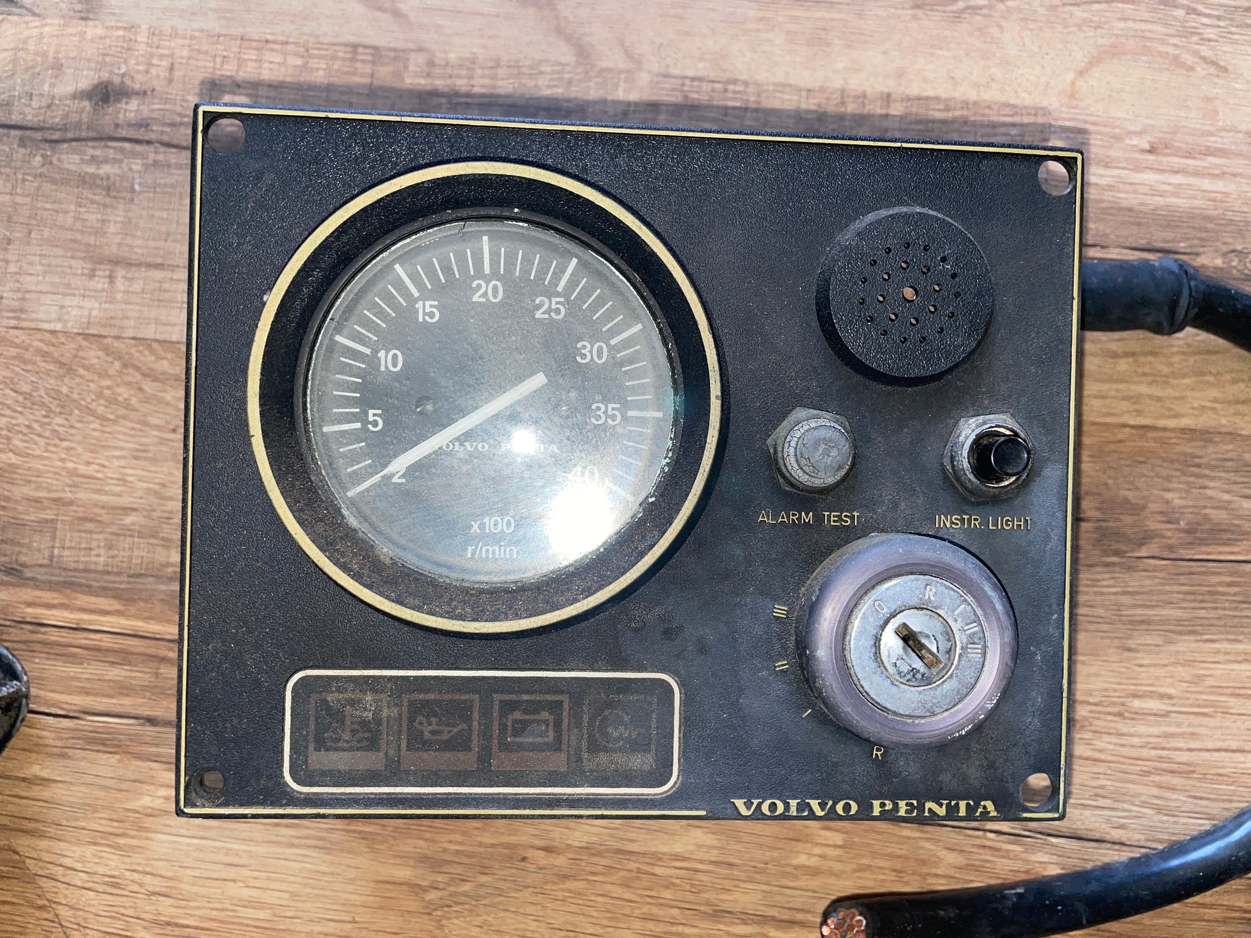 This Volvo penta engine panel is in great condition. It does not have a key. The r/min gauge is very clean. Panel measures 7 1/8” long x 5 1/2” wide x 3” deep.