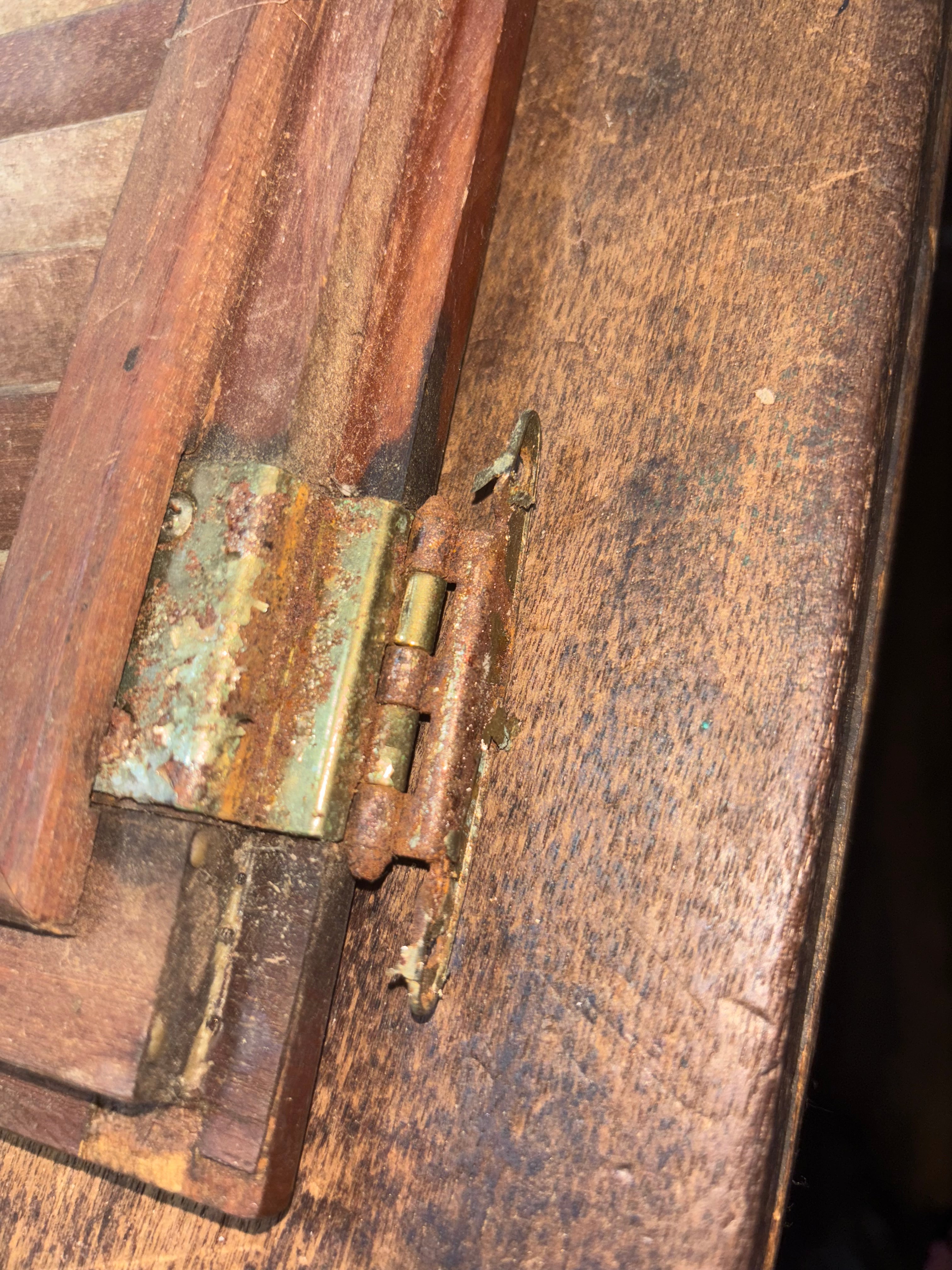 This small interior door was removed off a Watkins 27 sailboat. This door is in fear condition, it is dirty and needs a good cleaning. No major damage to it, has usual scratching. The hinges work but are slightly rusty. The door measures 12" long x 8 1/4" wide.