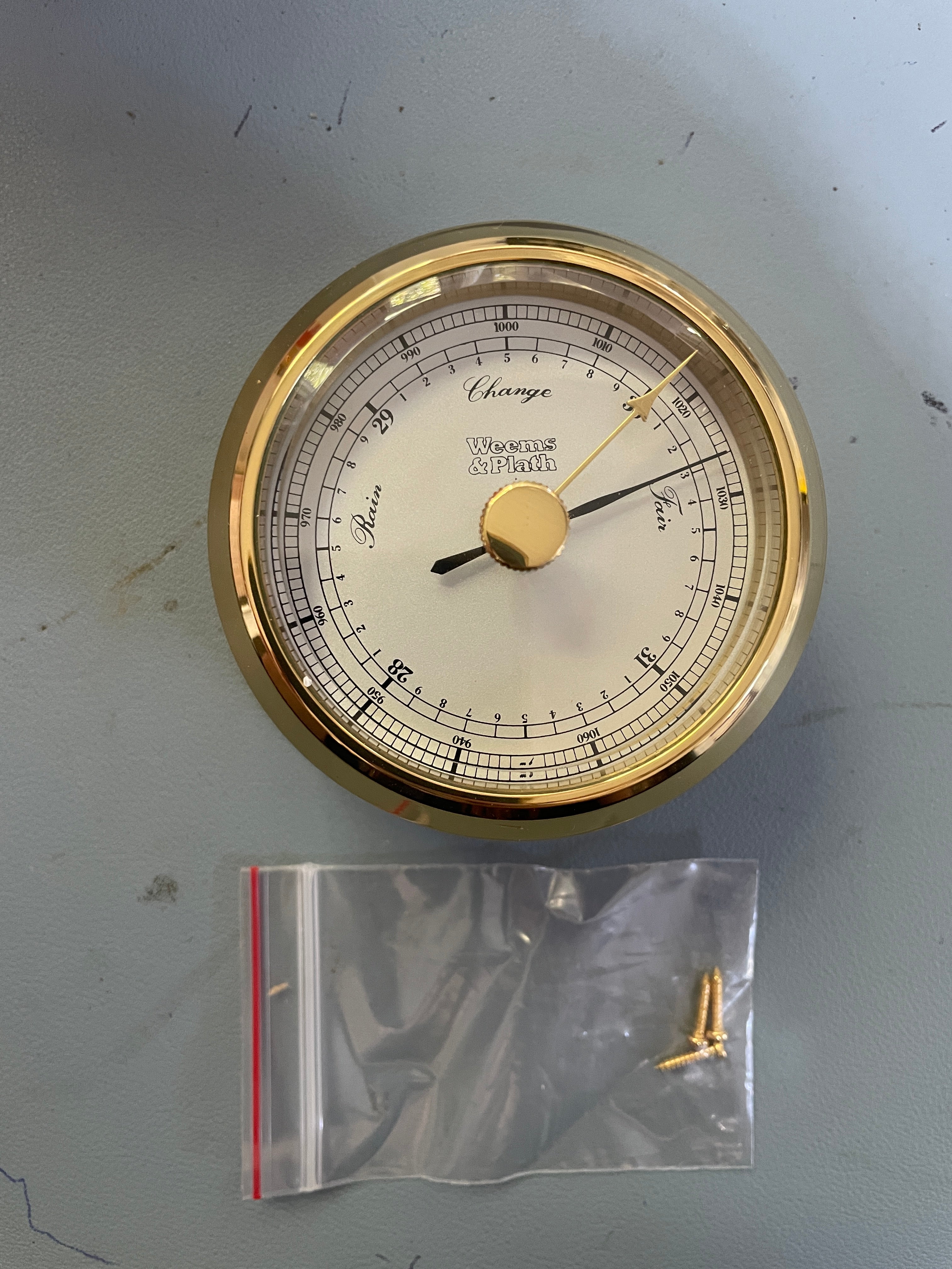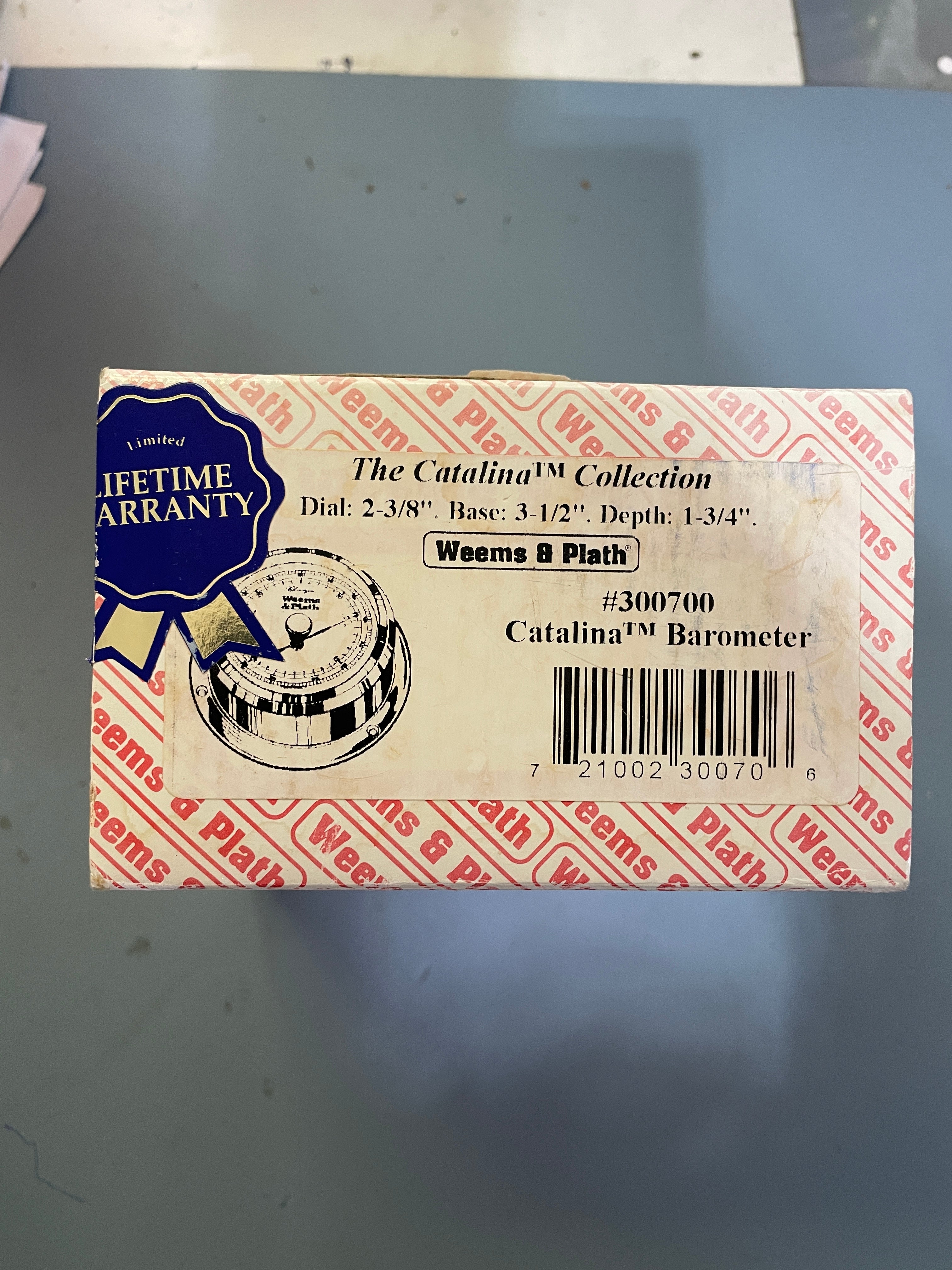 Brand new in packaging. This weems and Plath Catalina barometer is number #300700. The dial is 2 3/8" diameter and the base is 3 1/2". The depth is 1 3/4".