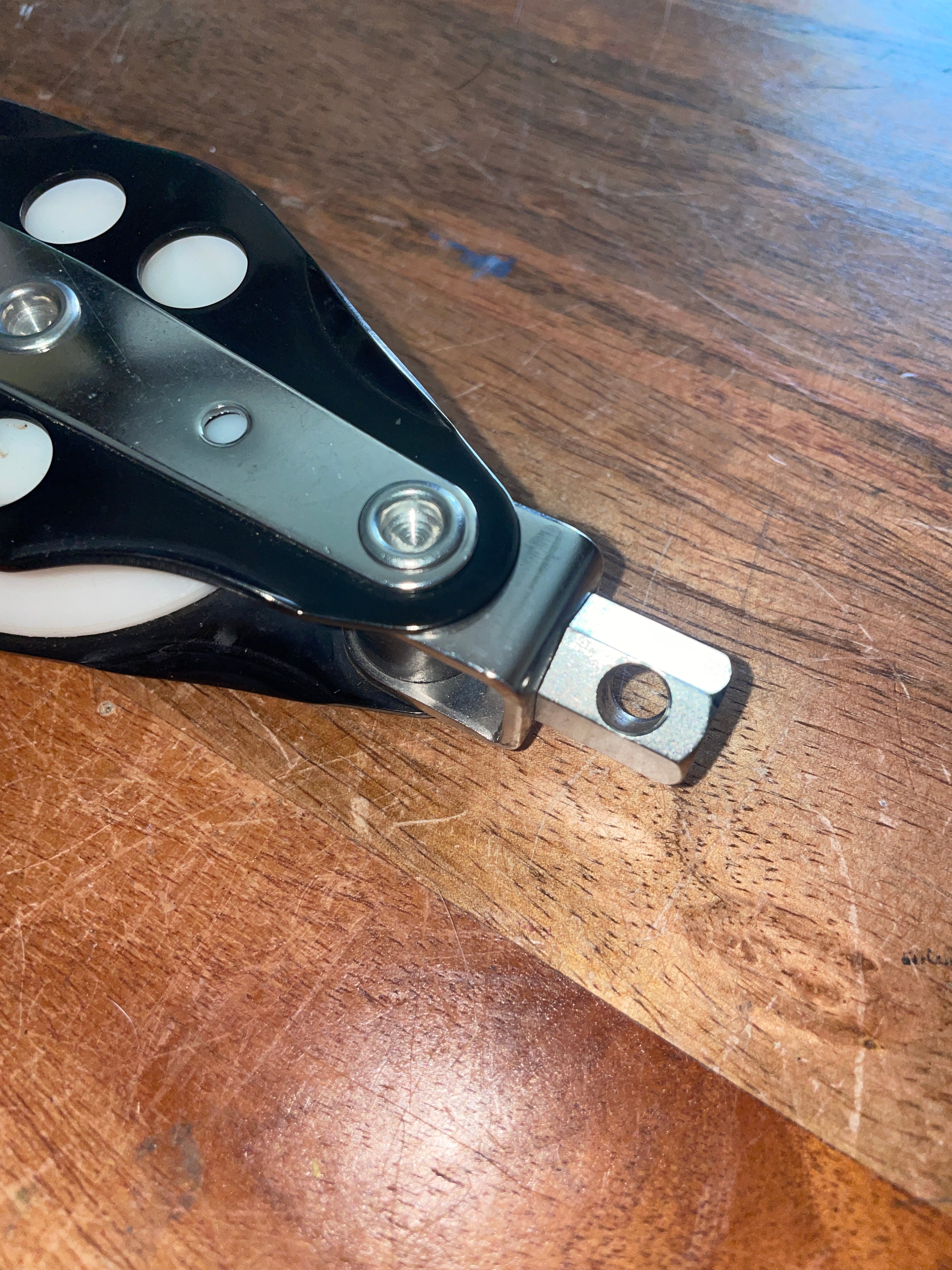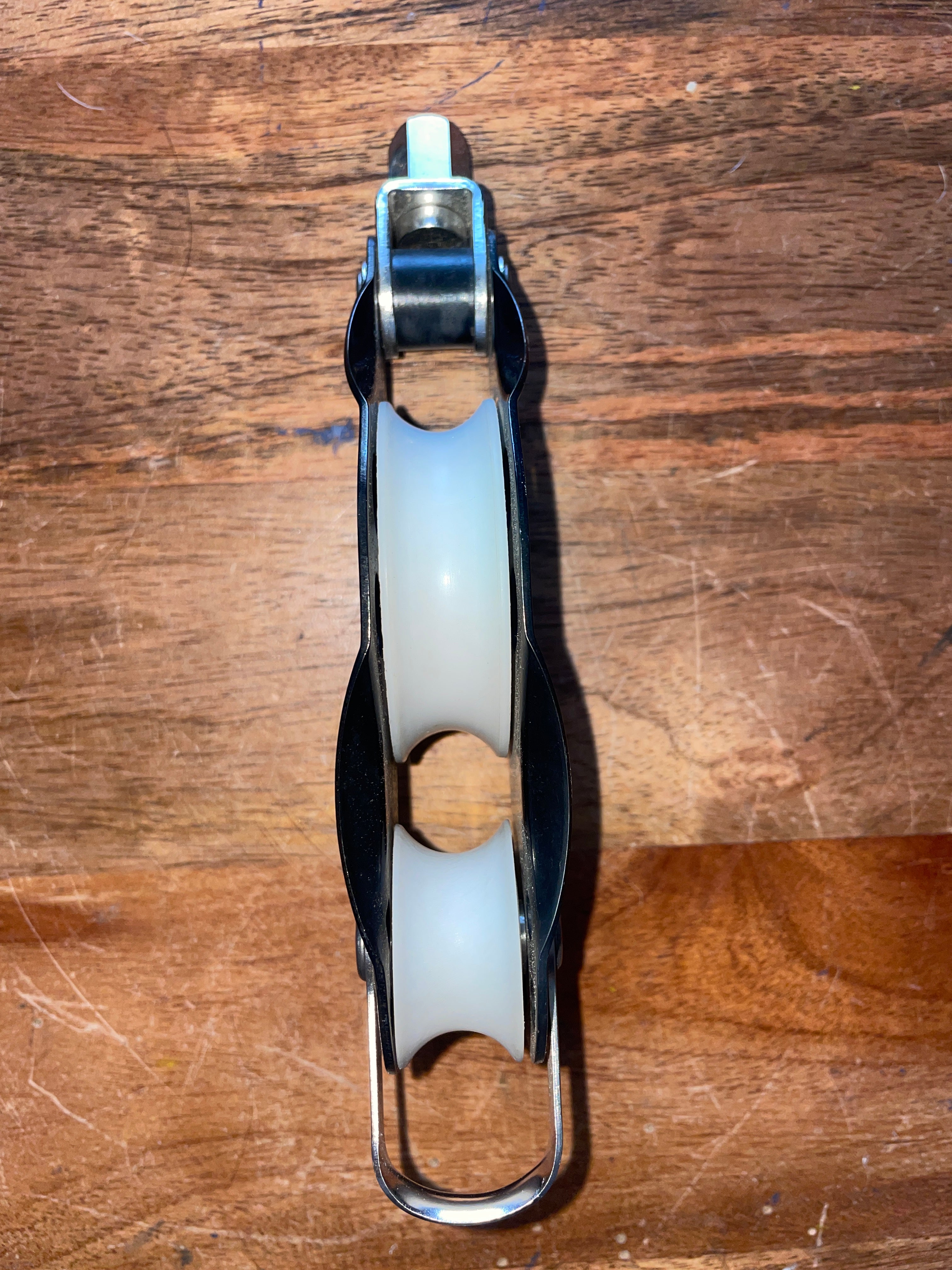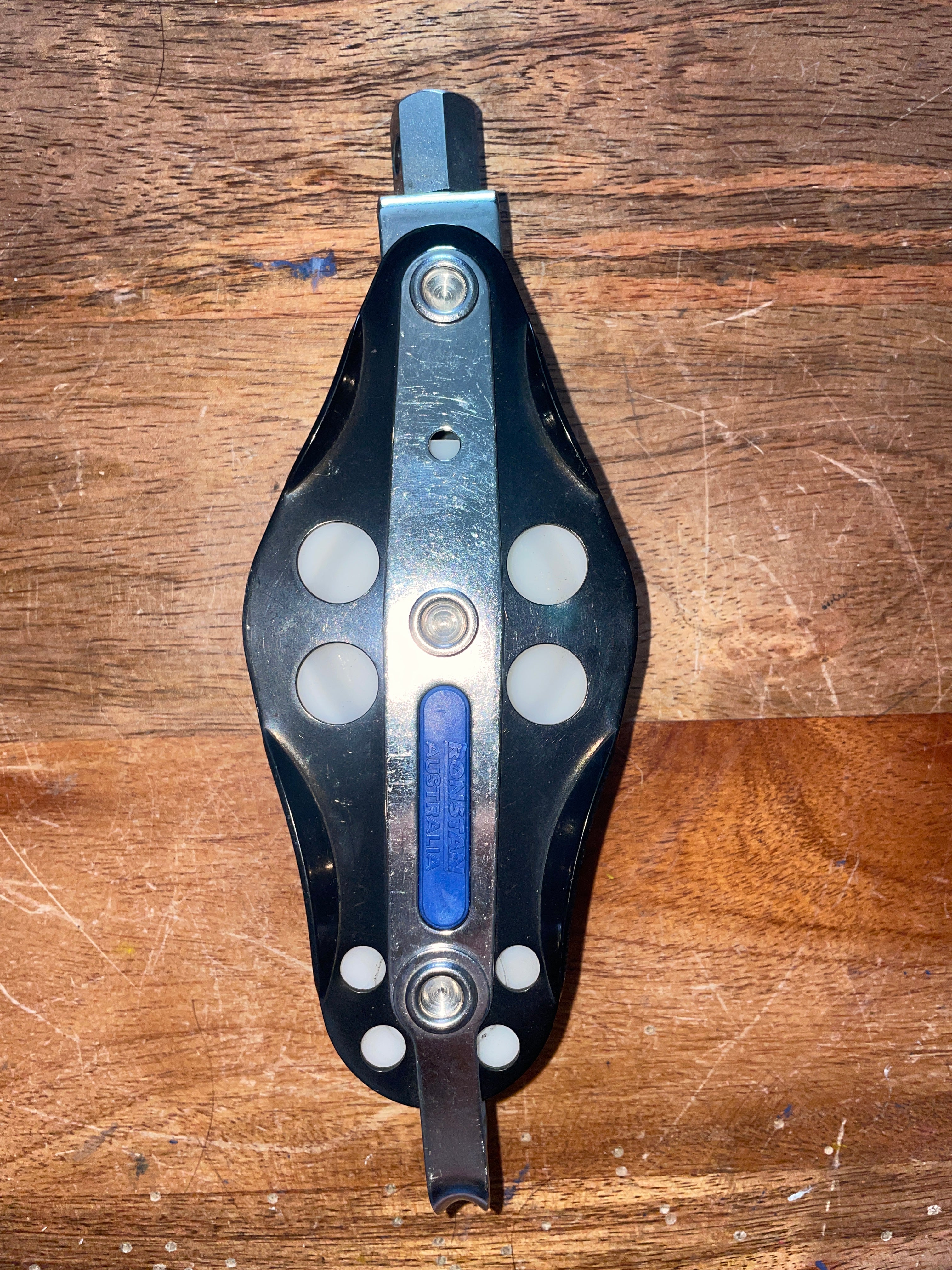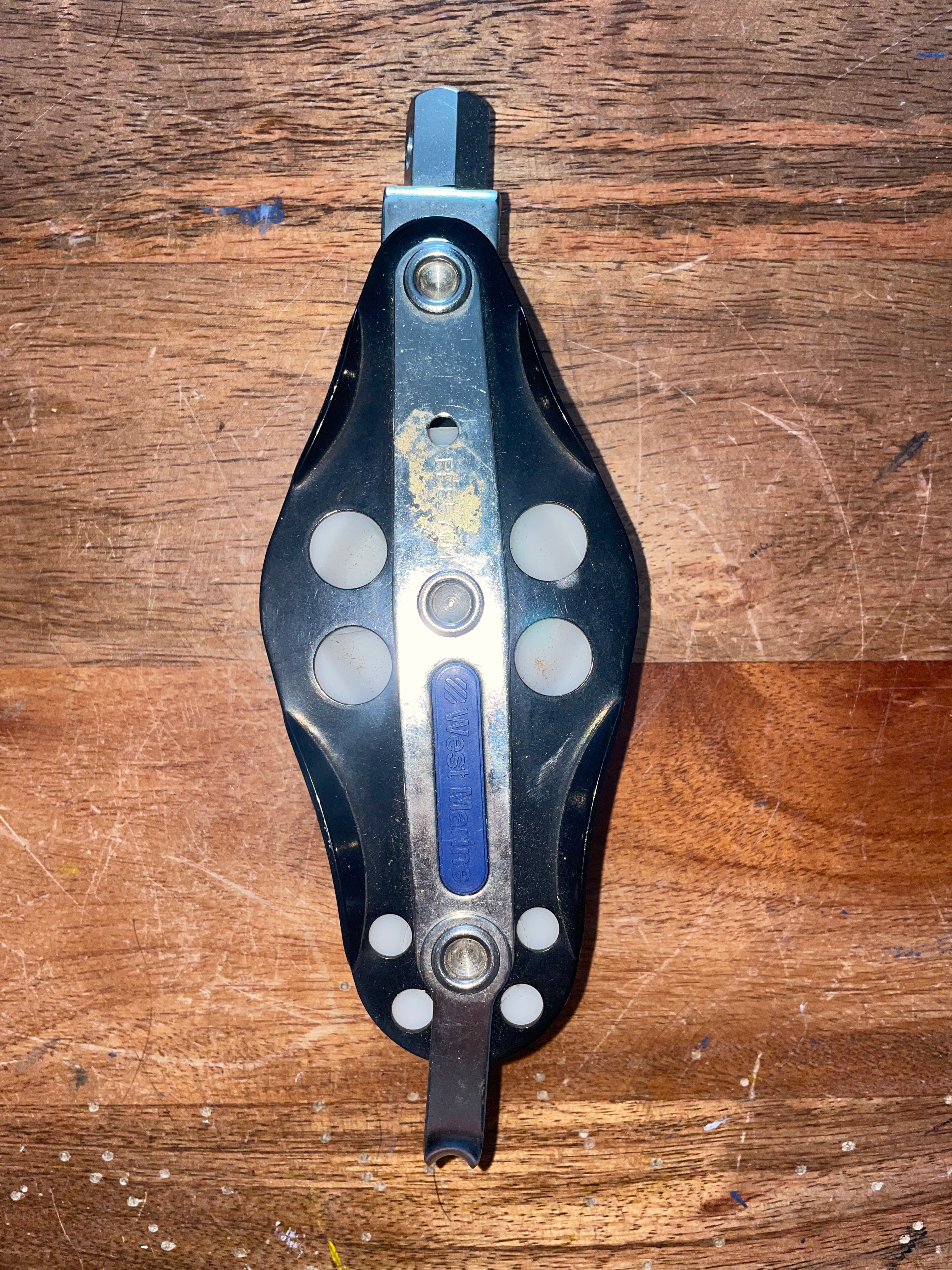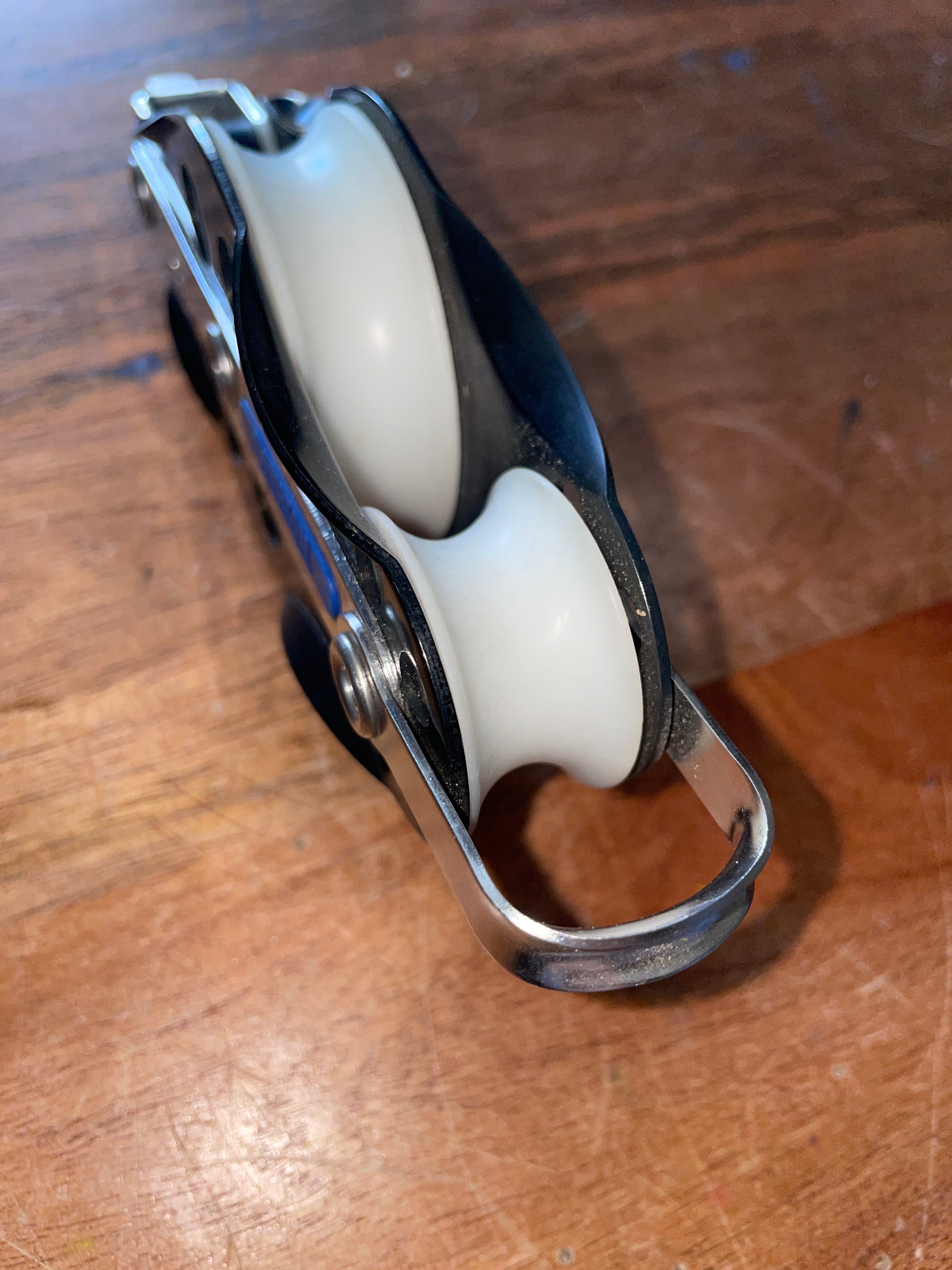 This west marine ronstan swivel fiddle block is in great condition. The metal body has very minor scratching. The sheaves look to be in like new condition, the larger sheave is 2 1/4” and the smaller is 1 1/2”. The sheaves fit MAX 1/2” line diameter. The swivel at the top to add a shackle, takes a 1/4” pin. Total length of this block is 7 1/4”.