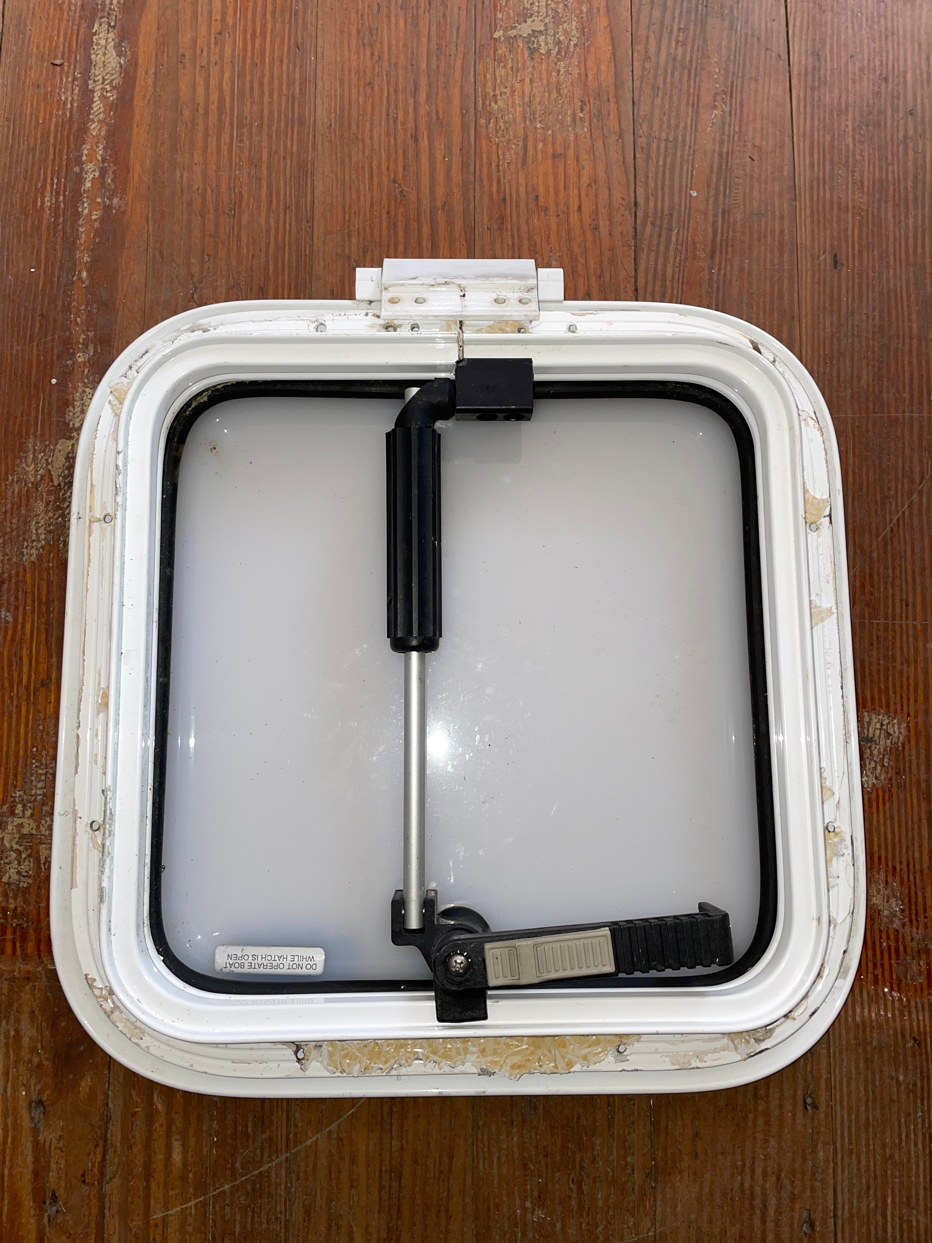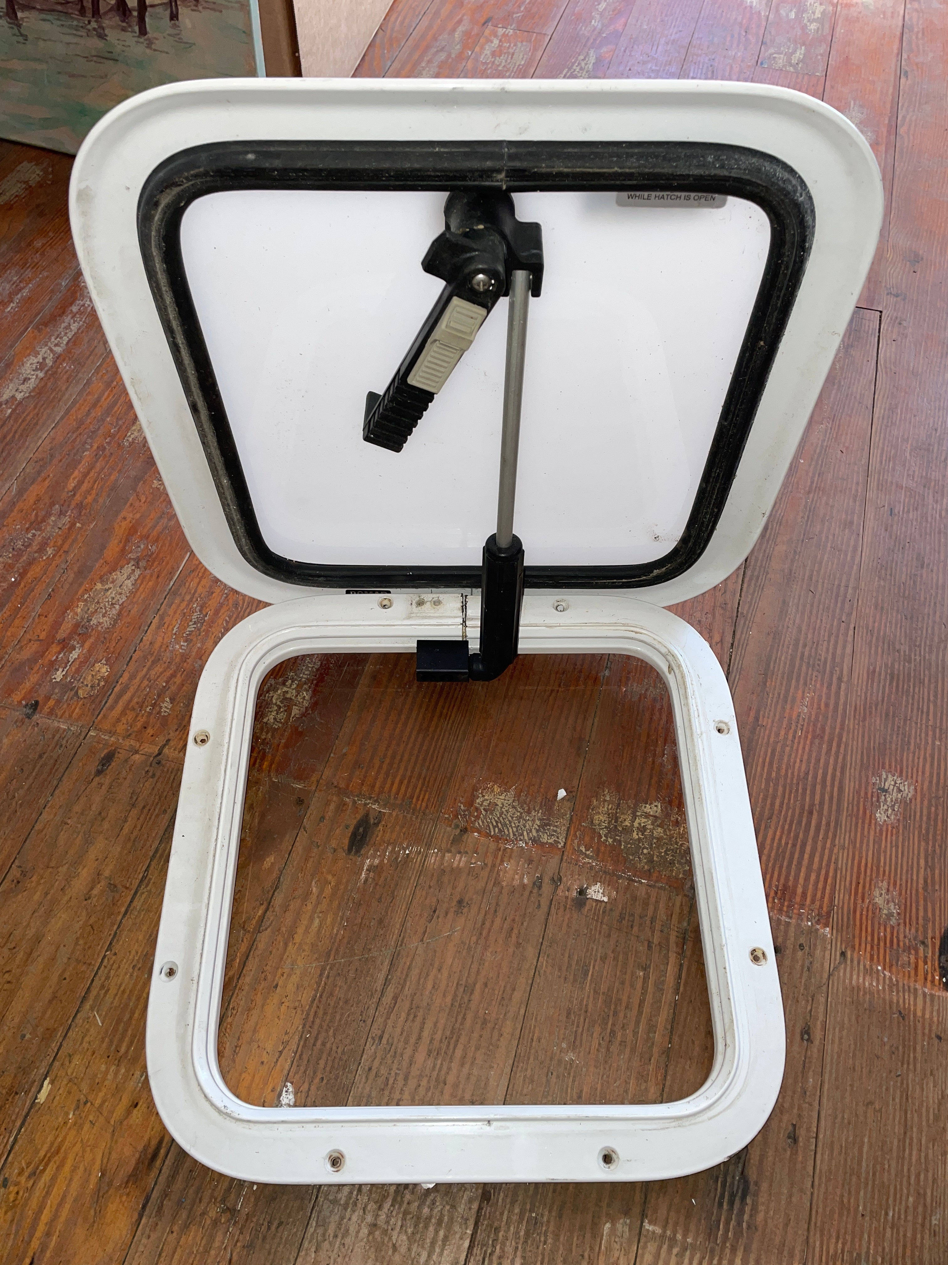 This white bomar opening hatch is in excellent condition. The hinge has come undone so just needs new bolts to keep it together. Opens freely. The hatch handle looks and moves as should. The ID of the hatch is 12” x 12”. The OD of the hatch is 13 1/2” x 13 1/2”.