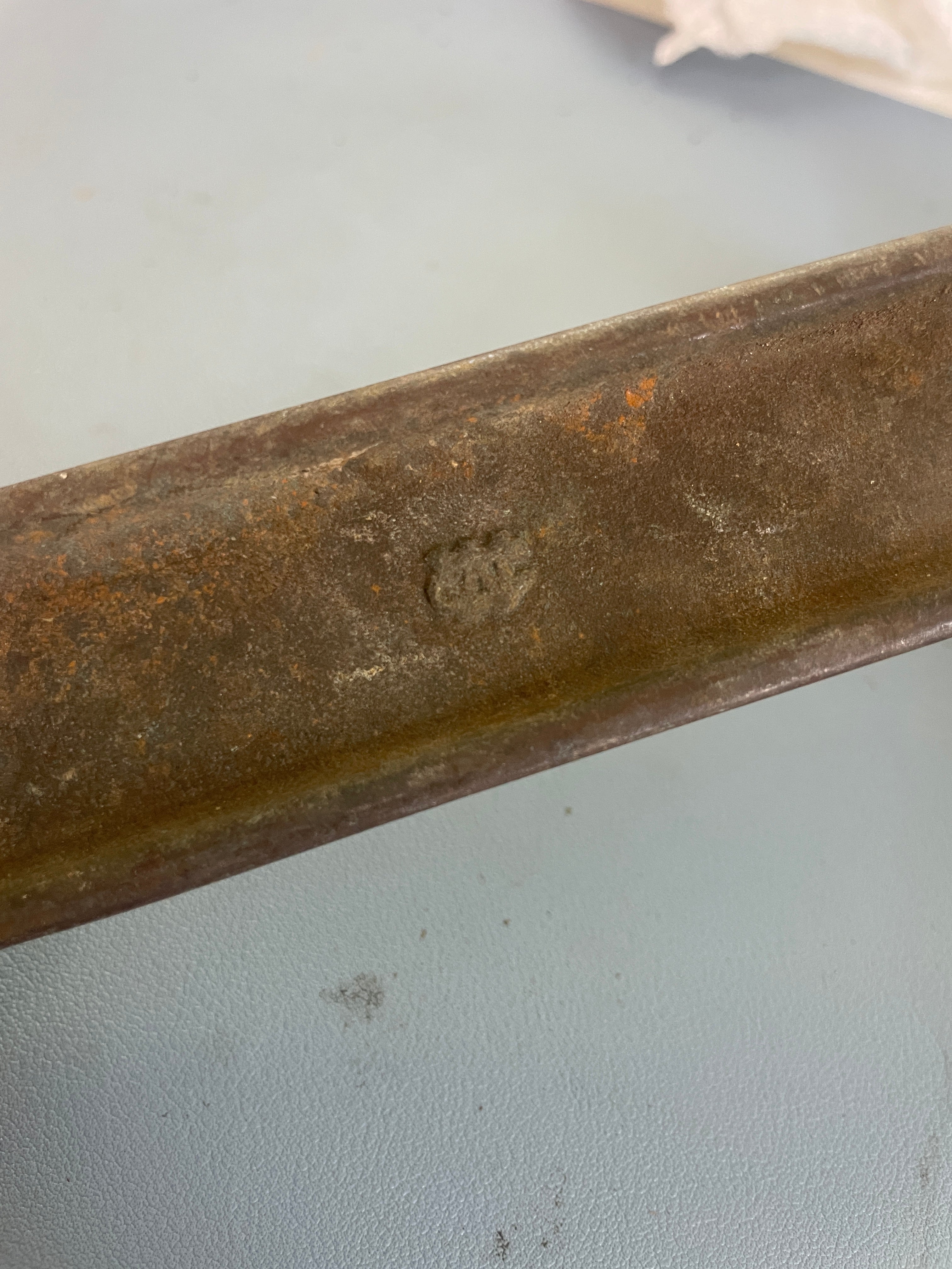 This WC solid bronze winch handle is in good condition. It is 11' total length. The insert is 1 3/8" wide x 3 1/2" long. Has a thinner wooden handle that is in good condition.